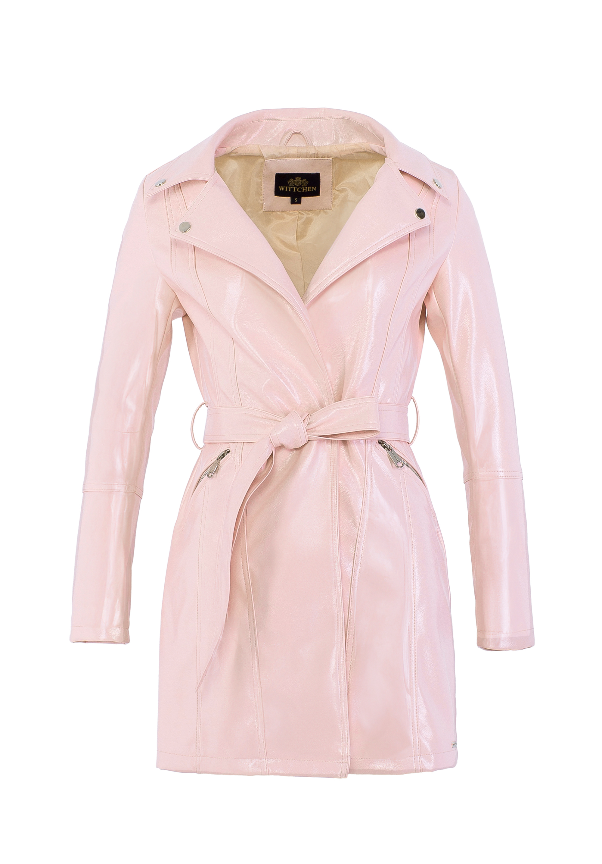 Metaliczne akcenty, perfekcyjny krój i ponadczasowy charakter – ten płaszcz z ekoskóry to absolutny must-have w Twojej garderobie! Model wiązany w talii paskiem doskonale podkreśla sylwetkę, a dwie praktyczne kieszenie na zamek to nie tylko funkcjonalny detal, ale także element, który nadaje płaszczowi nowoczesny design. Subtelne metalowe logo producenta na boku wprowadzają stylowy akcent, dopełniając całość. To płaszcz, który wyraża pewność siebie i siłę charakteru – idealny wybór dla kobiet, które wiedzą, czego chcą!