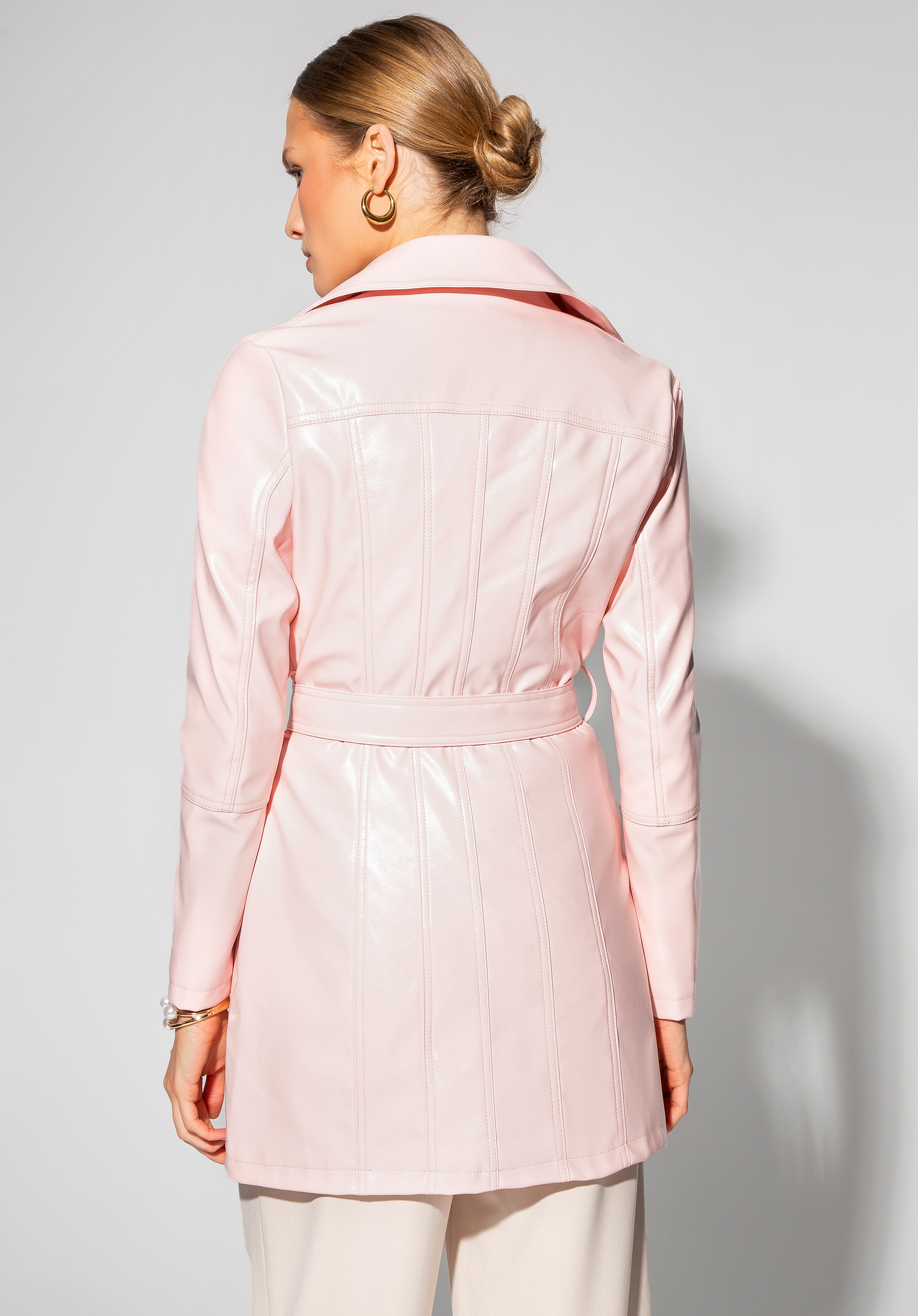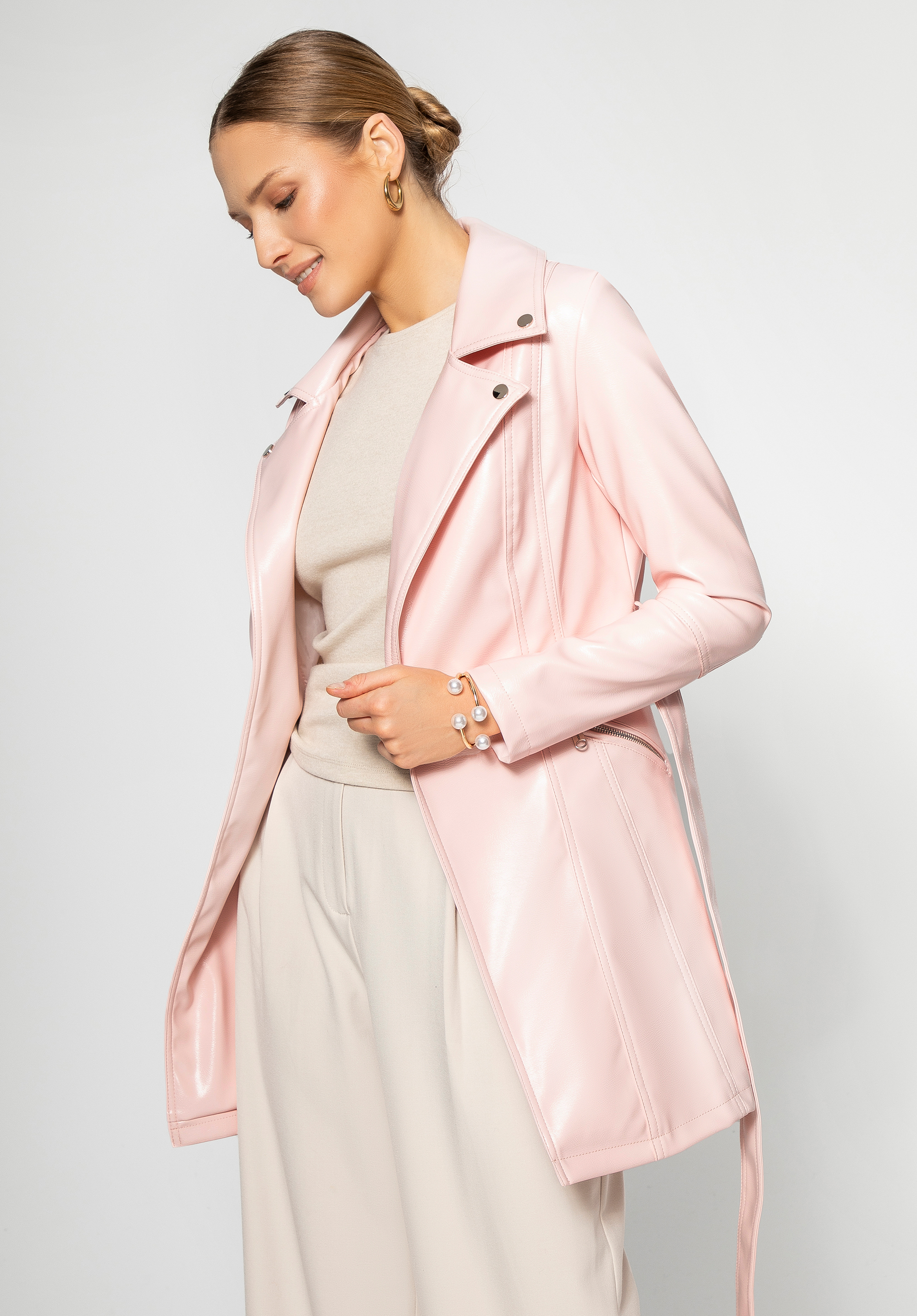 - Materiał: Ekoskóra, z której wykonano płaszcz, jest elegancka i odporna na zabrudzenia, co zapewnia długotrwałość produktu.