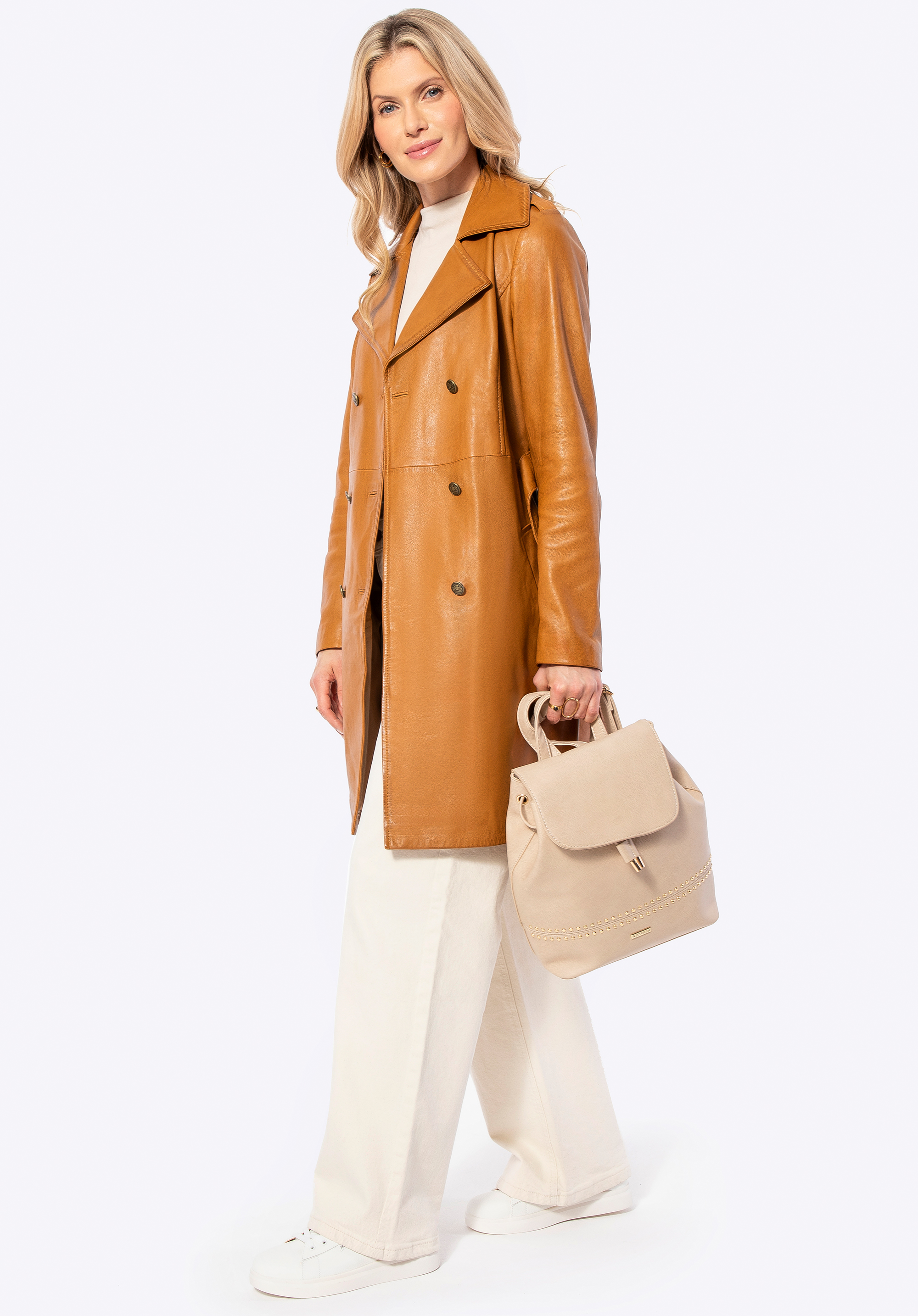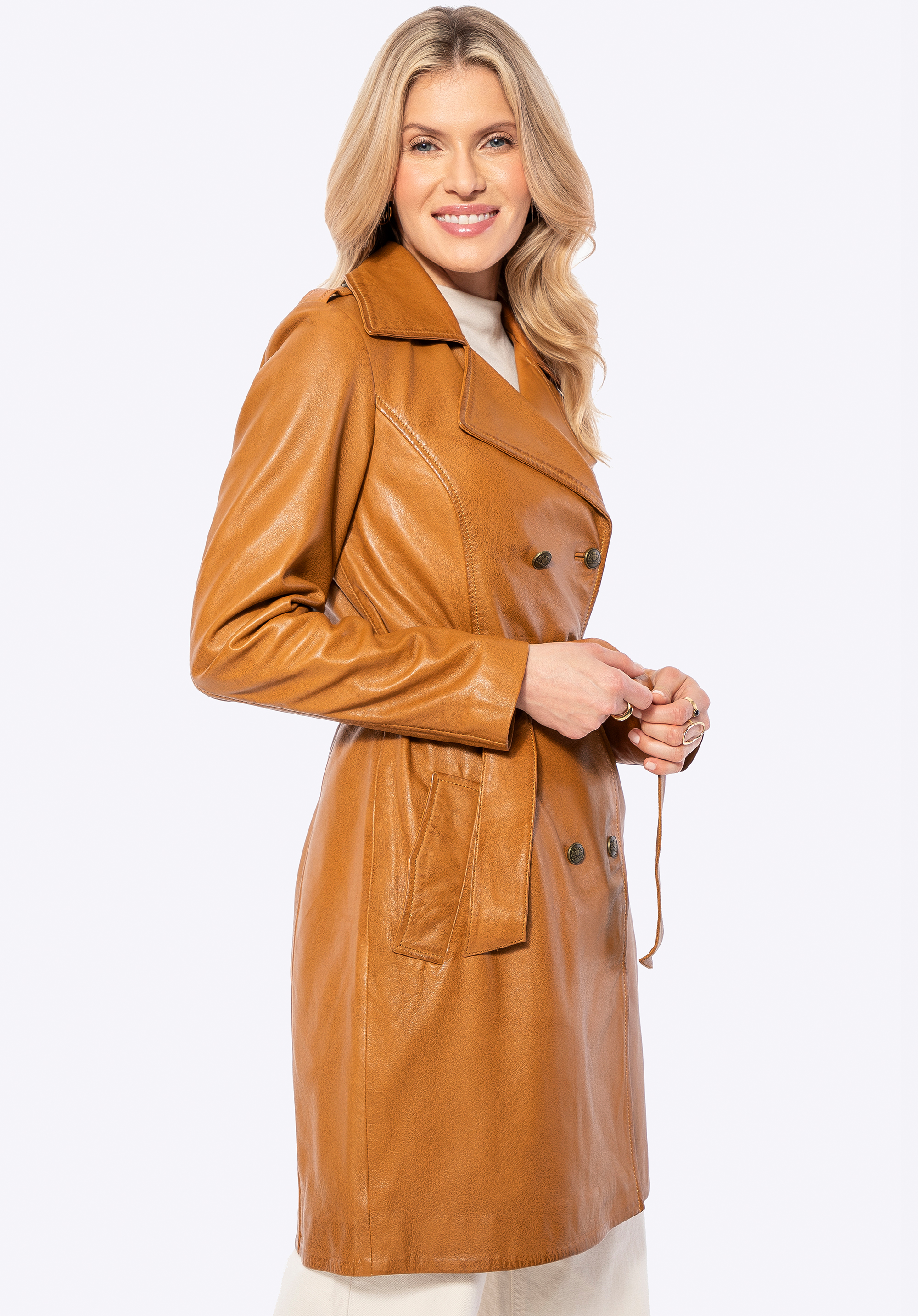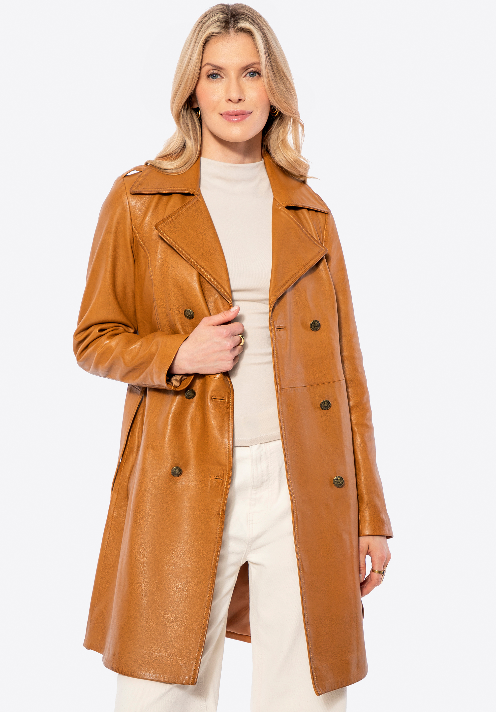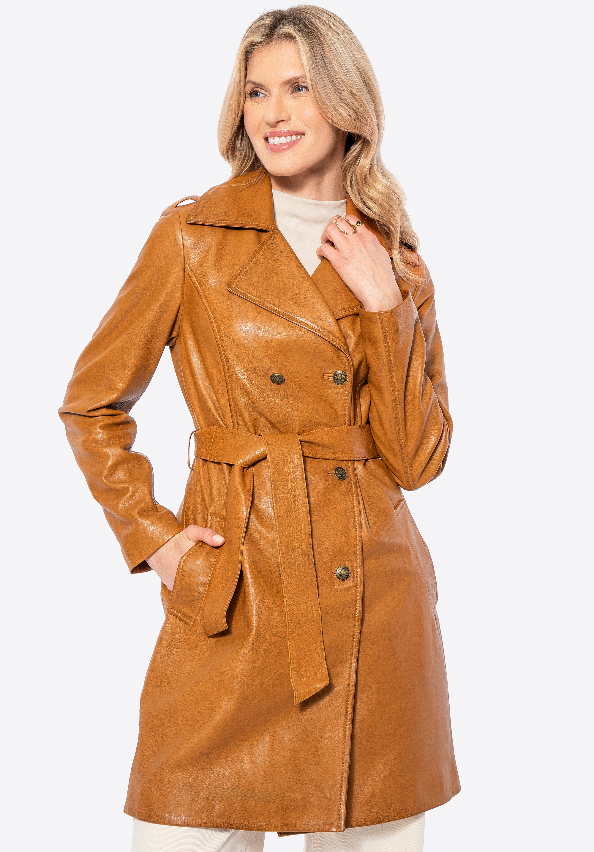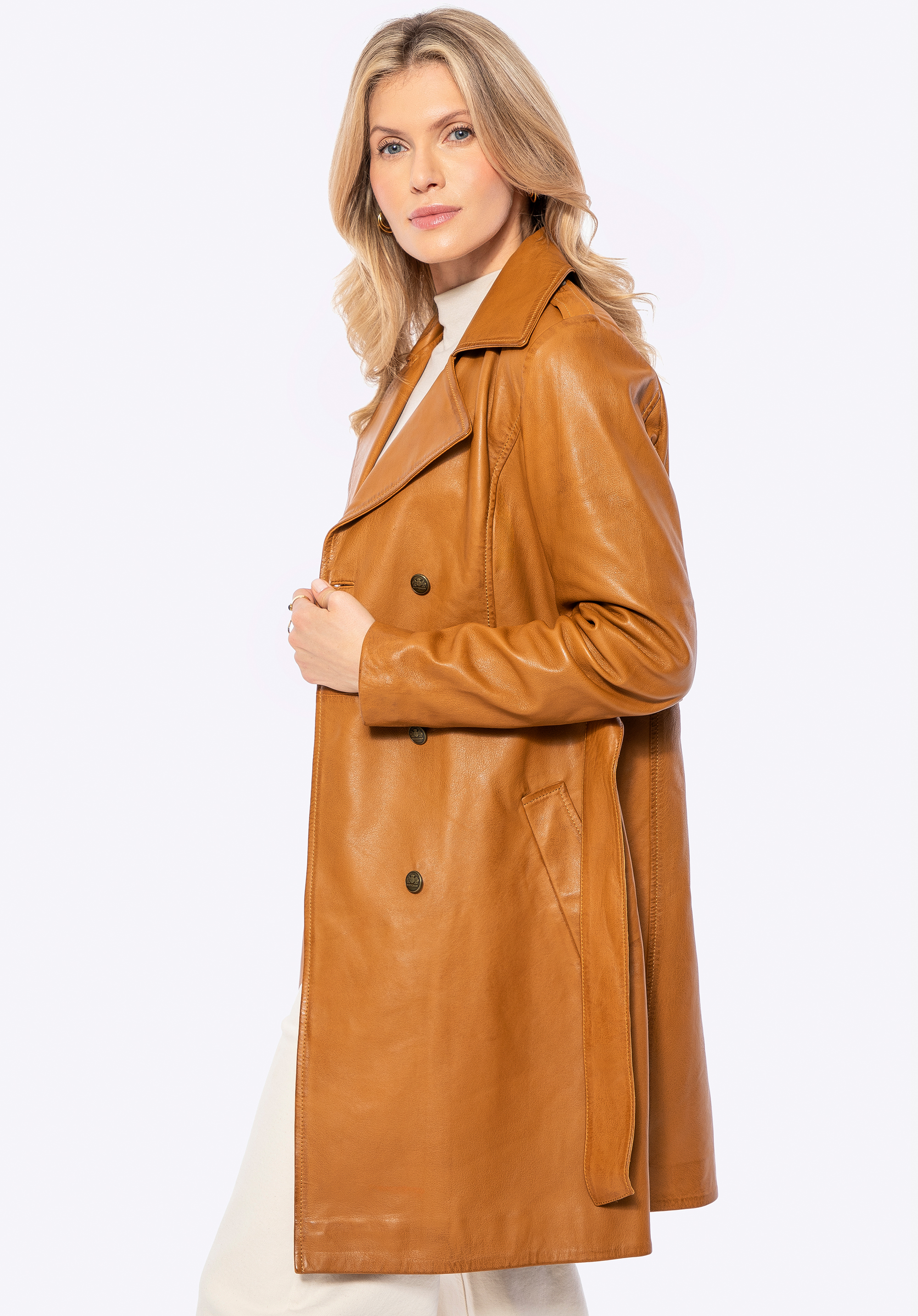 Damski płaszcz ze skóry owczej sprawdzi się w chłodniejsze dni, gdy chcesz wyglądać nienagannie w drodze do pracy i równie pewnie podczas wieczornych wyjść. Miękka skóra naturalna, taliowany krój z paskiem oraz dwurzędowe, logowane guziki budują elegancką sylwetkę i zapewniają komfort noszenia przez wiele sezonów.