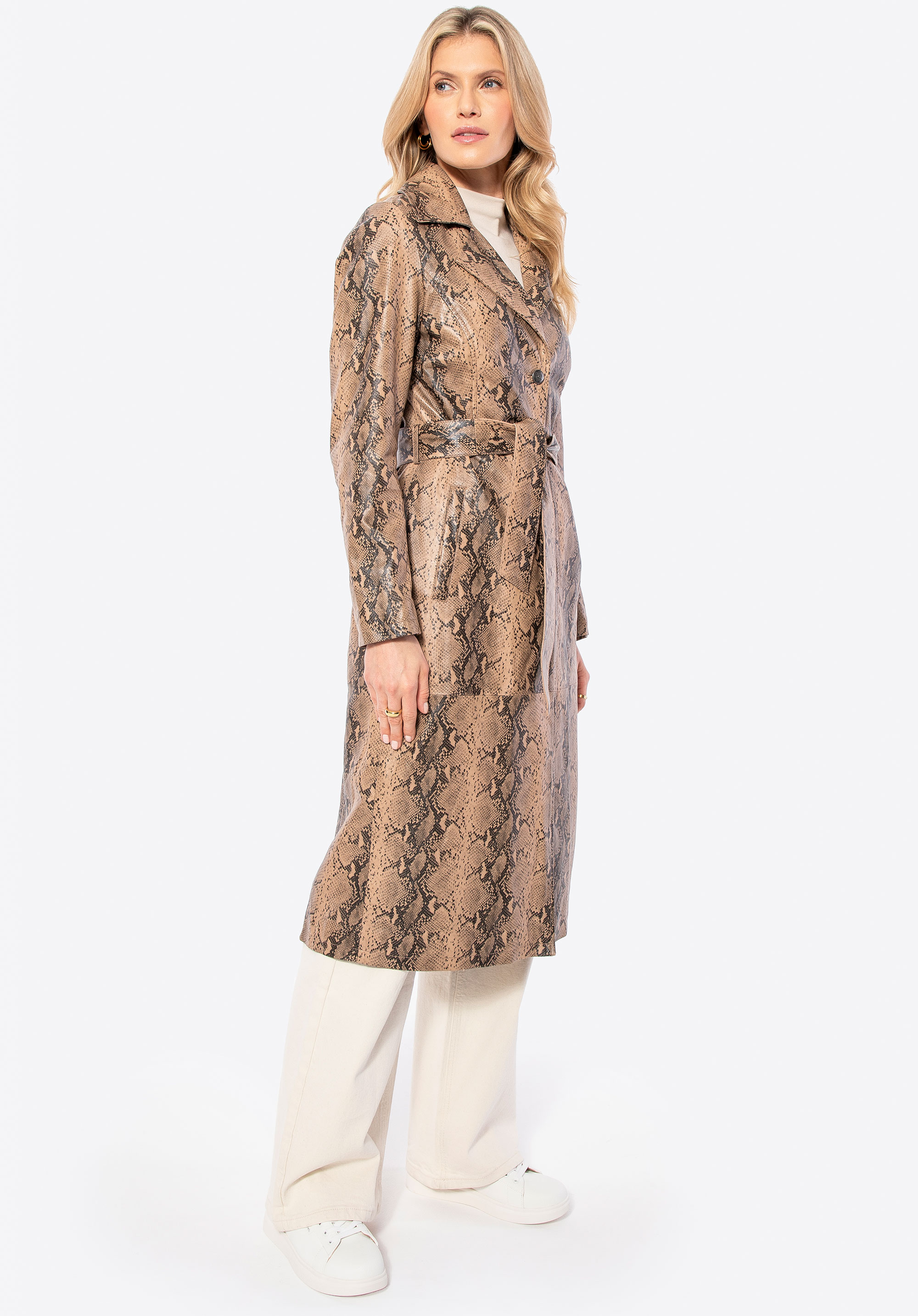 Wprowadź do swojej garderoby płaszcz, który łączy w sobie klasykę z nutą drapieżnego charakteru – model wykonany ze skóry owczej w modny wzór węża. Jego wyjątkowy wygląd przyciąga uwagę, a subtelny, ale efektowny krój doskonale podkreśla sylwetkę. Zapinany na sygnowane guziki, płaszcz zyskuje elegancki akcent, który sprawia, że każda stylizacja nabiera wyjątkowego charakteru.