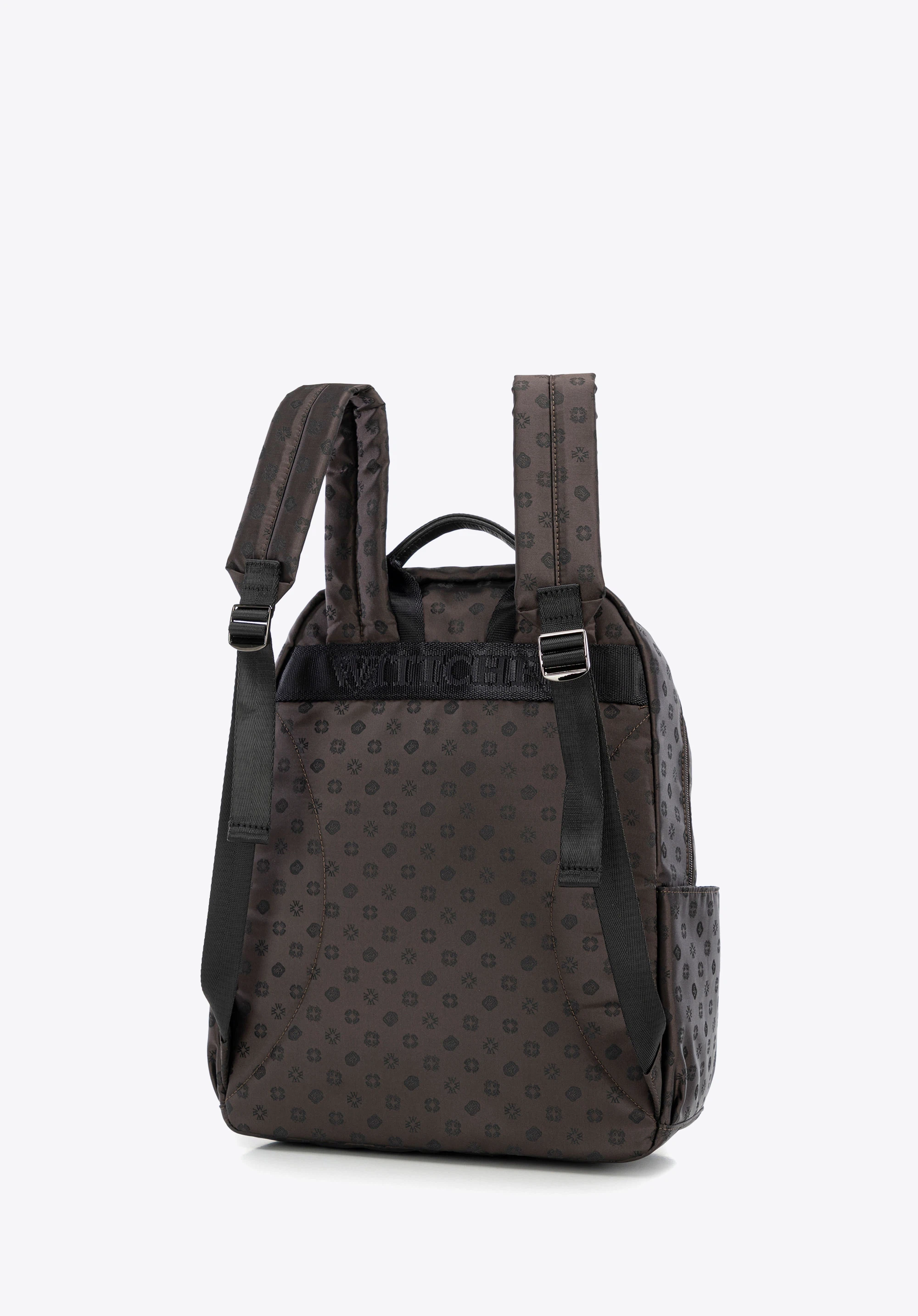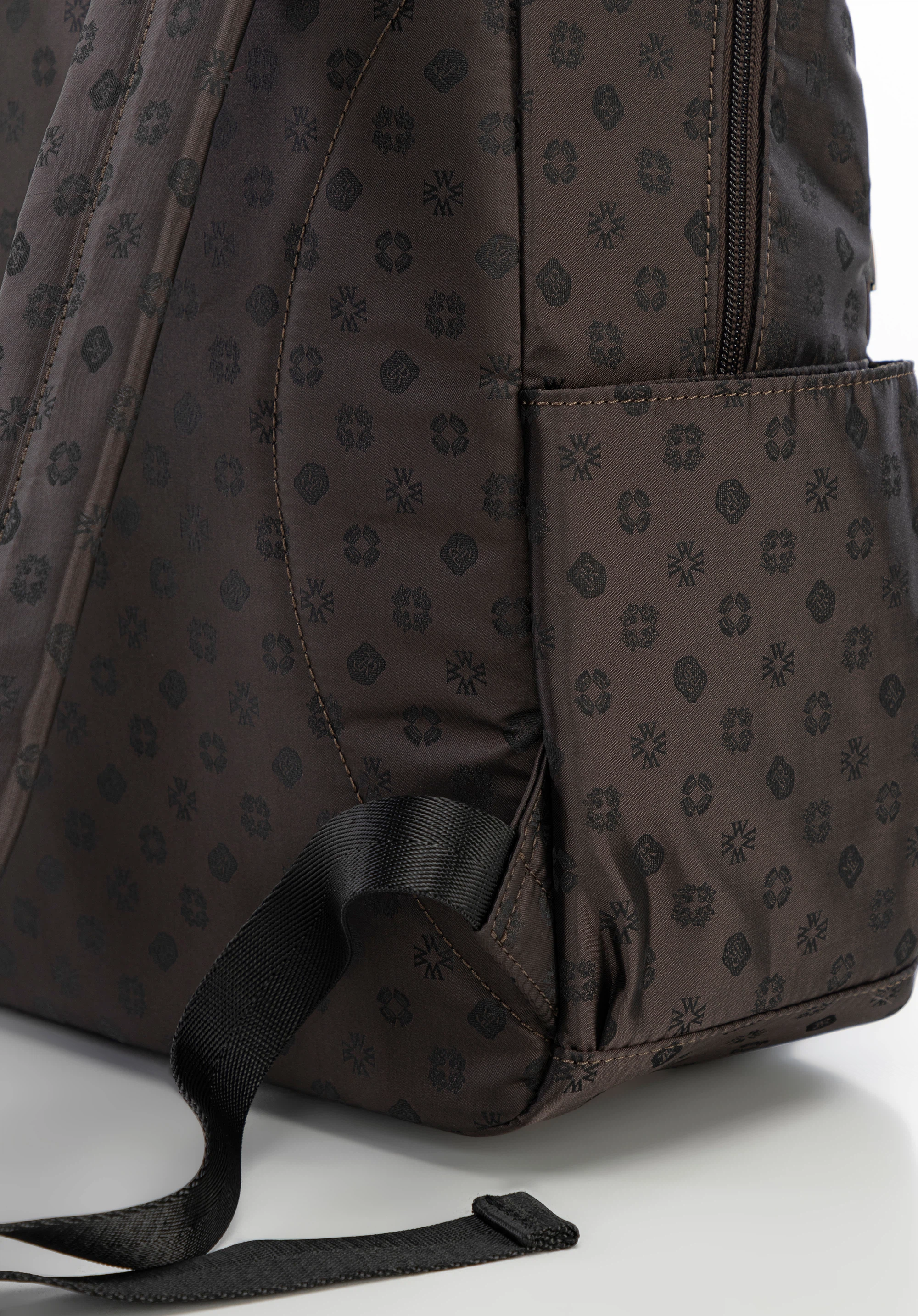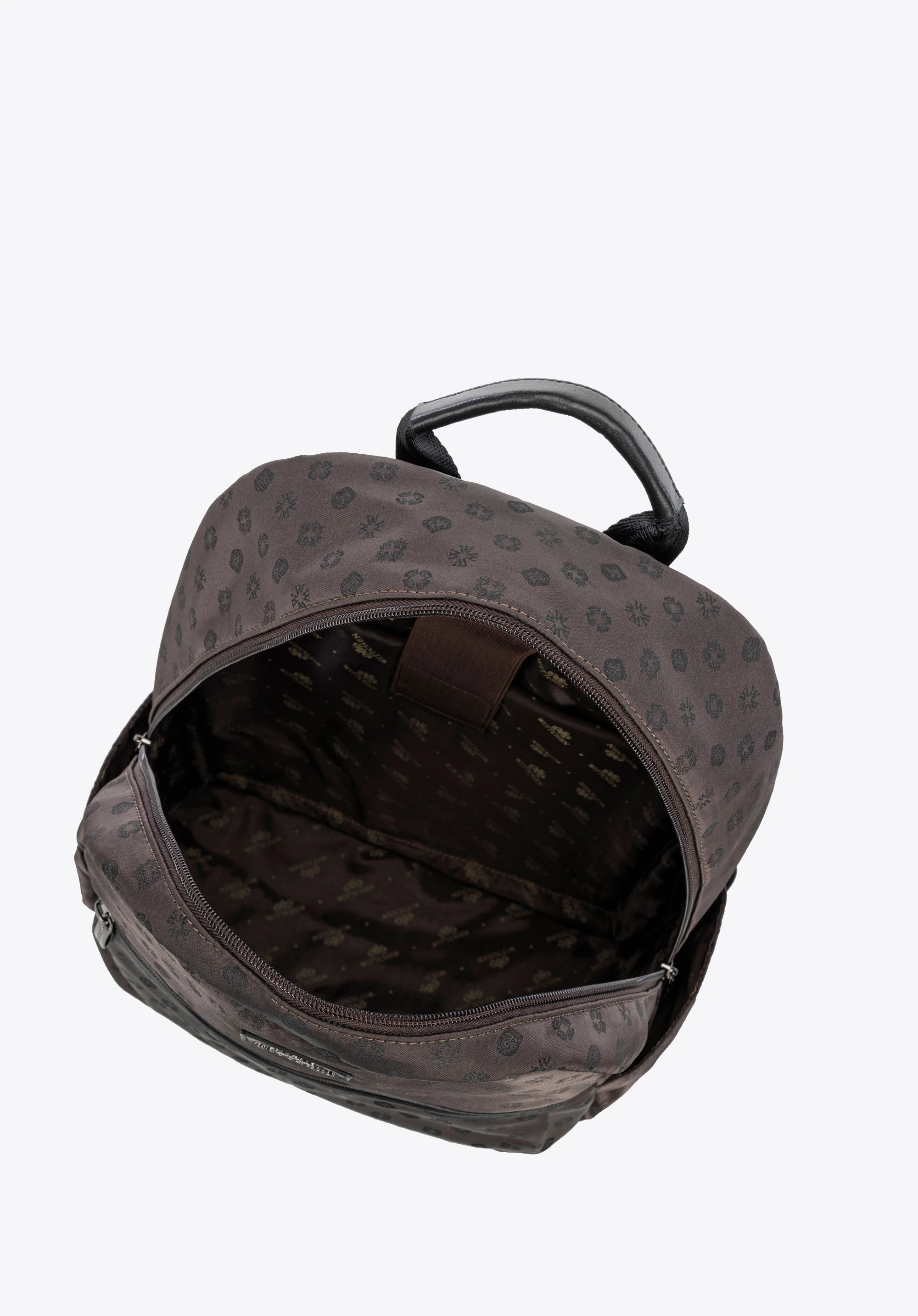Ten plecak to bez wątpienia przyjaciel codziennych wyzwań każdej współczesnej kobiety, który łączy w sobie elegancję i funkcjonalność. Luksusowy, subtelnie połyskujący materiał, z wytłoczonym monogramem marki nada każdej stylizacji wyrafinowany charakter. Naturalne skórzane akcenty — od wytrzymałego uchwytu po wykończenia — przyciągają oko i świadczą o kunszcie wykonania.