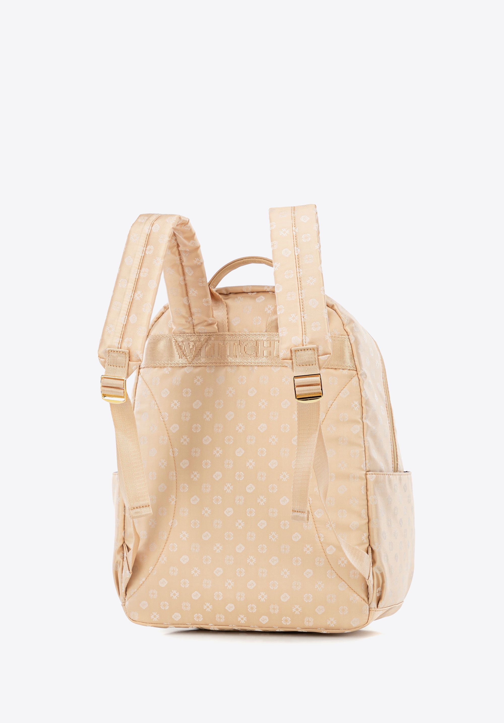 Ten plecak to bez wątpienia przyjaciel codziennych wyzwań każdej współczesnej kobiety, który łączy w sobie elegancję i funkcjonalność. Luksusowy, subtelnie połyskujący materiał, z wytłoczonym monogramem marki nada każdej stylizacji wyrafinowany charakter. Naturalne skórzane akcenty — od wytrzymałego uchwytu po wykończenia — przyciągają oko i świadczą o kunszcie wykonania.