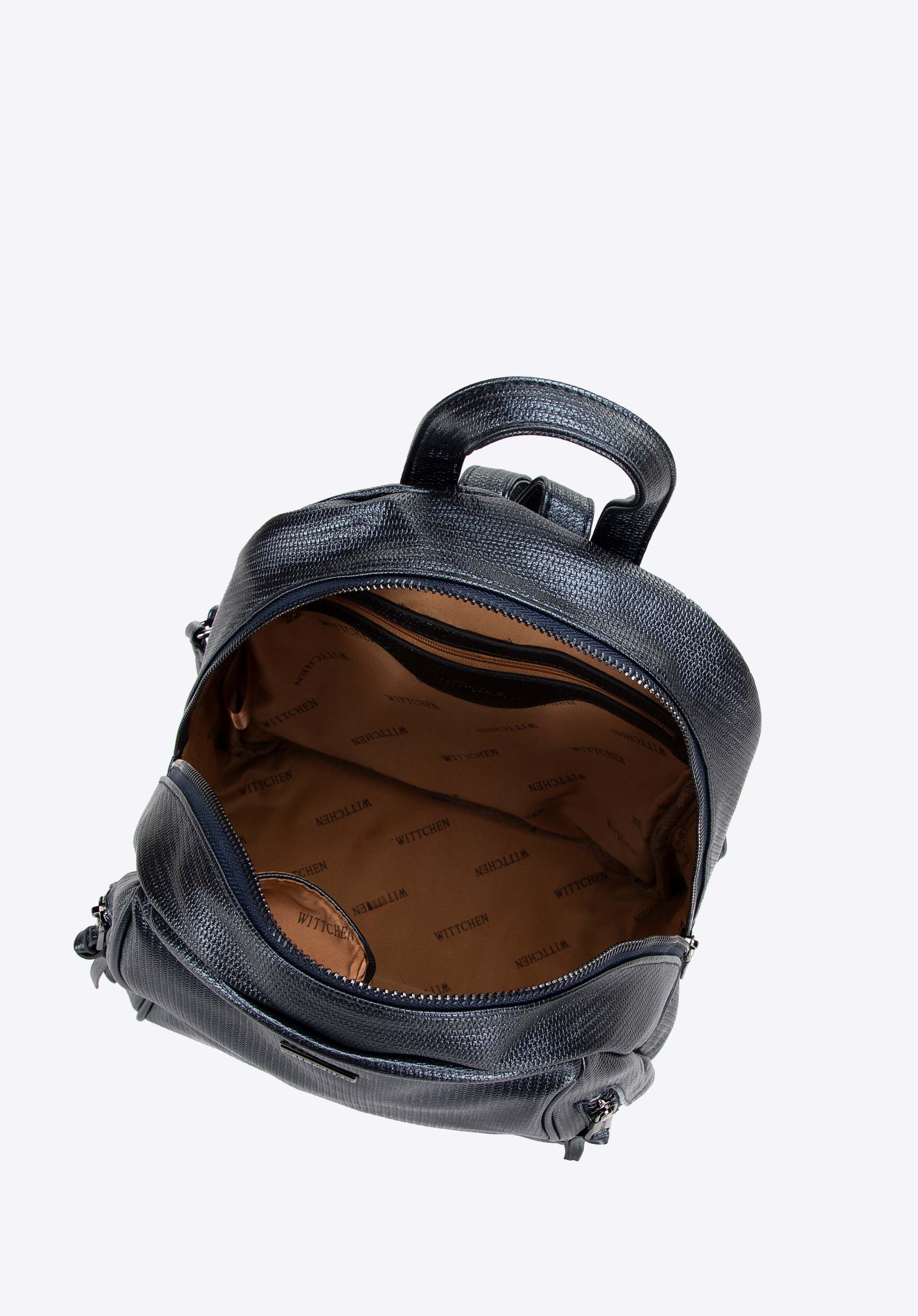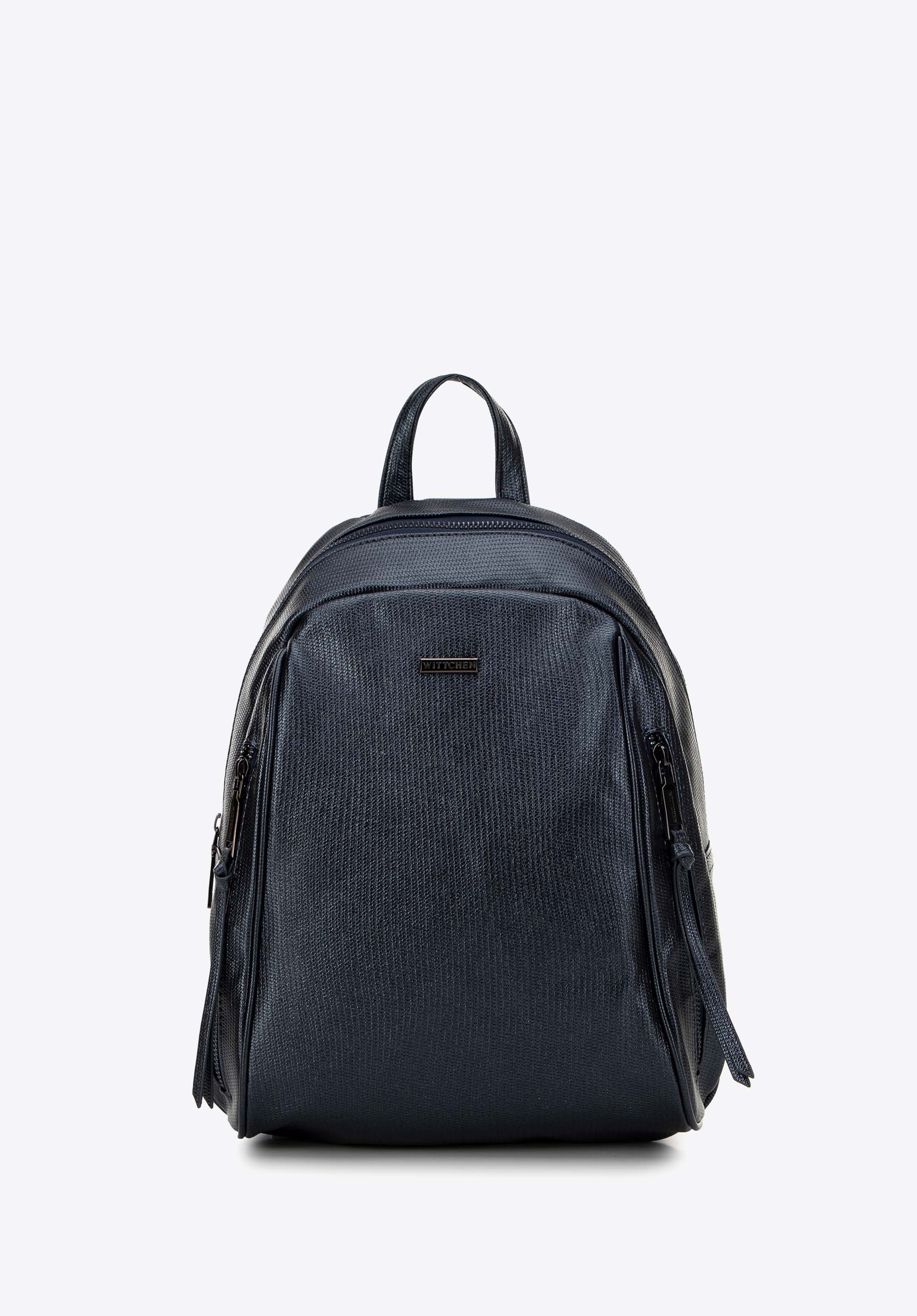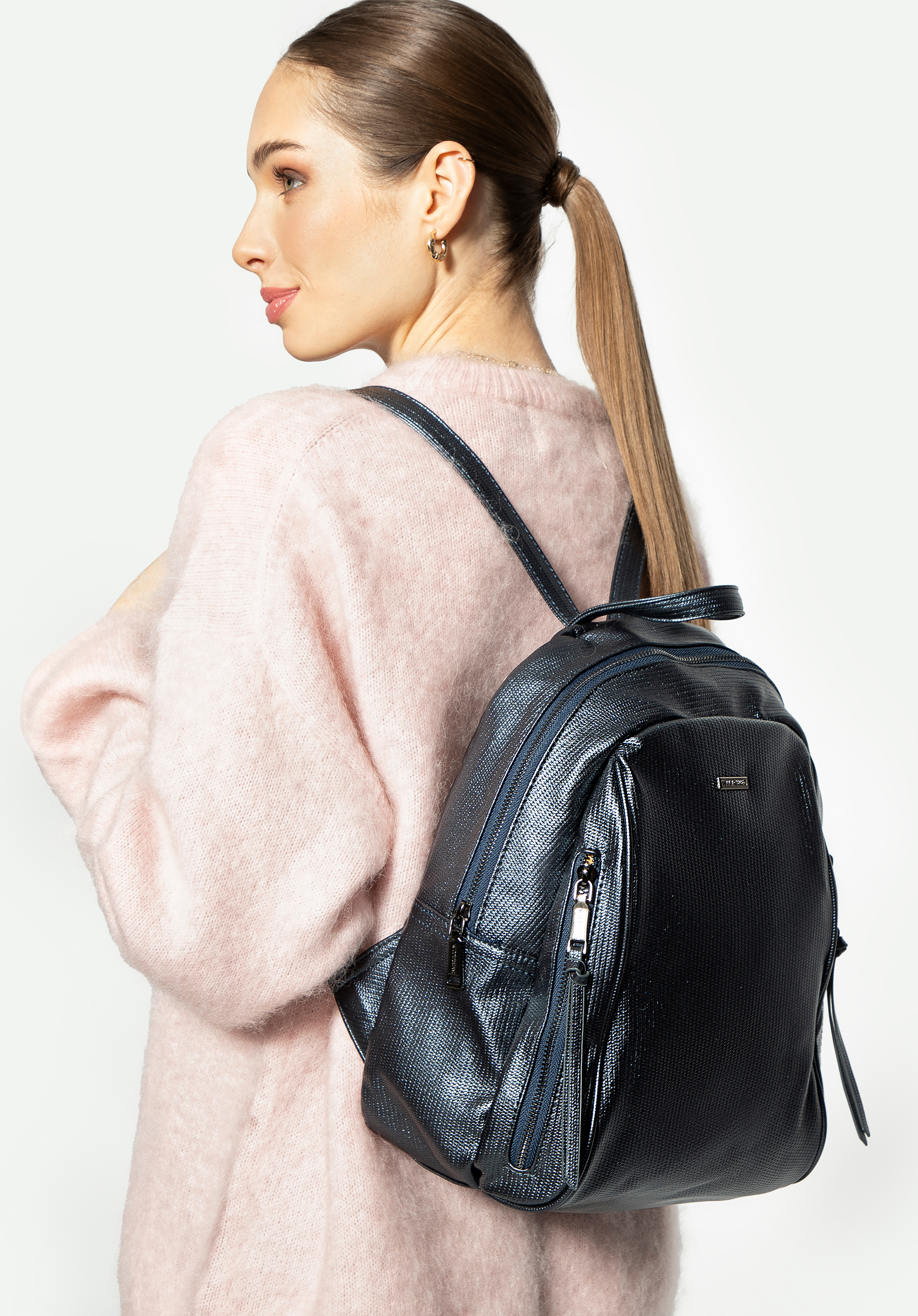 Ten elegancki damski plecak jest połączeniem nowoczesnego designu z funkcjonalnością. Plecak wykonany ze skóry ekologicznej, o połyskującej fakturze, łączy w sobie wszystkie najlepsze cechy. Jednokomorowe wnętrze torebki zapewnia przestronną przestrzeń do przechowywania wszystkich niezbędnych przedmiotów, a wewnętrzne kieszenie: dwie otwarte oraz jedna na zamek błyskawiczny, ułatwiają organizację i zapewniają łatwy dostęp drobiazgów. Dwie boczne kieszenie z pionowymi suwakami oraz chwostami dodatkowo zwiększają możliwości przechowywania drobnych przedmiotów. Zorganizowana przestrzeń plecaka sprawia, że jest on idealnym wyborem na każdy intensywny dzień.
