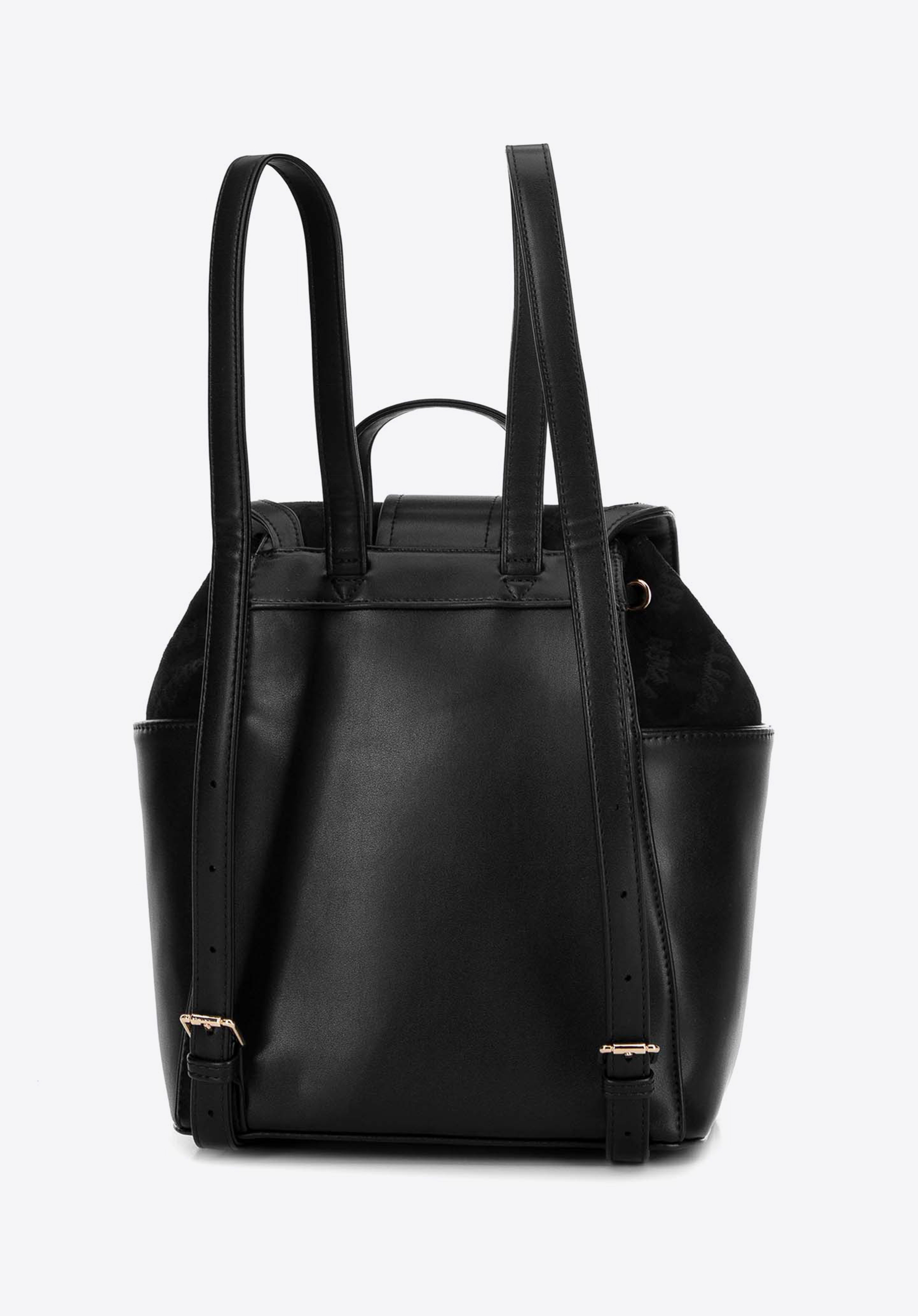 Elegancki plecak łączy modny design z maksymalną funkcjonalnością. Wykonany z ekoskóry z materiałową wstawką o zamszowej fakturze i zdobiony subtelnym logo, jest idealną propozycją dla kobiet ceniących modę i wygodę. Wyposażony w regulowane szelki, zapewnia komfort noszenia, a jego kształt przypomina stylowy worek zamykany na elegancką klapę. Dodatkowa praktyczna kieszeń z boku to wygodne rozwiązanie podczas aktywnych dni.
