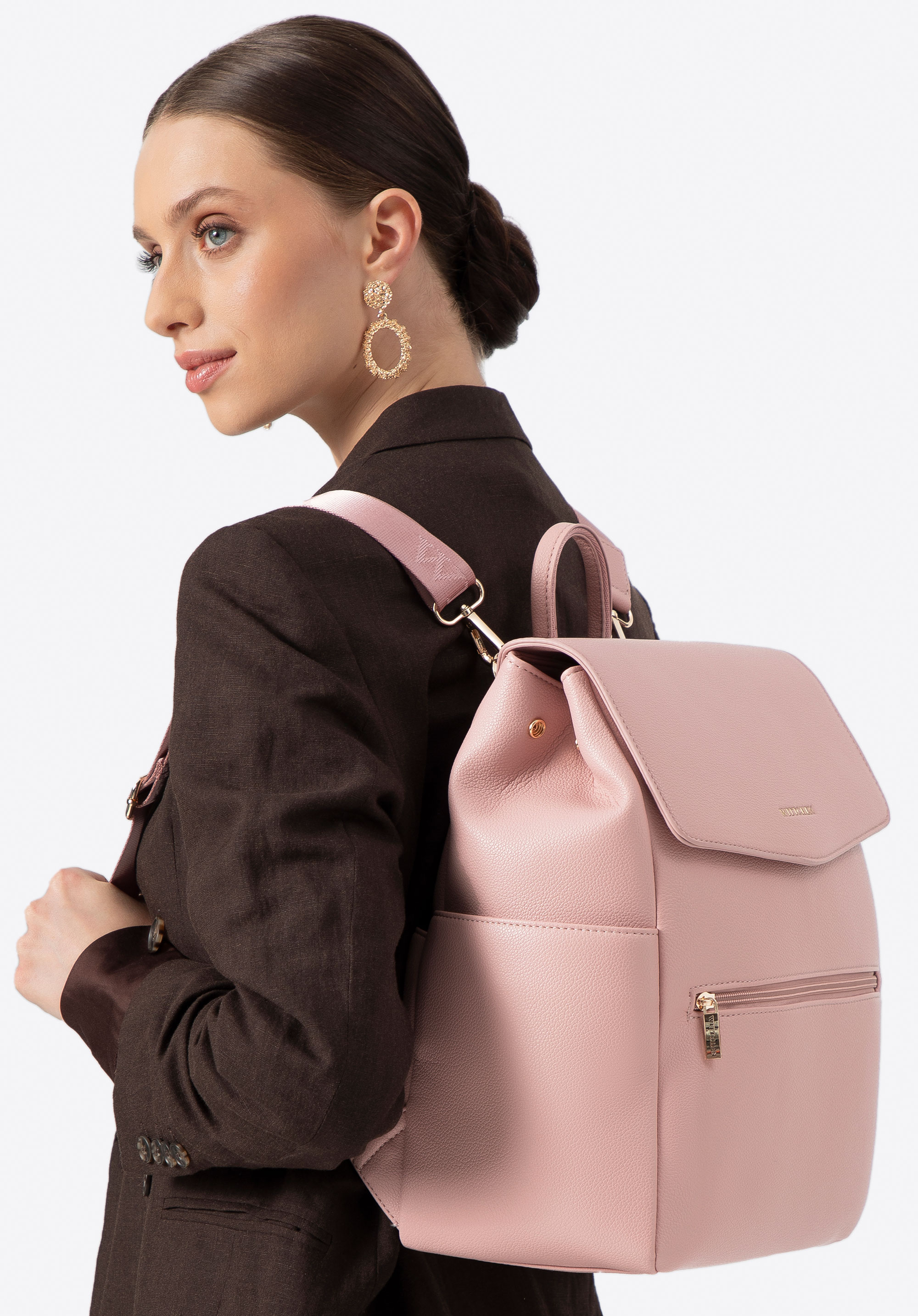 Ten damski plecak łączy elegancję z funkcjonalnością. Wykonany z ekoskóry, zapinany na klapę z magnetycznym zapięciem, łączy klasykę z nowoczesnością. Wewnątrz znajduje się dwukomorowa przestrzeń z kieszenią na suwak, otwartymi kieszonkami oraz przegrodą na laptopa (do 23 × 24 cm, 13”). Regulowane szelki, uchwyt do noszenia w dłoni oraz boczne zatrzaski umożliwiają dopasowanie plecaka do indywidualnych potrzeb.