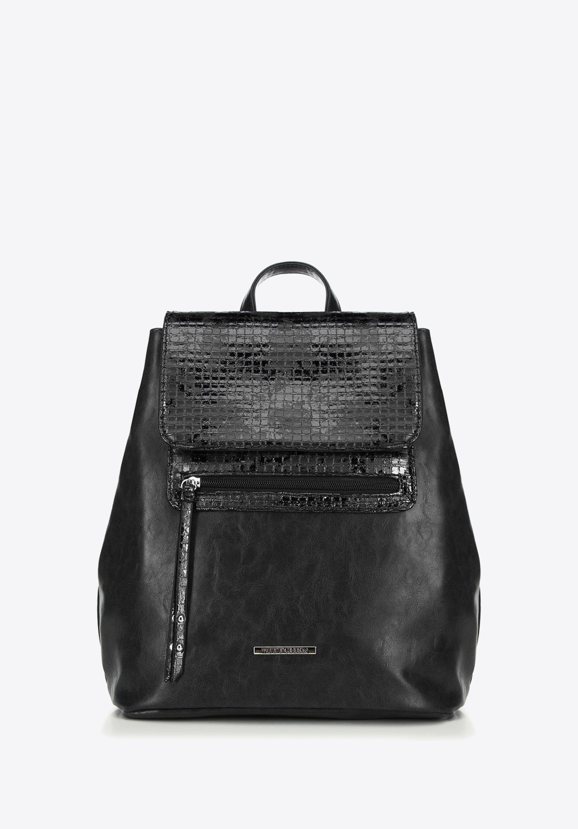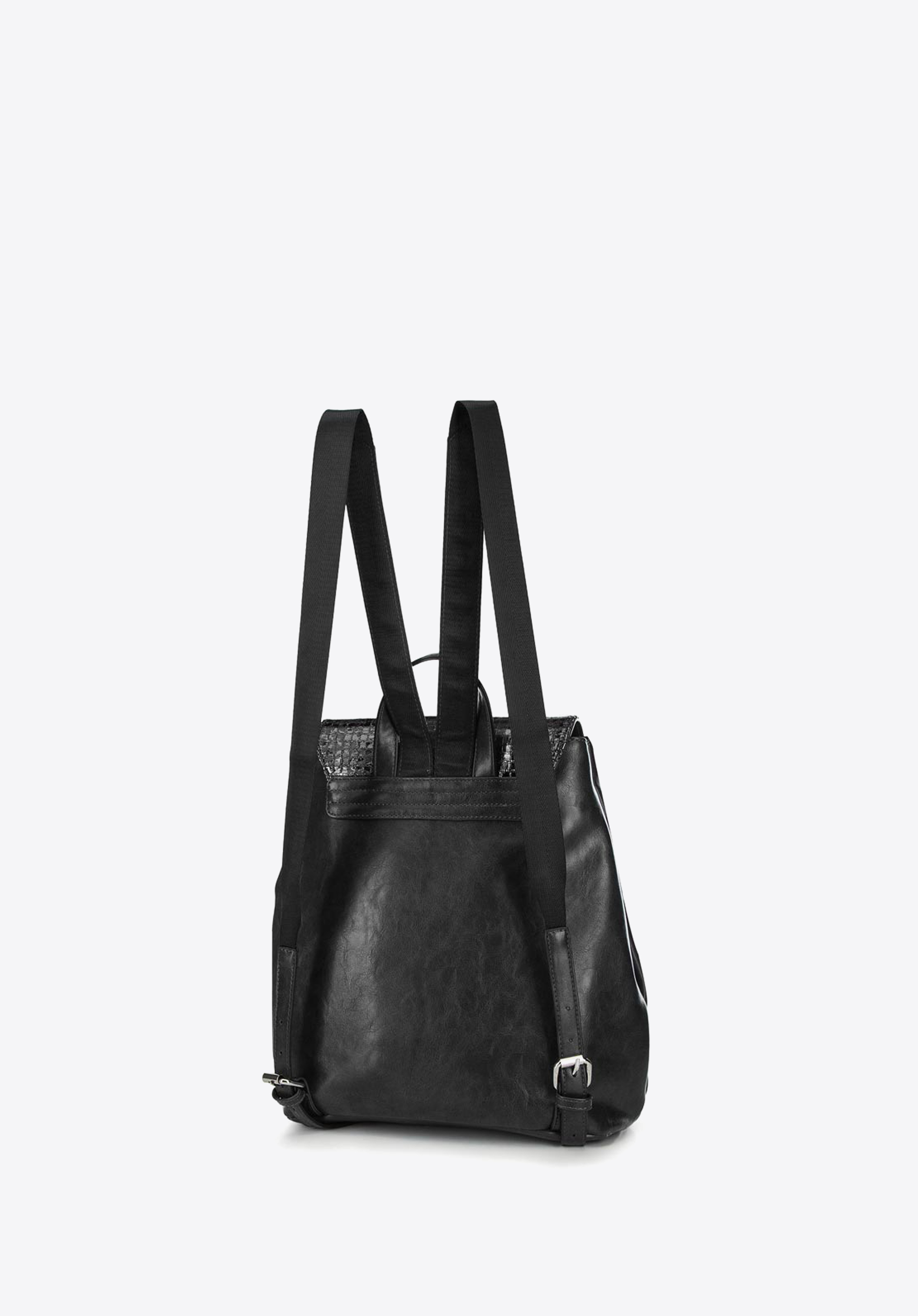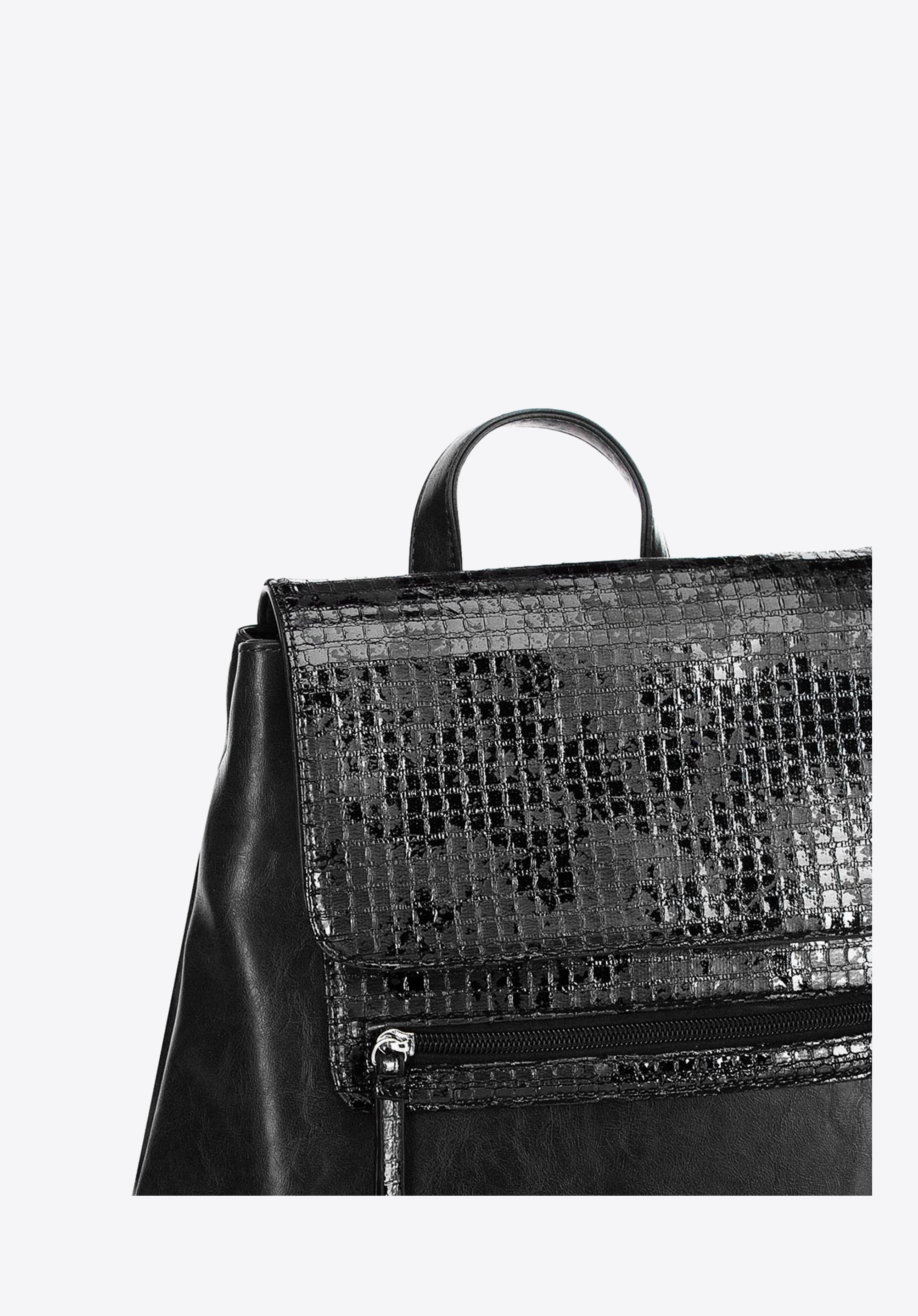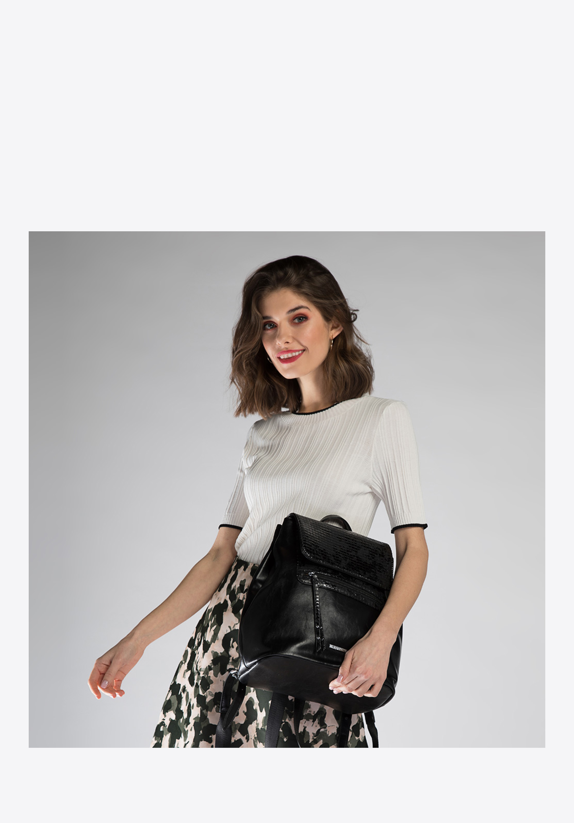 Torebka typu plecak z połyskującym zdobieniem na klapie, froncie oraz pasku od suwaka. Dodatek posiada po bokach zapięcia na zatrzaski, które umożliwiają zmianę fasonu i pojemności. Akcesorium występuje w czterech wersjach kolorystycznych: szarym, czarnym, różowym oraz granatowym.