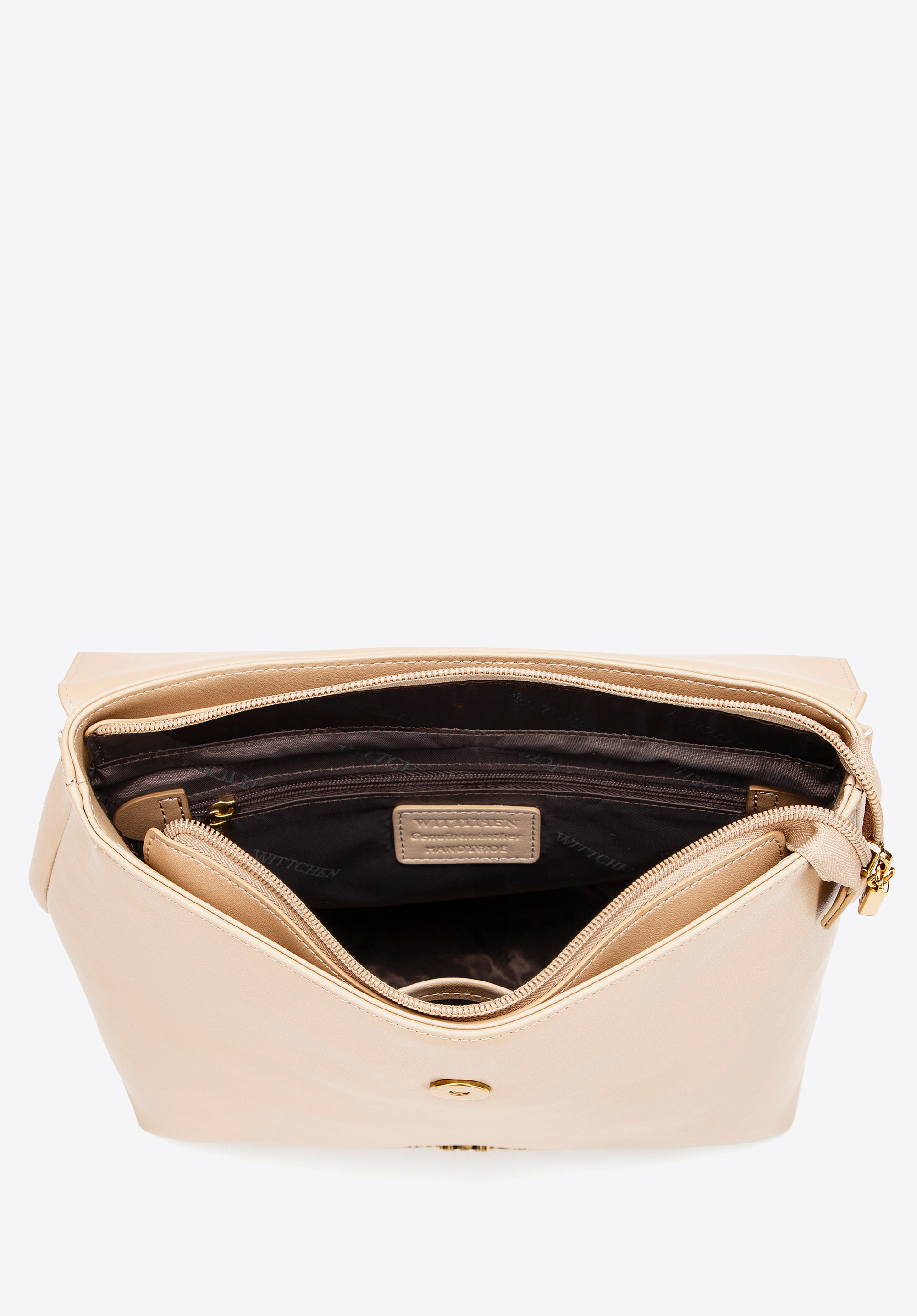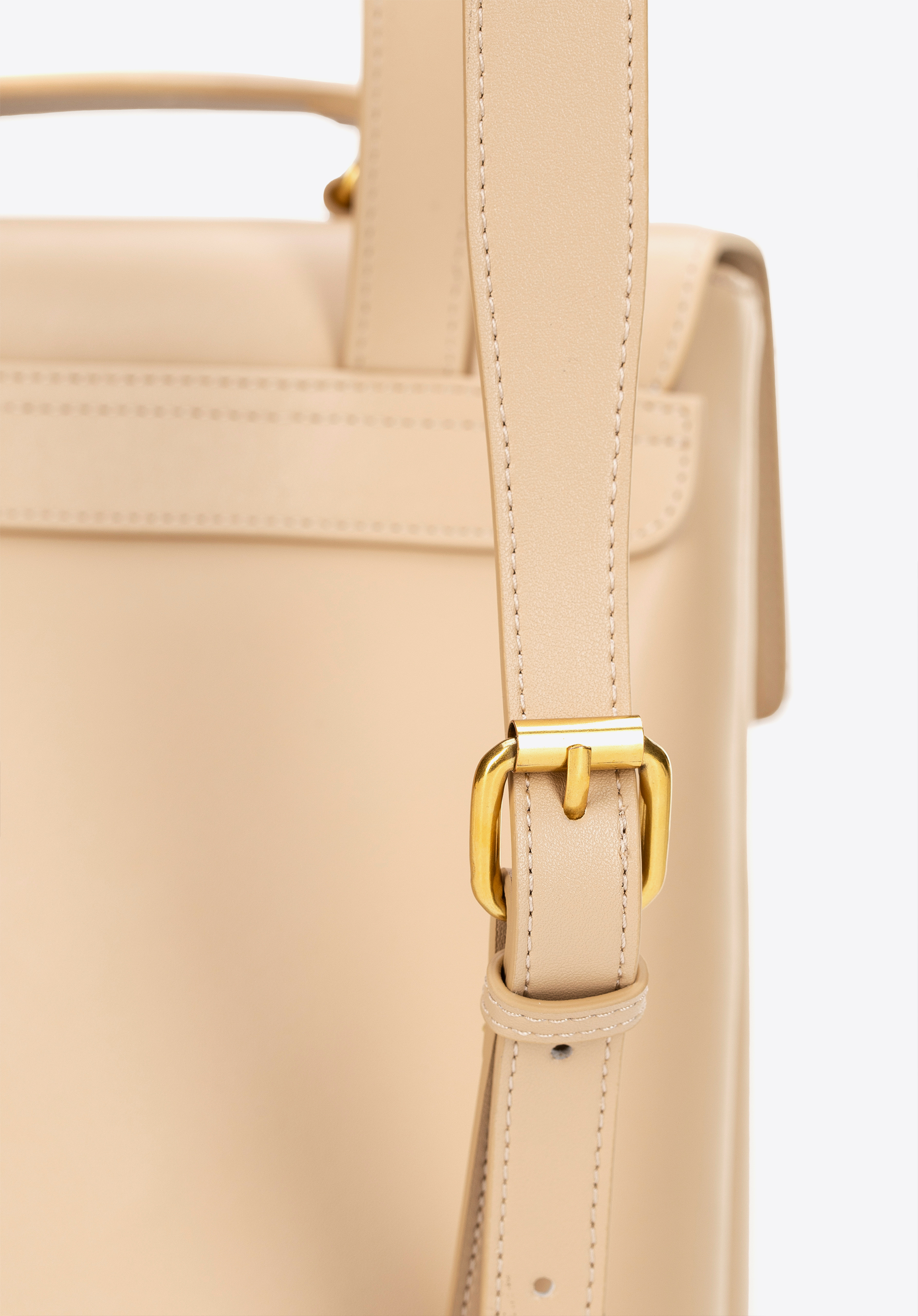 - Materiał: Korpus wykonany ze skóry naturalnej, trwały, elegancki i odporny na codzienne użytkowanie. Materiał pod klapą, rączka, szelki oraz wewnętrzne wykończenia wykonano z imitacji skóry, zapewniająca lekkość i komfort użytkowania.