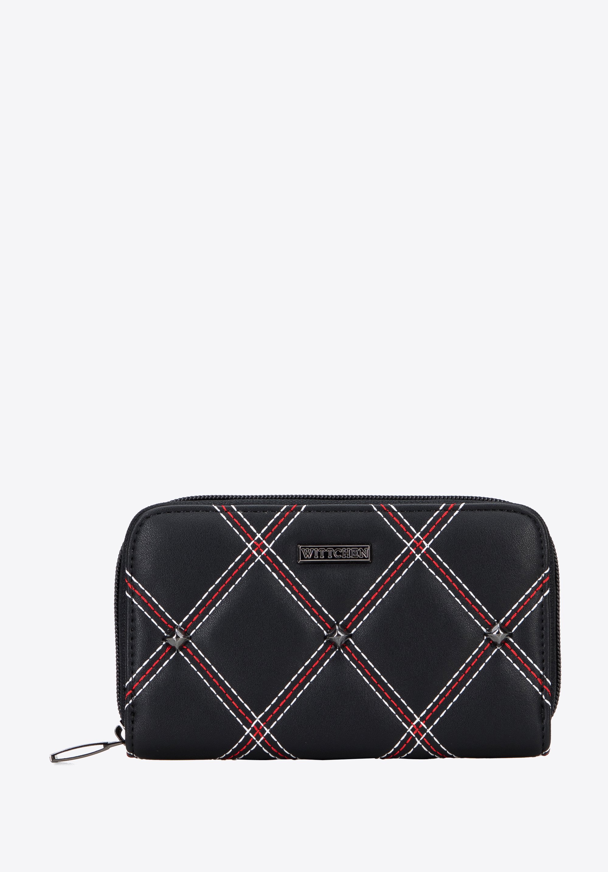 Damski portfel pikowany z nitami i ozdobnymi przeszyciami to świetny wybór dla każdej nowoczesnej kobiety.