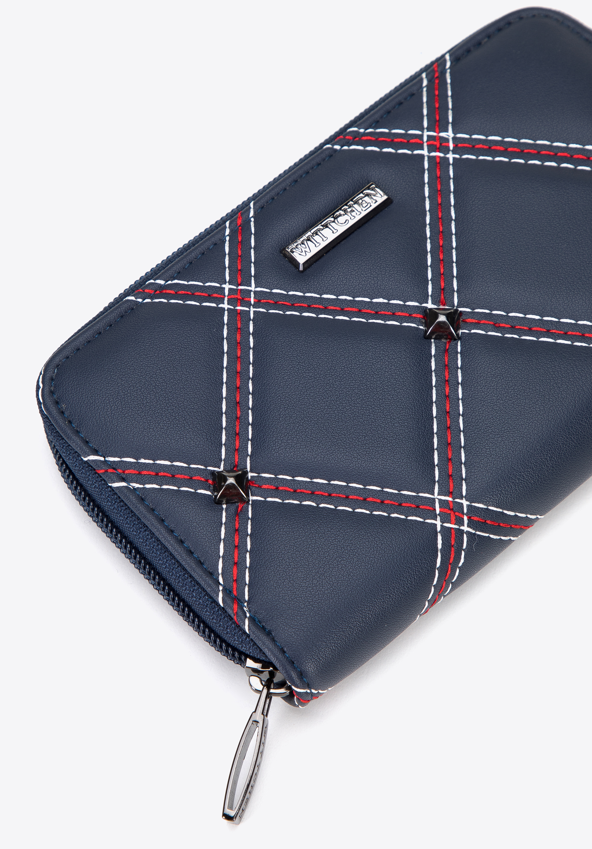 Damski portfel pikowany z nitami i ozdobnymi przeszyciami to świetny wybór dla każdej nowoczesnej kobiety.
