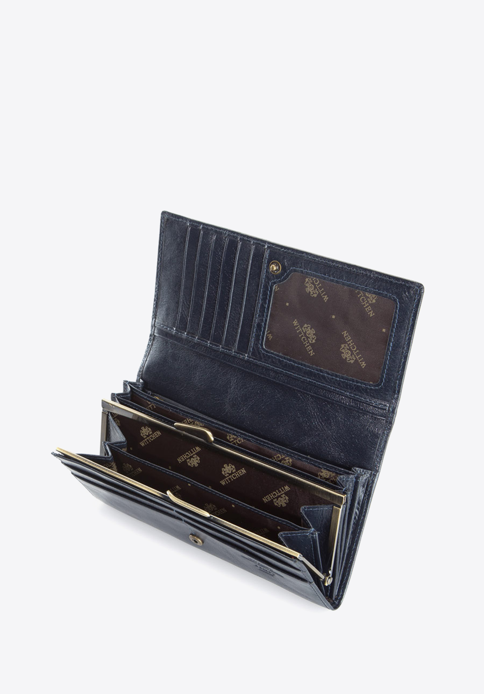 Duża, skórzana portmonetka zapinana na napę, wyposażona w pojemną, dwukomorową kieszeń na bilon to model pojemny, a zarazem bardzo elegancki. Klasyczny wzór, który nigdy nie wychodzi z mody.