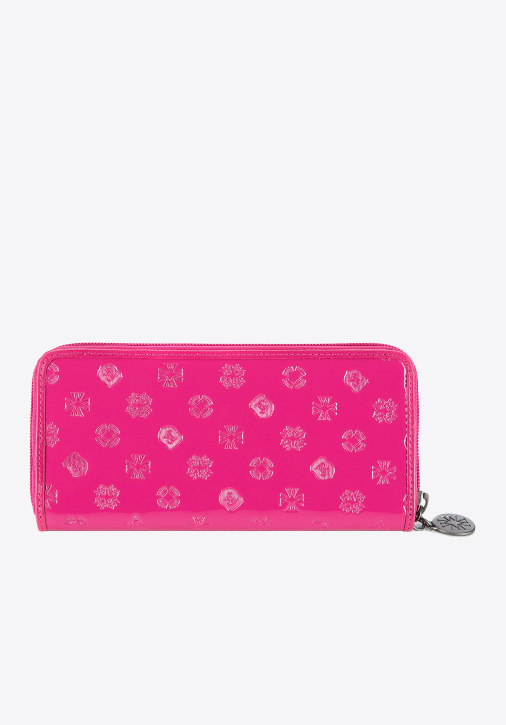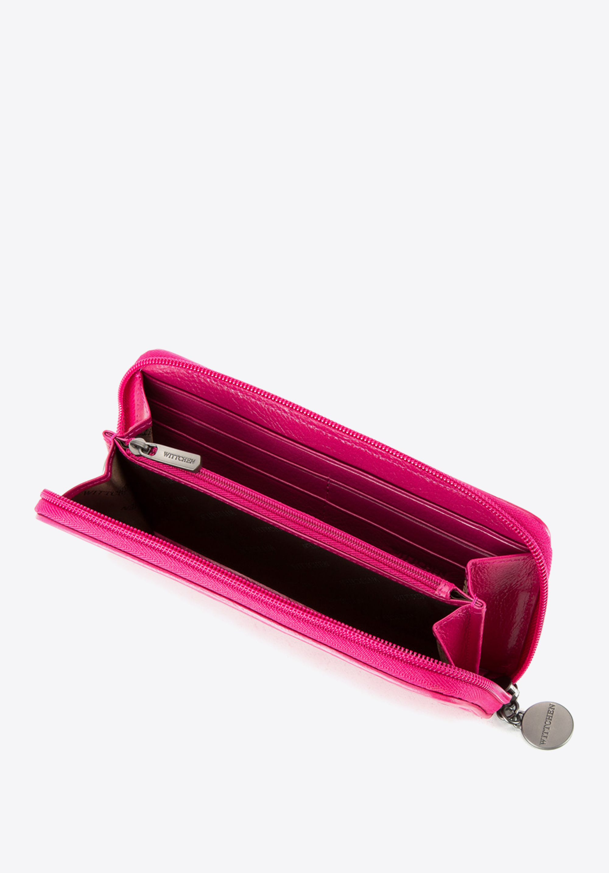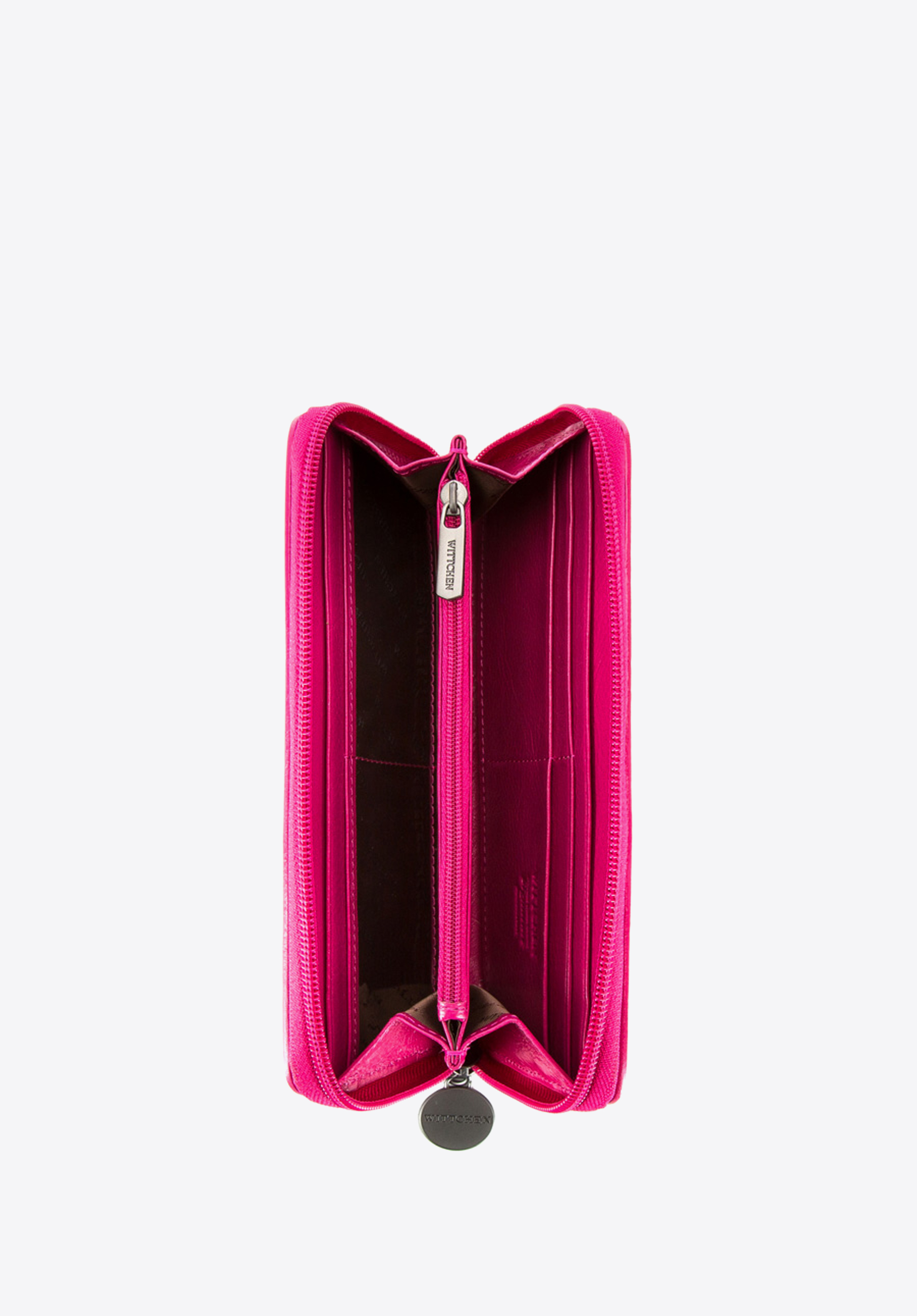 Duży portfel damski wykonany ze skóry lakierowanej to nie tylko praktyczny gadżet codziennego użytku, lecz także wyjątkowo szykowny dodatek. Model zamykany na suwak, ozdobiony charakterystycznymi tłoczeniami, uzupełni modny look.