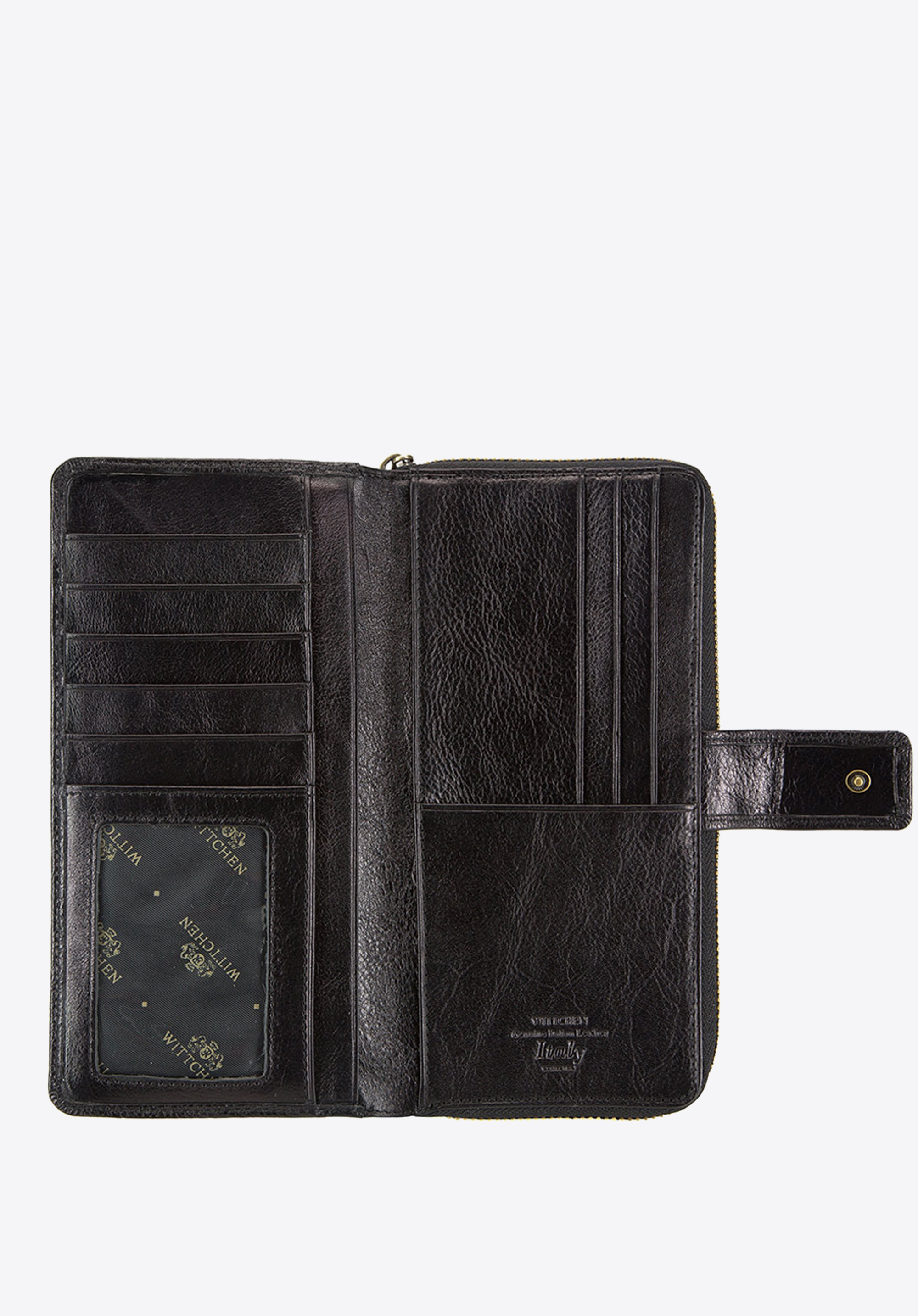 część zamykana na metalowe zapięcie, a w niej: 8 miejsc na karty kredytowe, 5 kieszeni, w tym 1 przezroczysta;