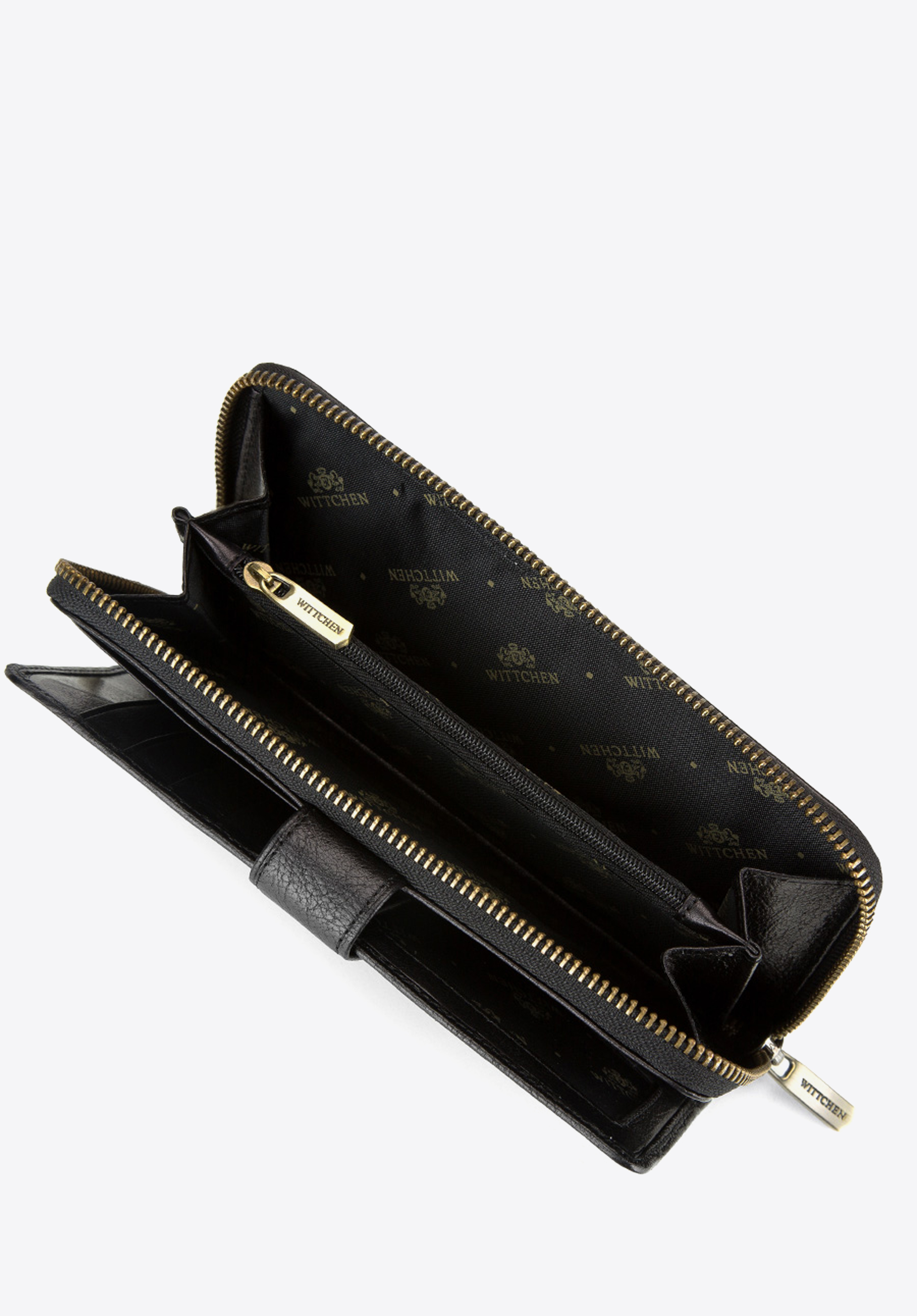 część zamykana na suwak, a w niej: 2 kieszenie na banknoty oraz kieszeń na bilon zamykana na suwak;