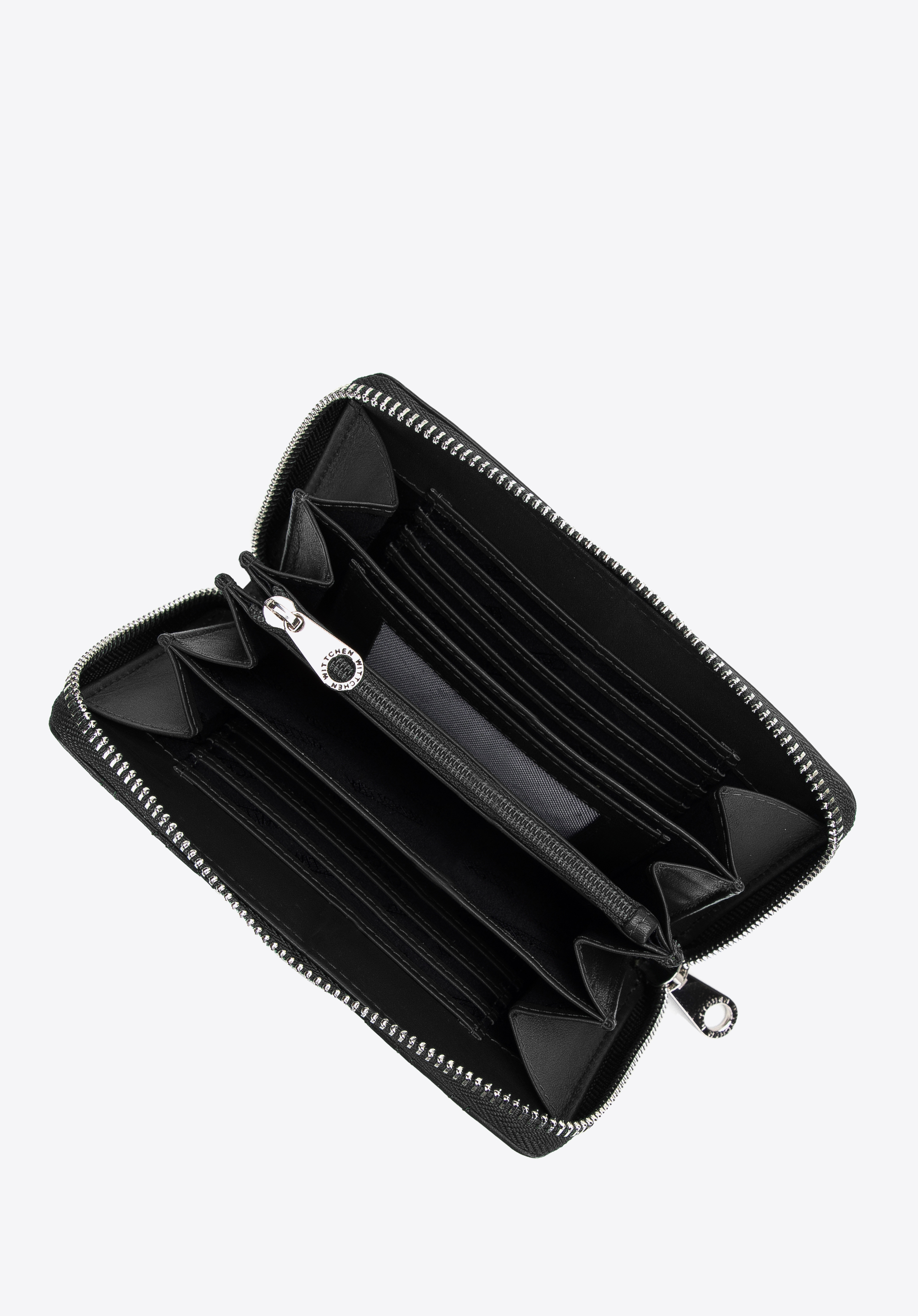 Damski portfel skórzany pikowany z nitami na suwak sprawdzi się u osób ceniących porządek i eleganckie detale w codziennym użytkowaniu. Zamek wokół korpusu, pojemne wnętrze z licznymi miejscami na karty oraz podszewka RFID gwarantują bezpieczeństwo i pełną kontrolę nad zawartością.