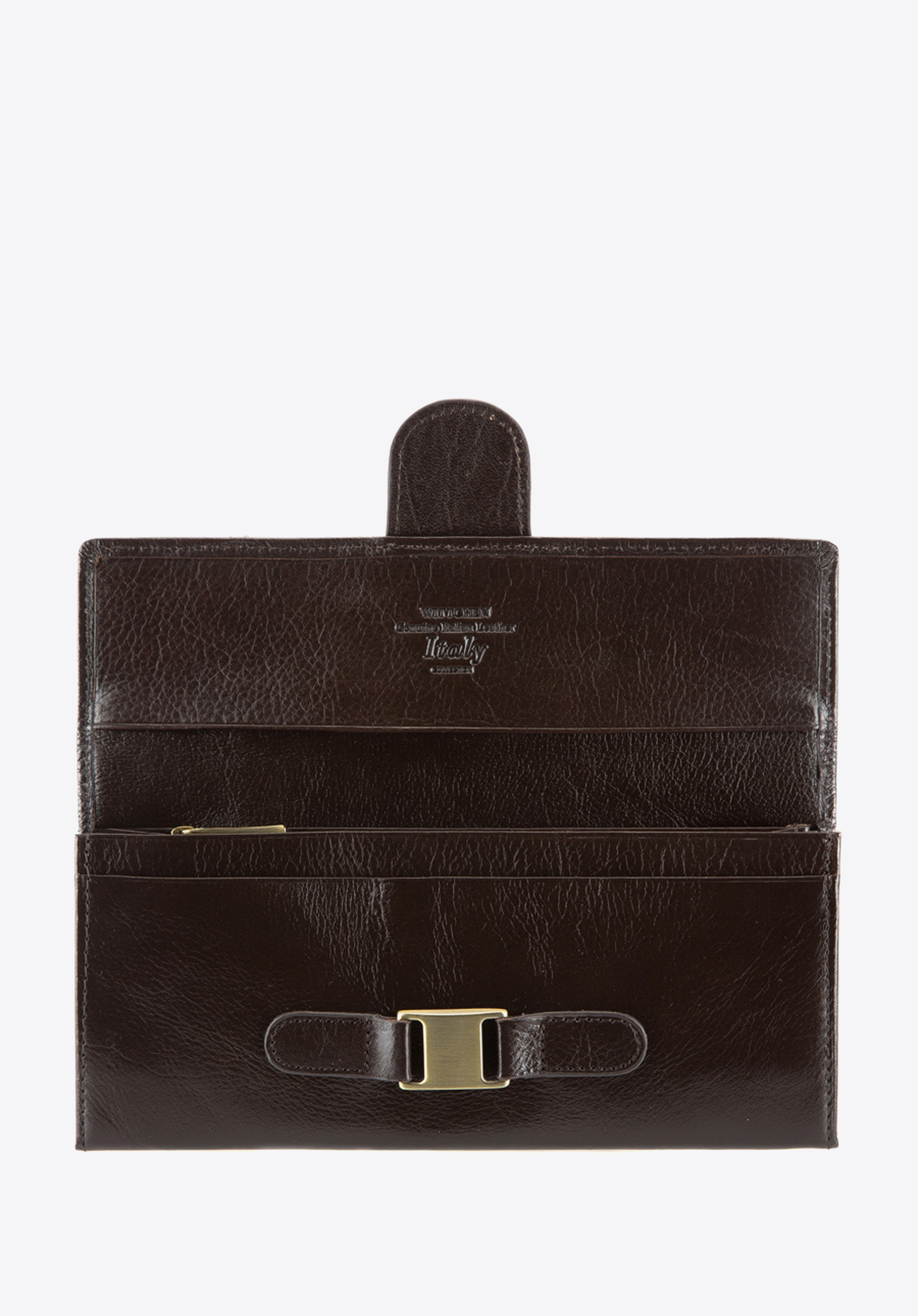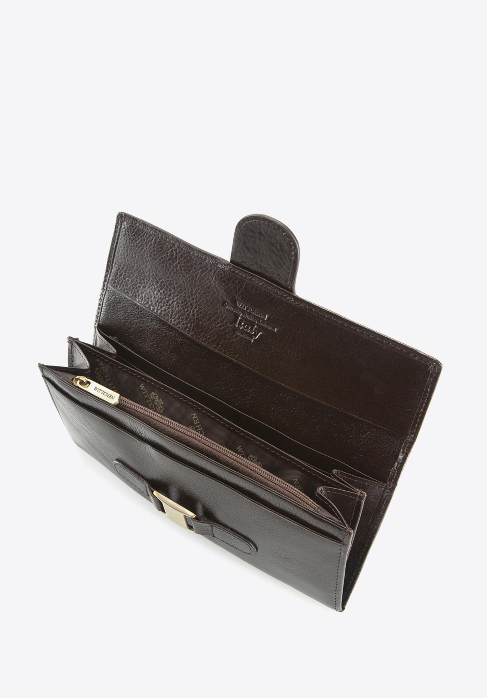 Szykowna portmonetka damska z nietuzinkowym zapięciem to elegancki i modny dodatek. Duży rozmiar i pojemne wnętrze czynią ten model wyjątkowo funkcjonalnym. Idealna dla pań ceniących elegancki styl połączony z luksusowym wykończeniem.