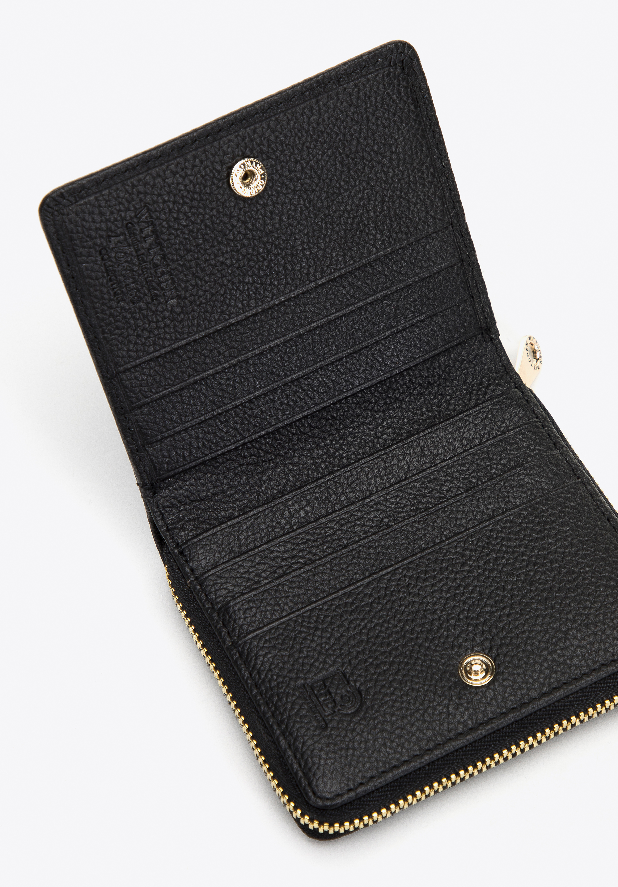 Damski portfel skórzany z ozdobnym brzegiem mały będzie idealny do listonoszki i wszędzie tam, gdzie liczy się poręczny rozmiar na co dzień. Wypukłe wykończenie krawędzi, ochrona RFID oraz sprytne połączenie zatrzasku i suwaka ułatwiają organizację kart i bilonu bez kompromisów.