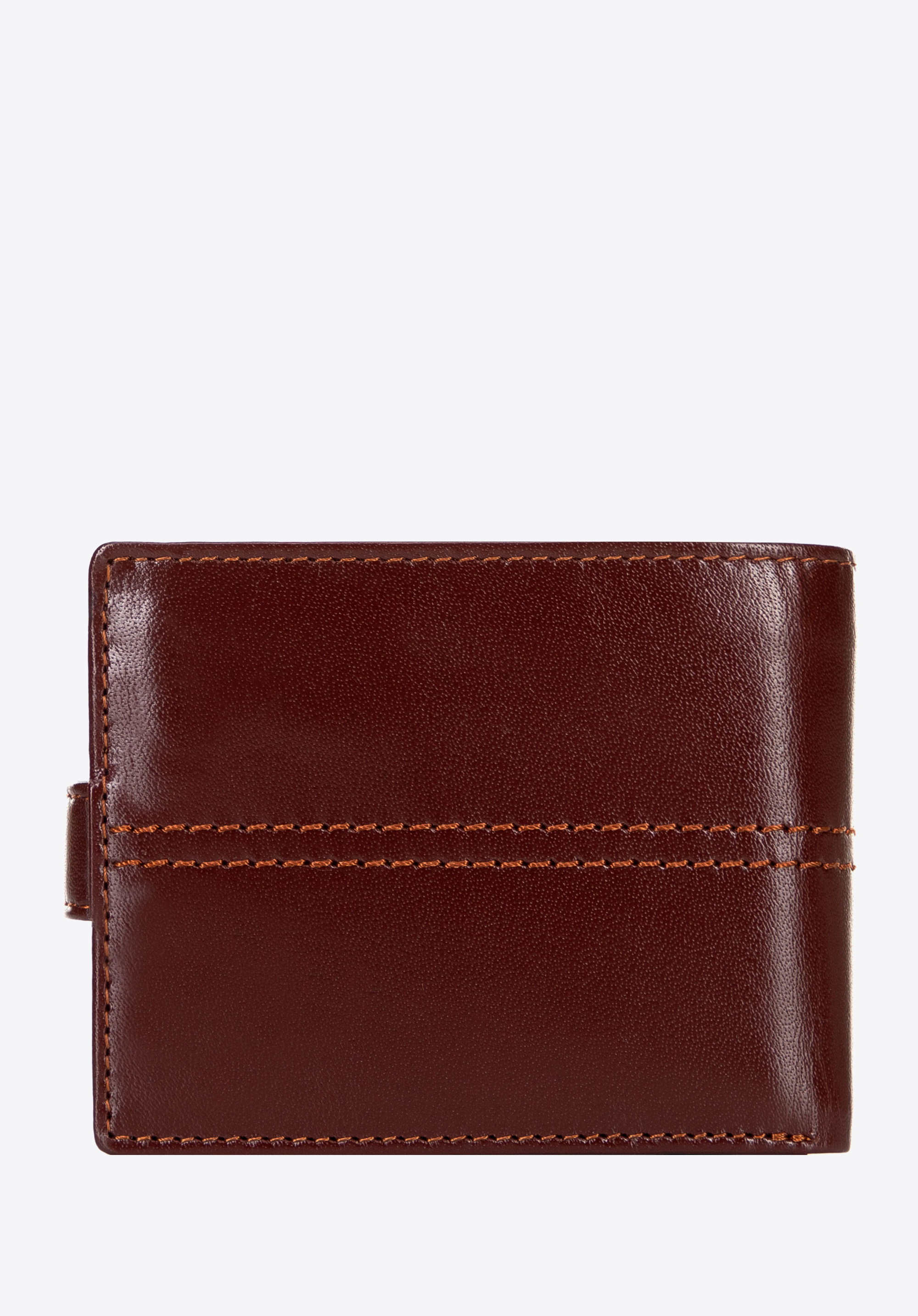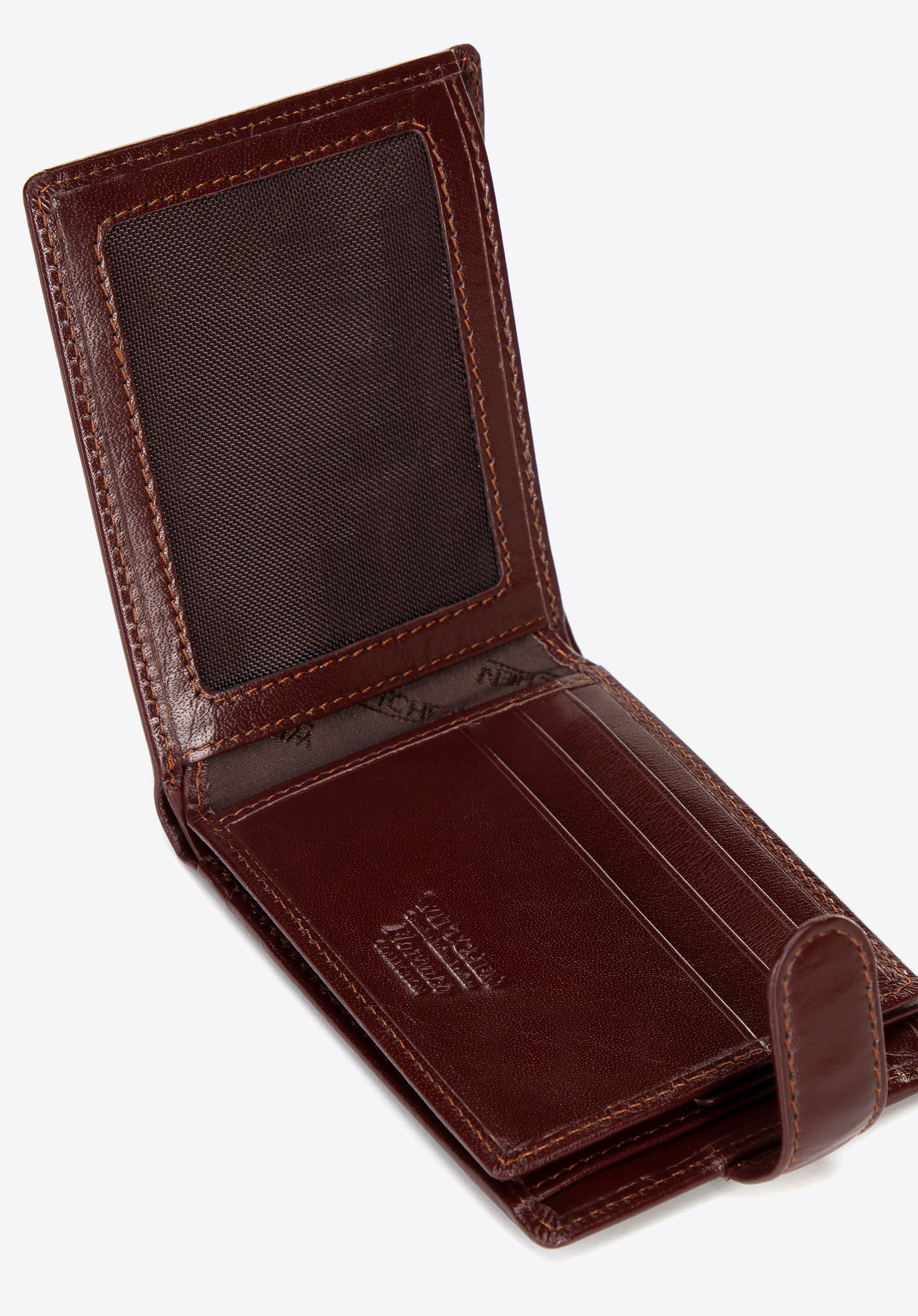 - Zapięcie: Skórzany portfel jest zabezpieczony paskiem zamykanym na napę.