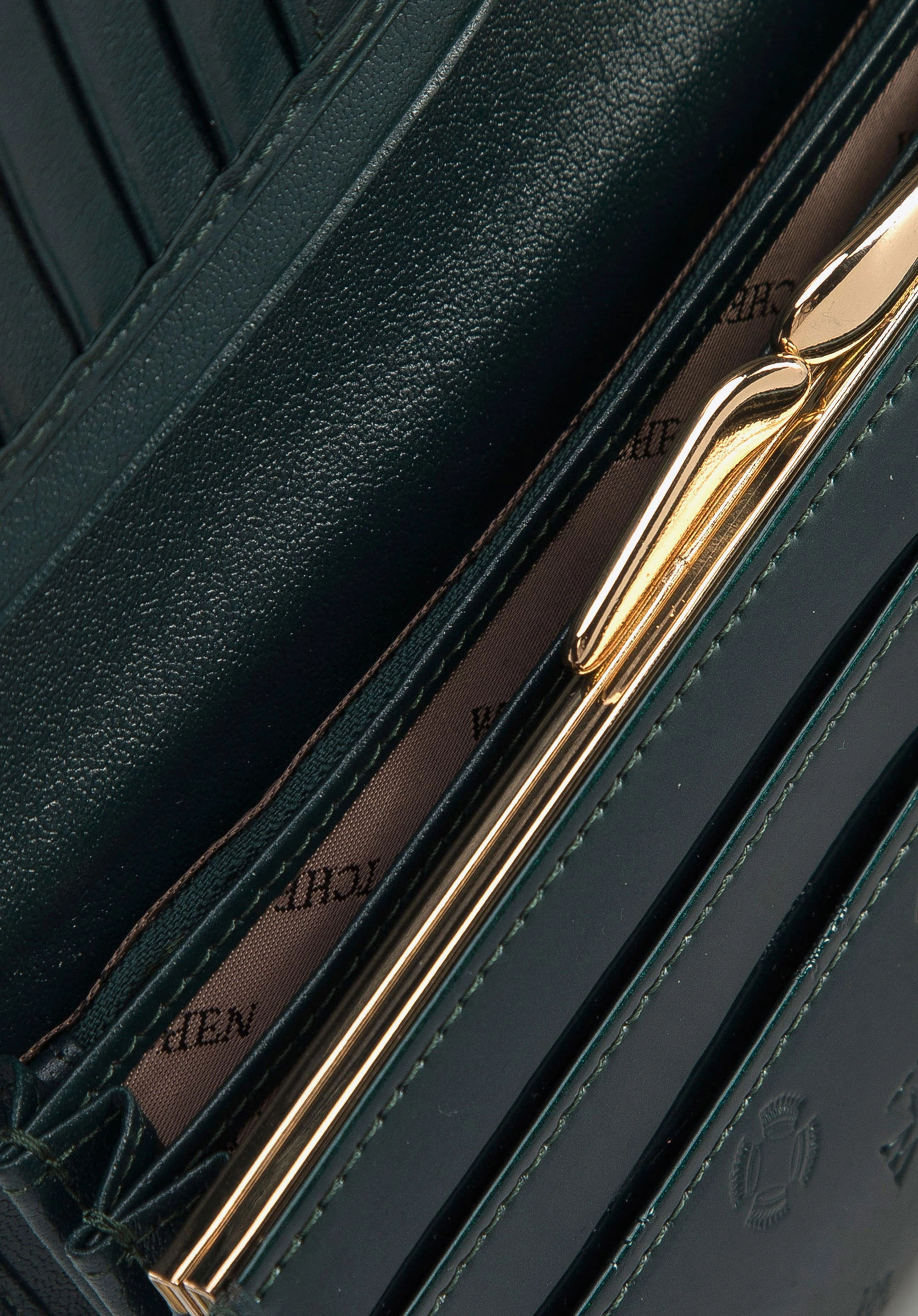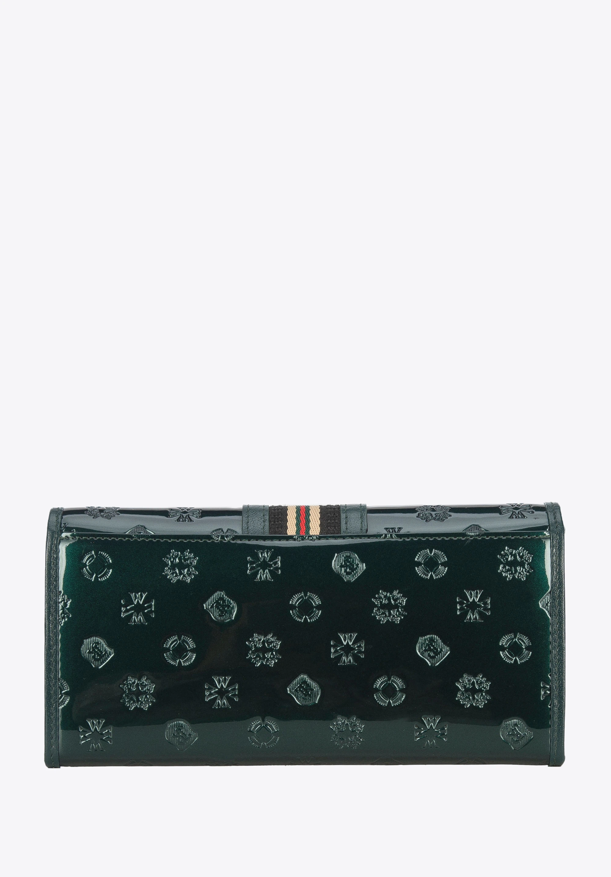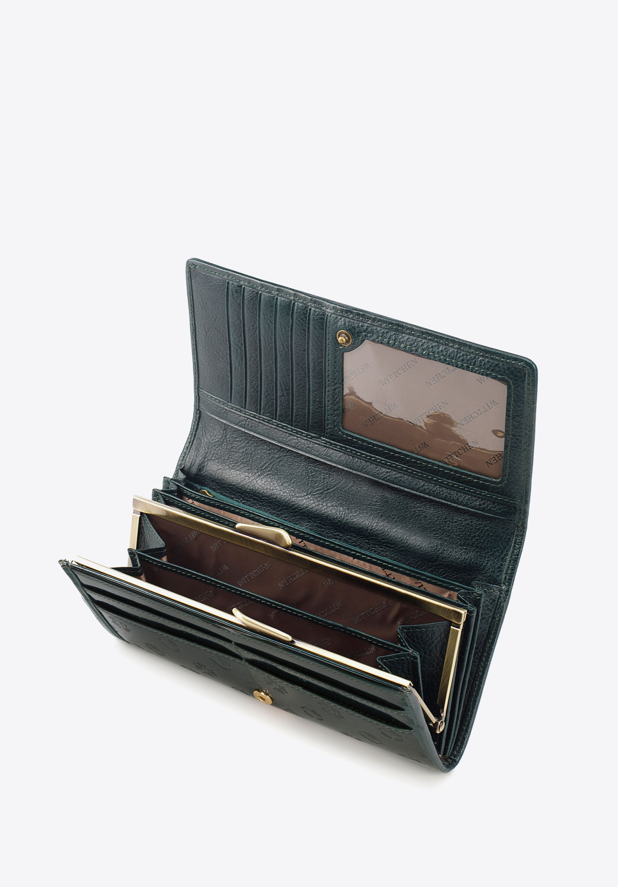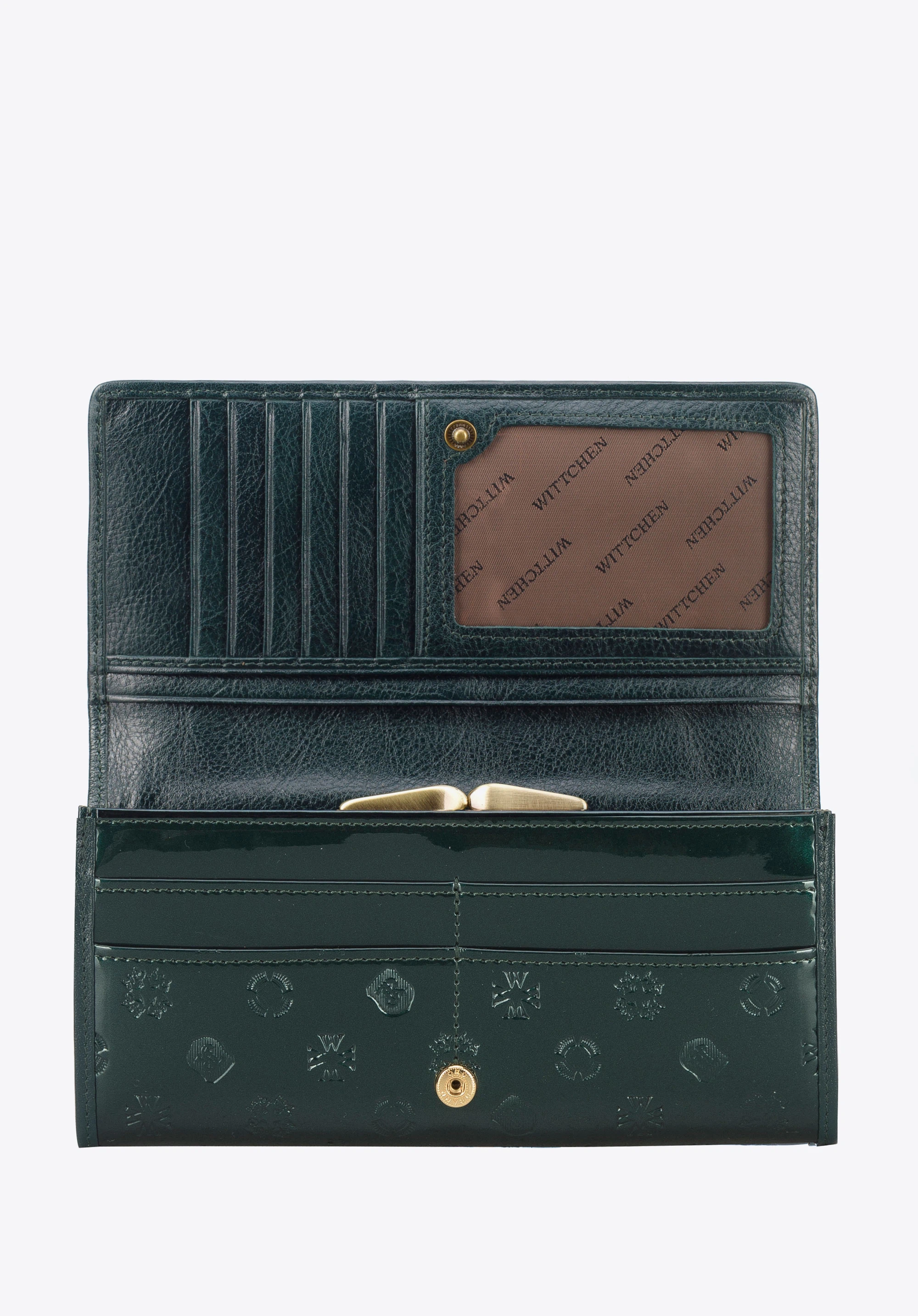 Wykonany jest z lakierowanej skóry tłoczonej w monogram WITTCHEN. Wnętrze portfela jest świetnie zorganizowane. W środku ma kilka otwartych kieszeni, kieszeń na bilon zapinaną na bigiel, wiele miejsc na karty i przezroczystą kieszonkę na zdjęcie lub bilet.