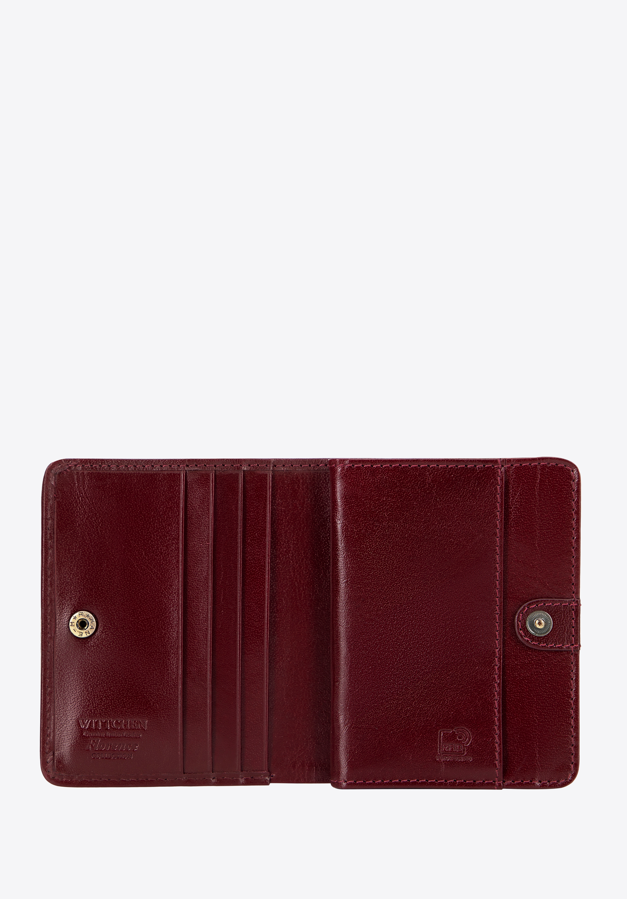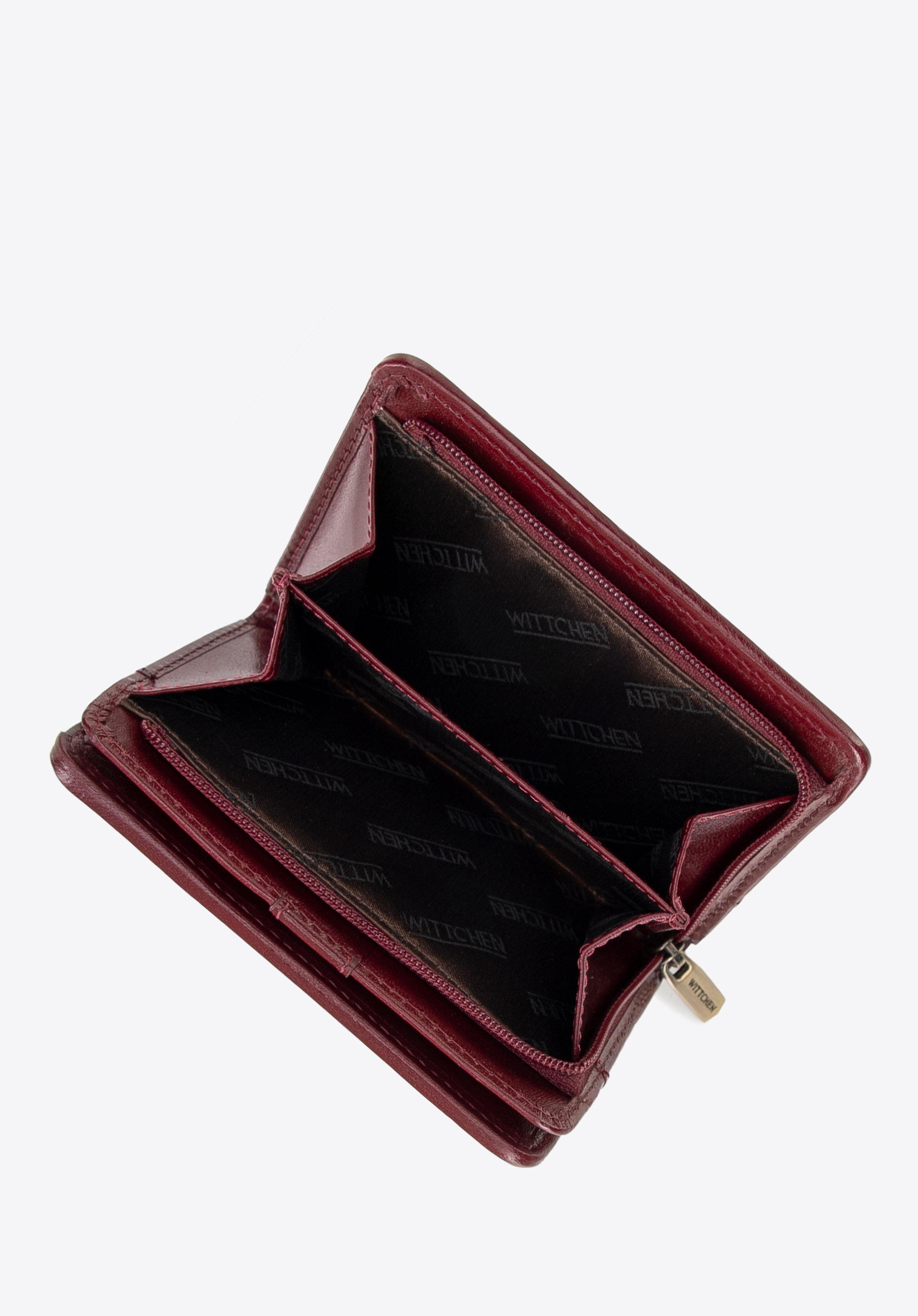 - Detale: Zdobienie w postaci blaszki z herbem WITTCHEN w kolorze starego złota, które dodaje portfelowi subtelnej klasy.