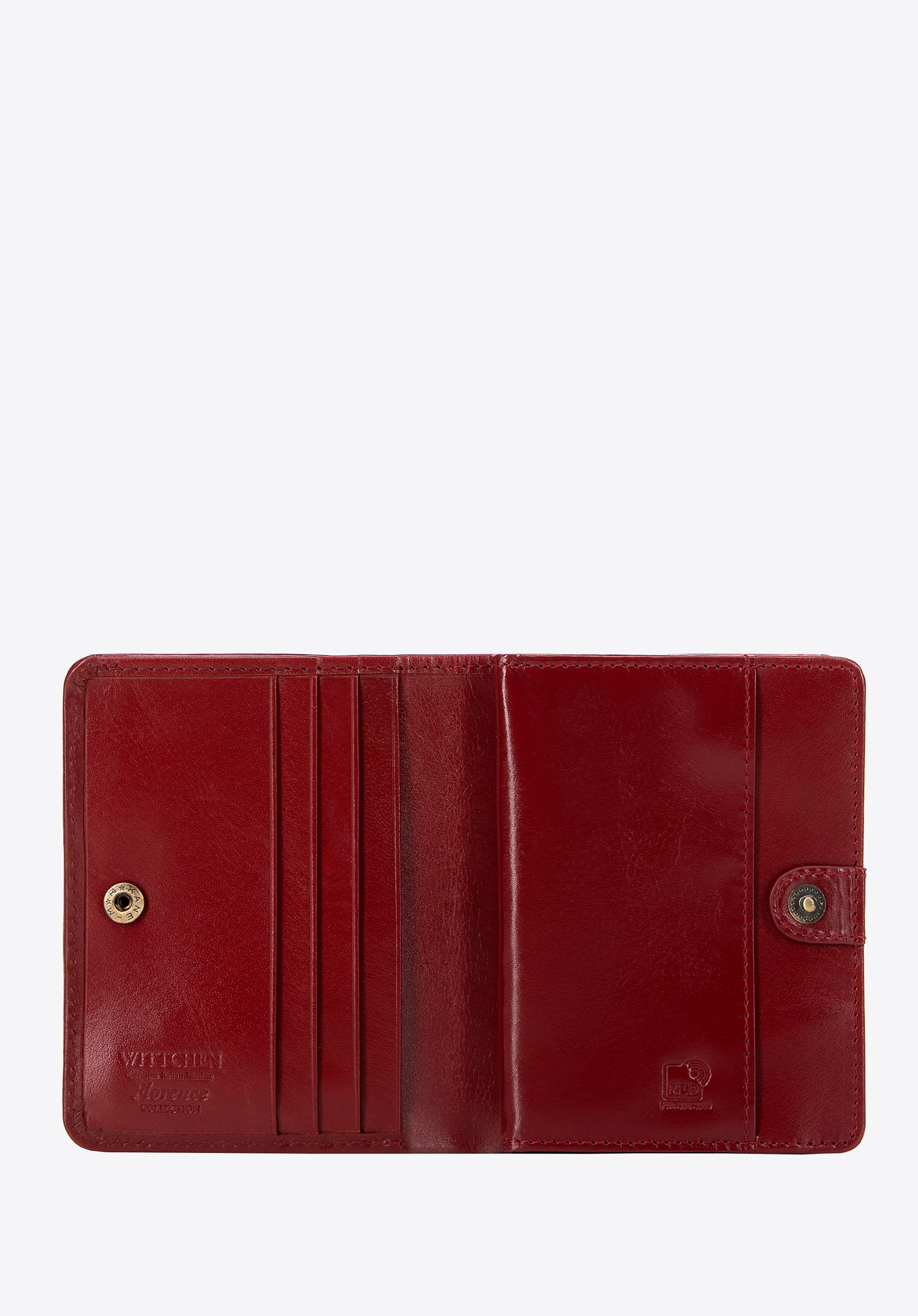 - Detale: Zdobienie w postaci blaszki z herbem WITTCHEN w kolorze starego złota, które dodaje portfelowi subtelnej klasy.