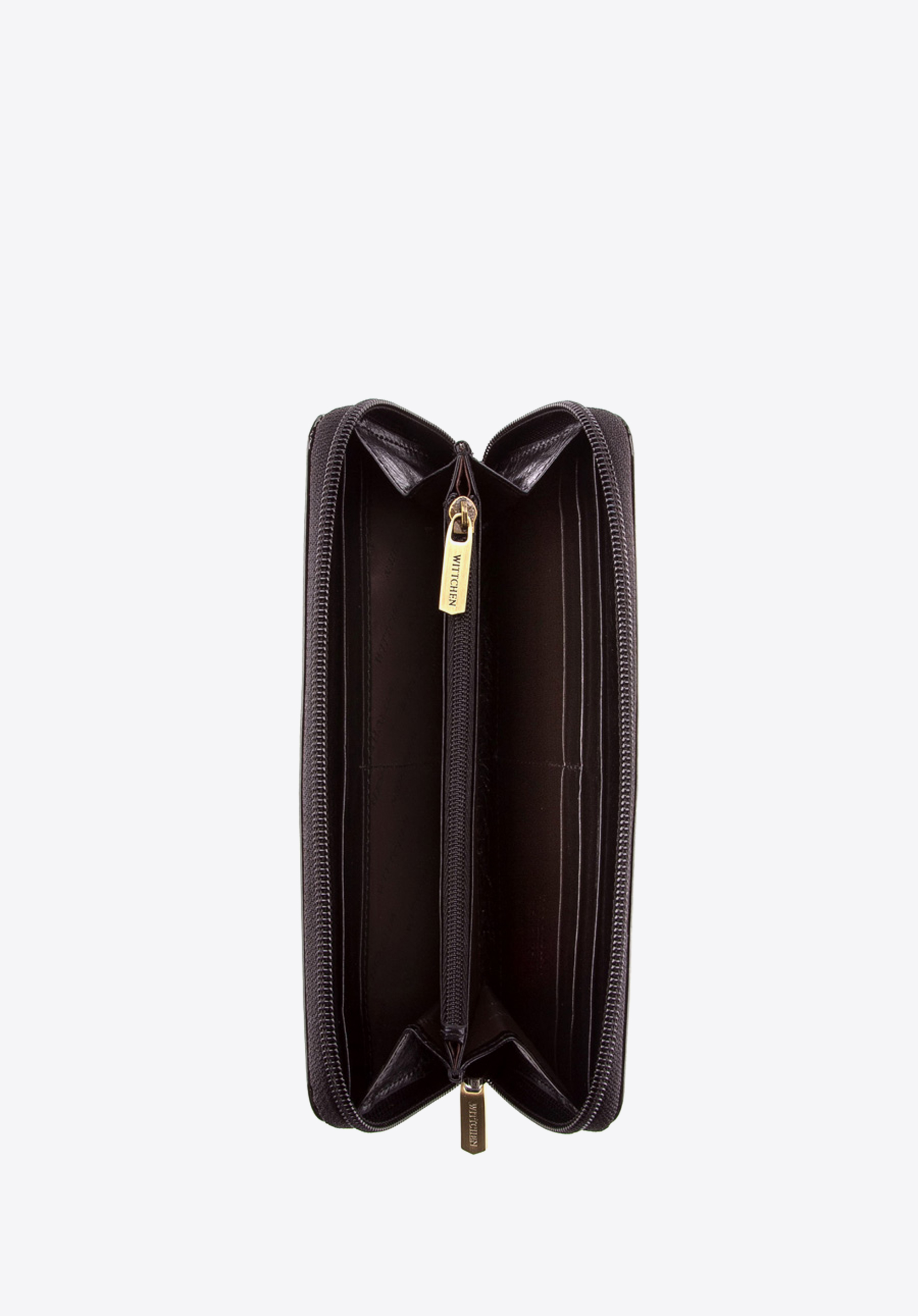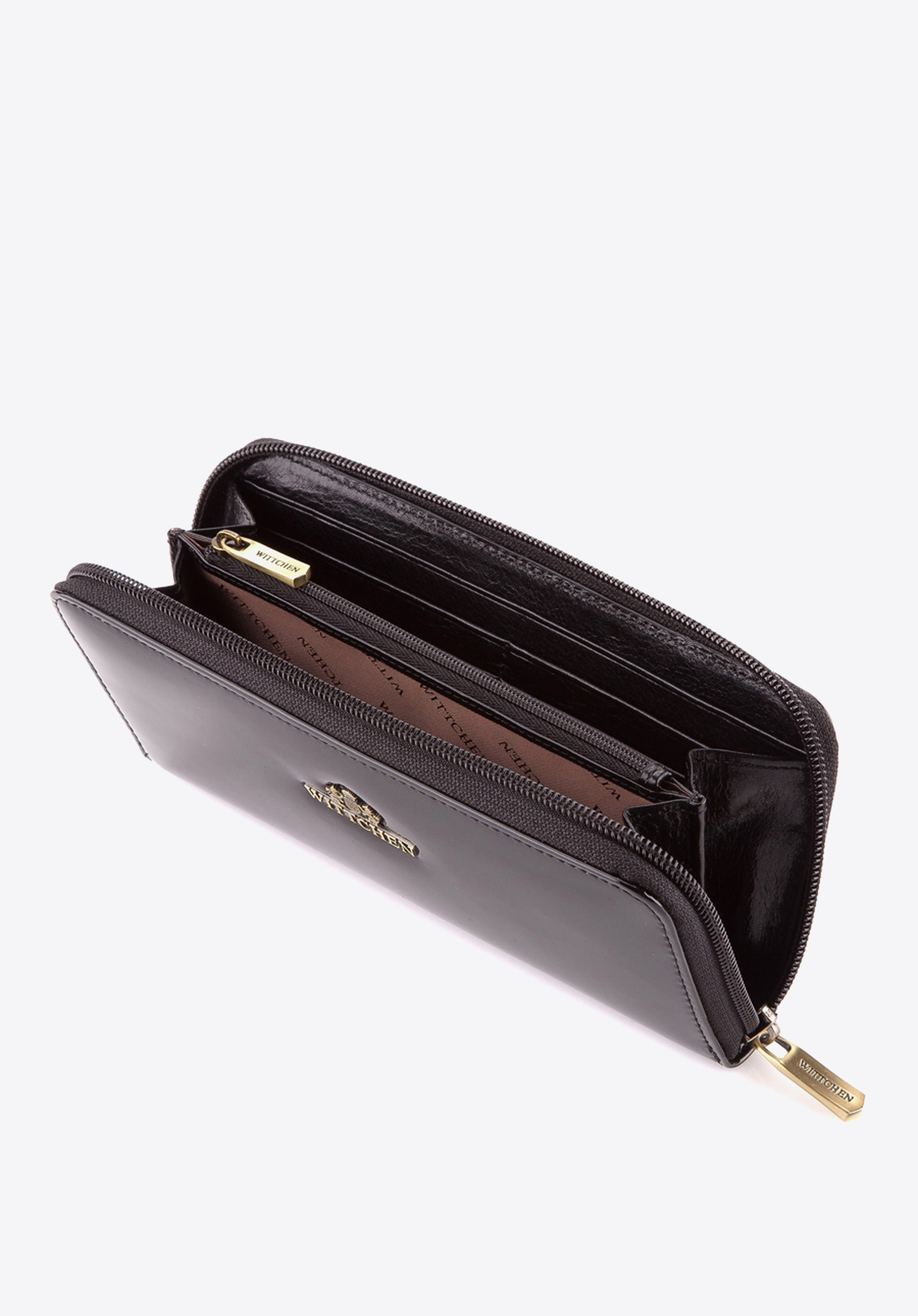 - portfel posiada zdobienie w postaci metalowej blaszki herbu WITTCHEN w kolorze starego złota;