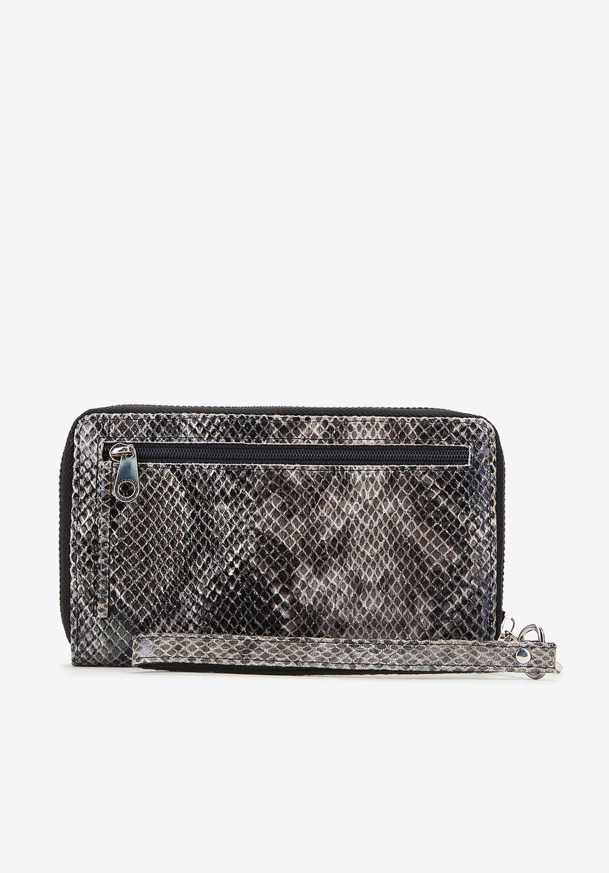 Duży damski portfel wykonany ze skóry naturalnej, która imituje zwierzęcy wzór skóry wężowej. Portfel damski to stylowy dodatek dla każdej kobiety. Wnętrze i obszycia produktu wykonane zostały z najlepszej jakości skóry naturalnej oraz poliestru, dzięki temu portfel jest bardzo trwały. Panie z pewnością docenią liczne kieszonki i przegródki na karty, ochronę RFID oraz wyjątkowo atrakcyjne wykończenie z nutką ekstrawagancji.