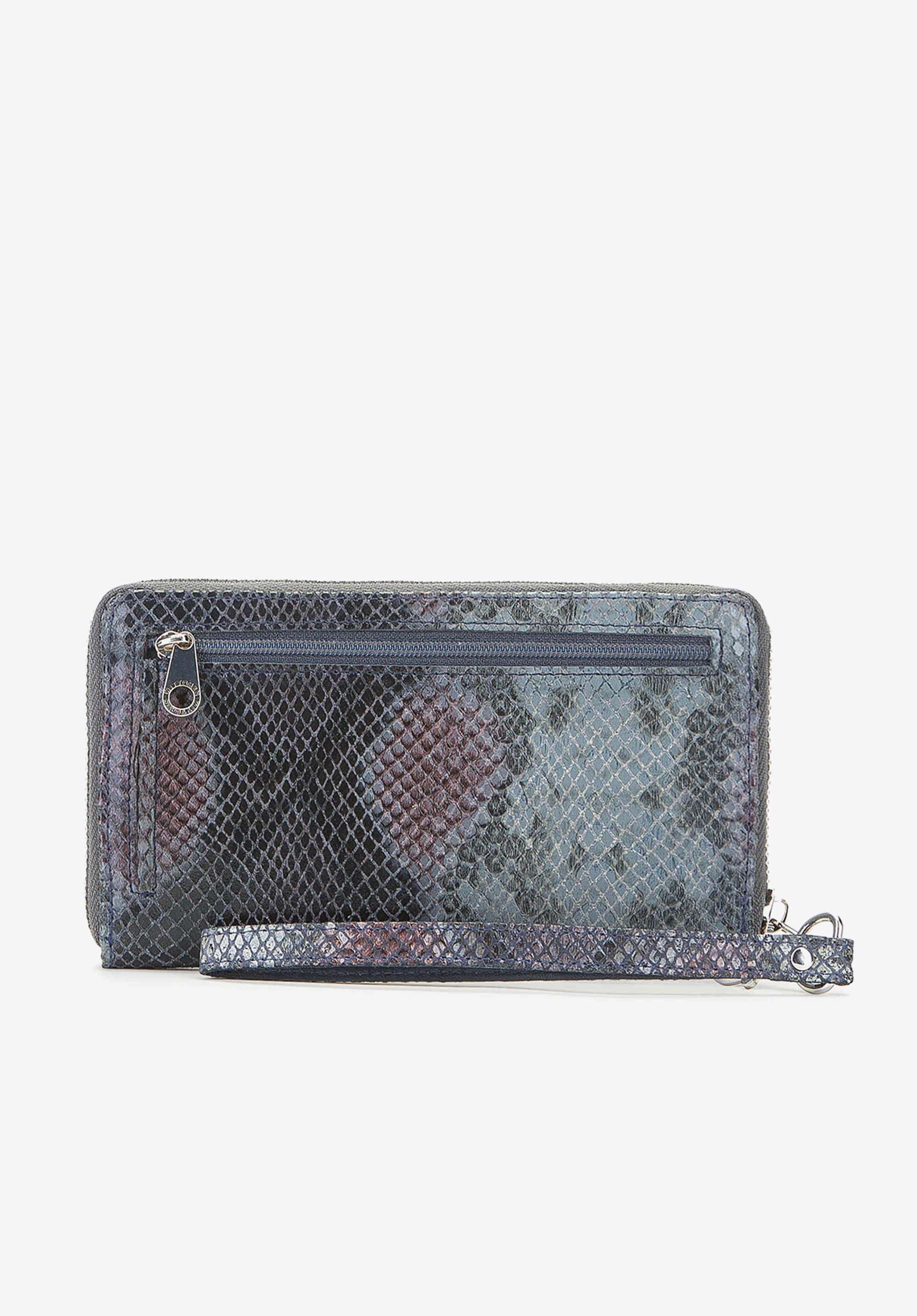 Duży damski portfel wykonany ze skóry naturalnej, która imituje zwierzęcy wzór skóry wężowej. Portfel damski to stylowy dodatek dla każdej kobiety. Wnętrze i obszycia produktu wykonane zostały z najlepszej jakości skóry naturalnej oraz poliestru, dzięki temu portfel jest bardzo trwały. Panie z pewnością docenią liczne kieszonki i przegródki na karty, ochronę RFID oraz wyjątkowo atrakcyjne wykończenie z nutką ekstrawagancji.