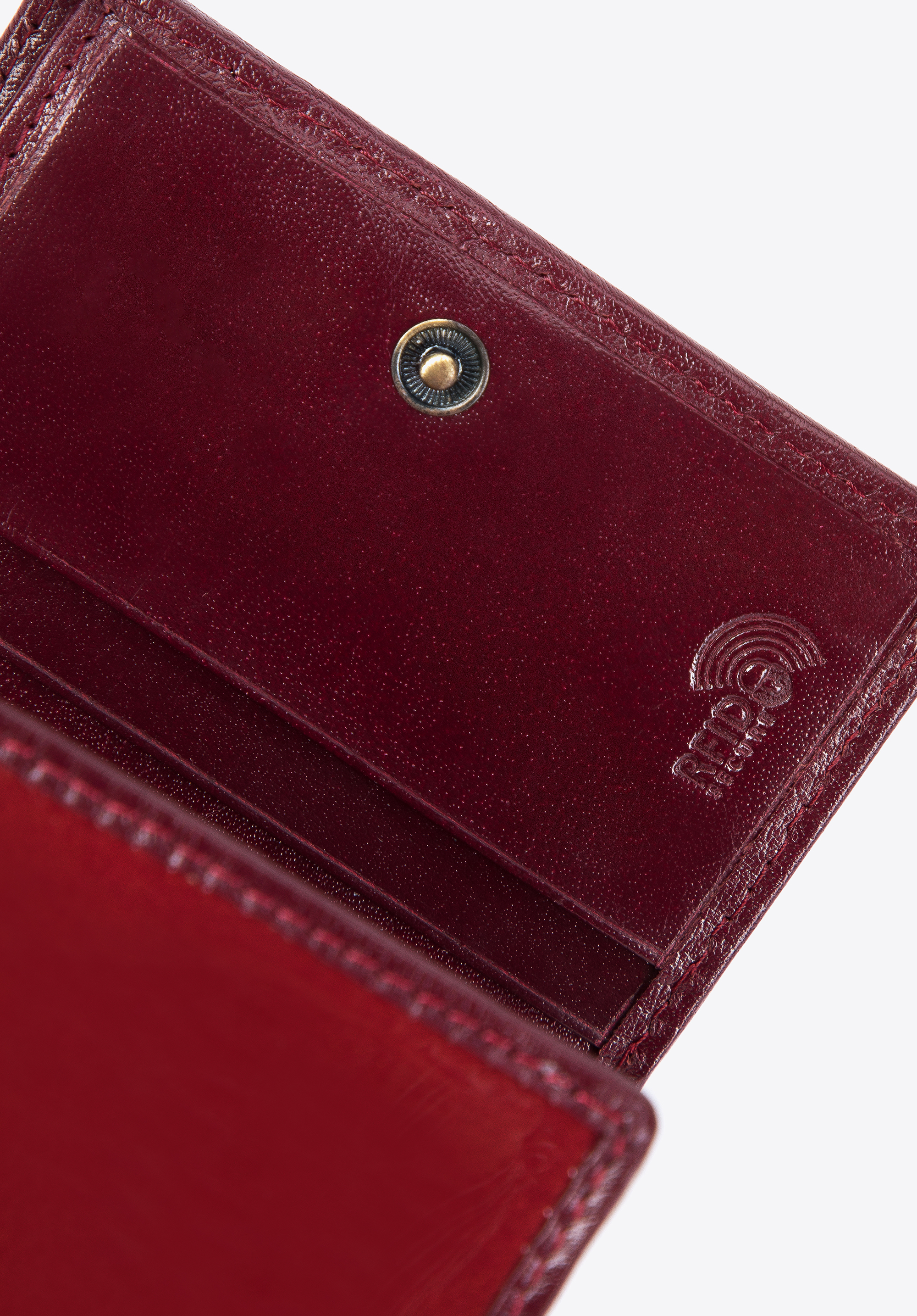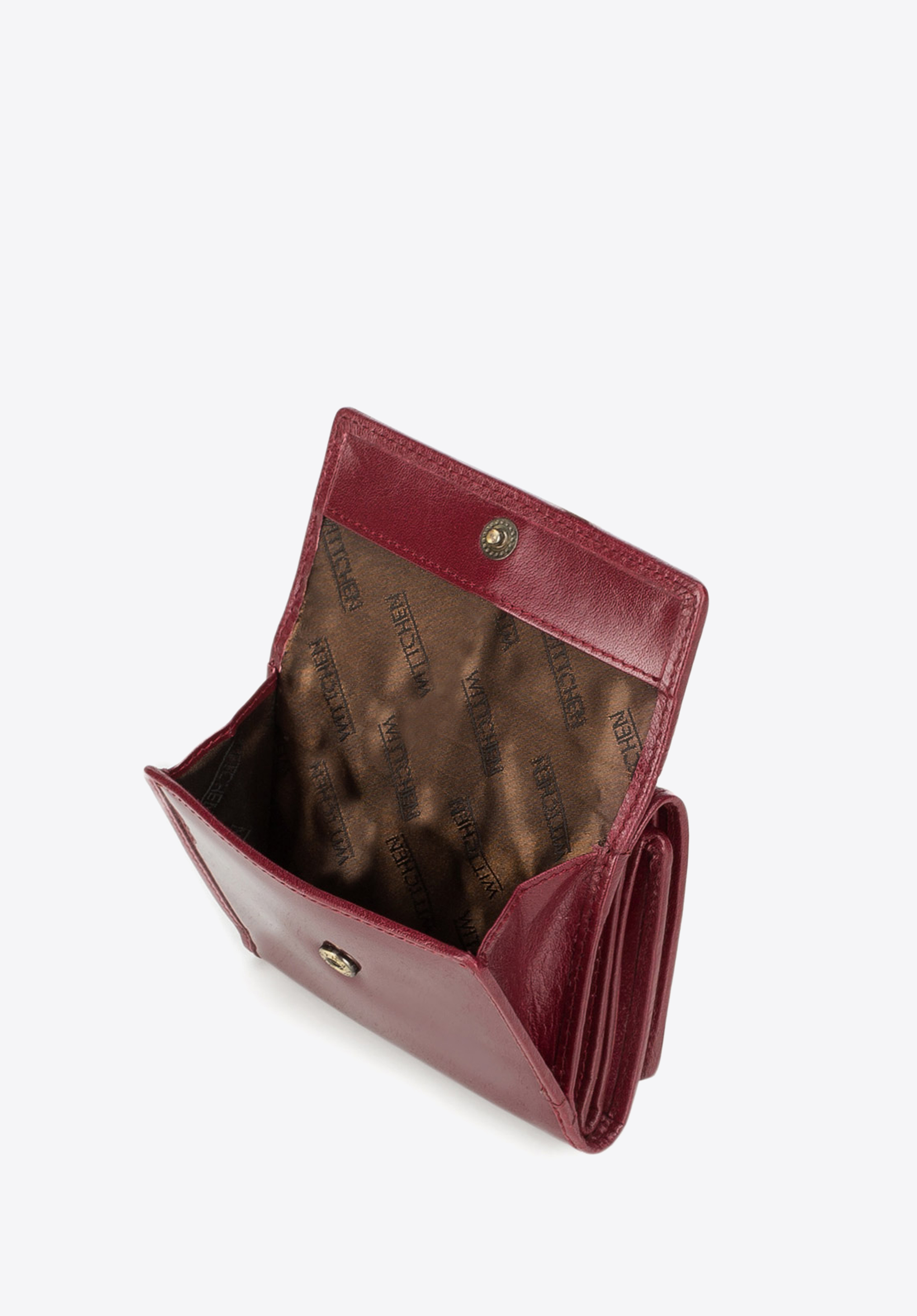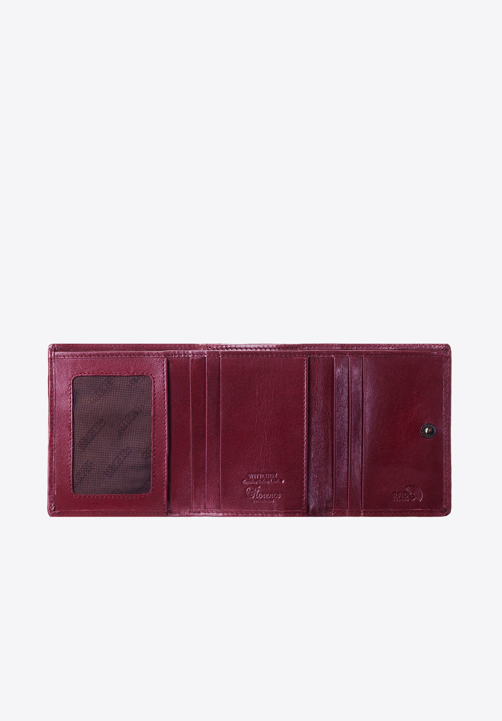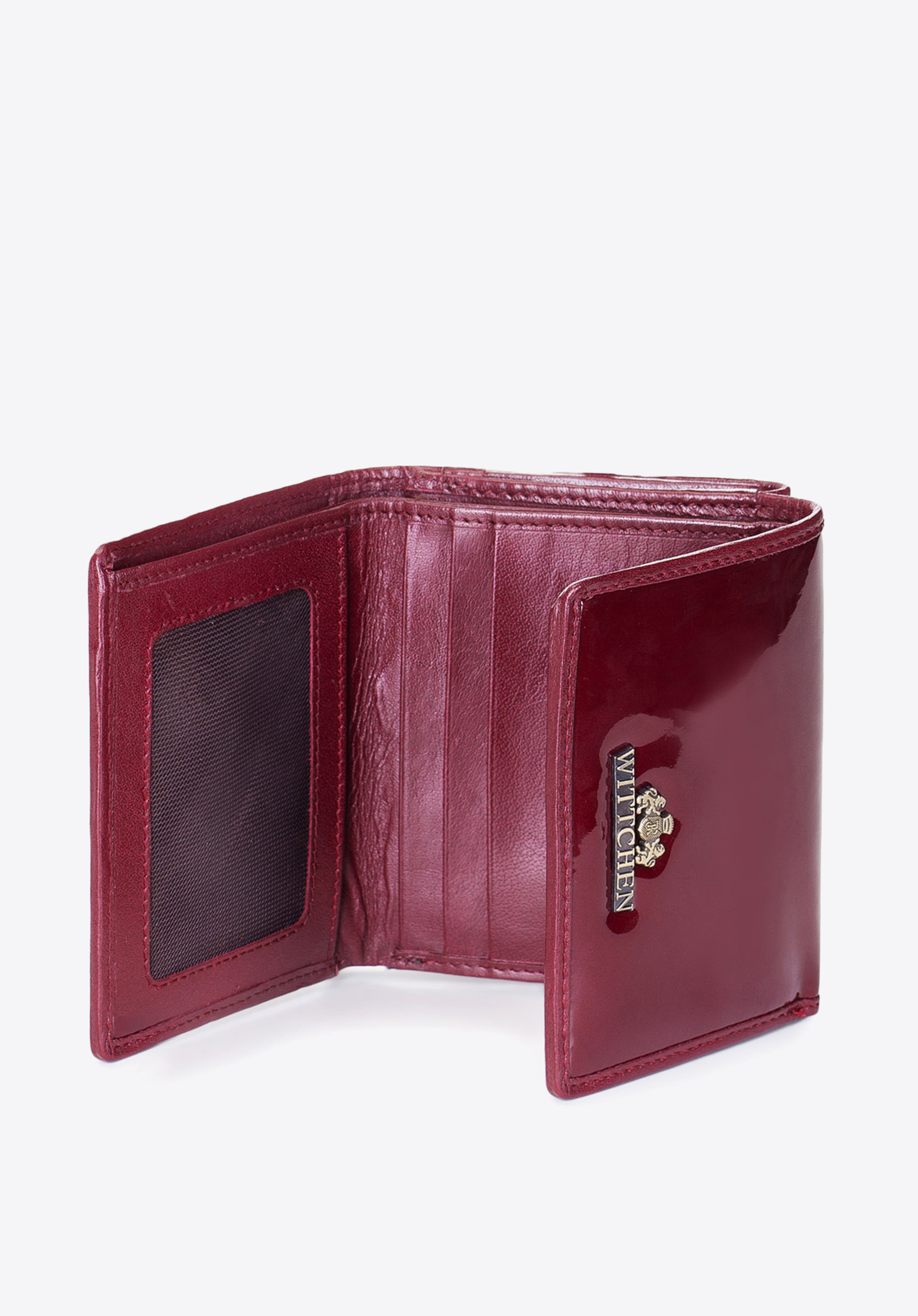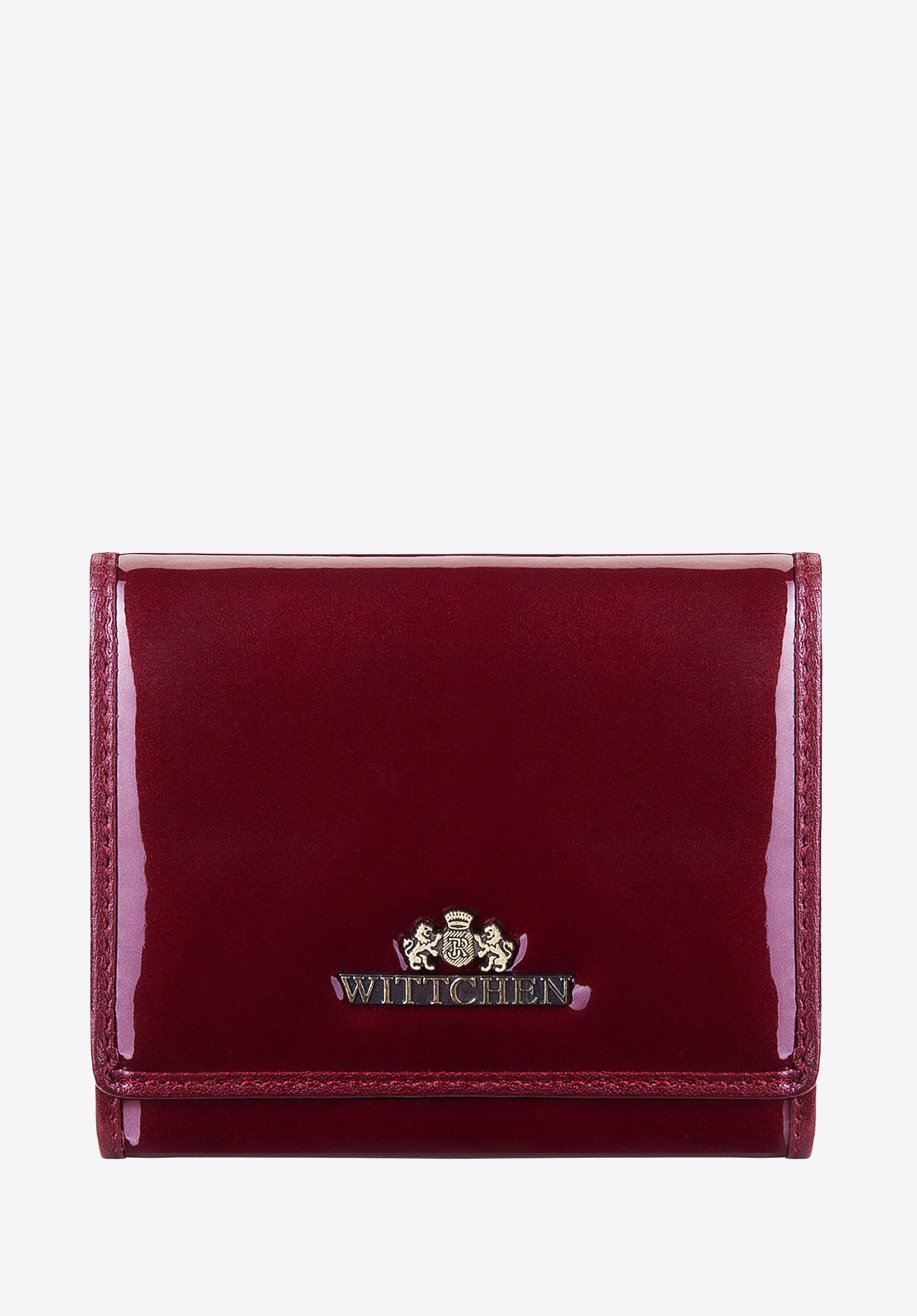 skóry lakierowanej o pięknym połysku. Głęboką kolorystykę przełamuje złoty akcent w postaci blaszki z herbem WITTCHEN. Rozkładany model został wyposażony w przydatną funkcję ochrony kart.