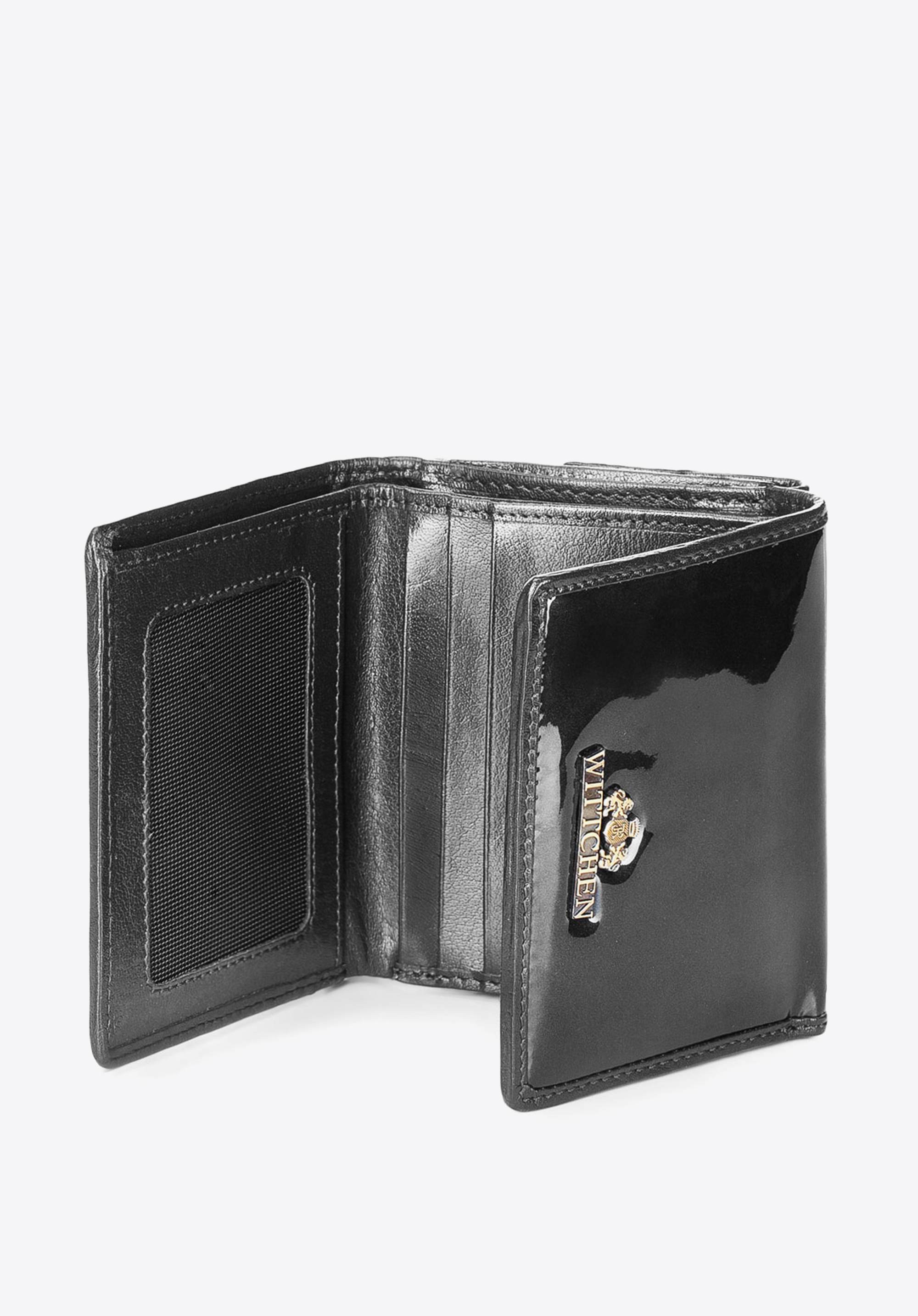 skóry lakierowanej o pięknym połysku. Głęboką kolorystykę przełamuje złoty akcent w postaci blaszki z herbem WITTCHEN. Rozkładany model został wyposażony w przydatną funkcję ochrony kart.