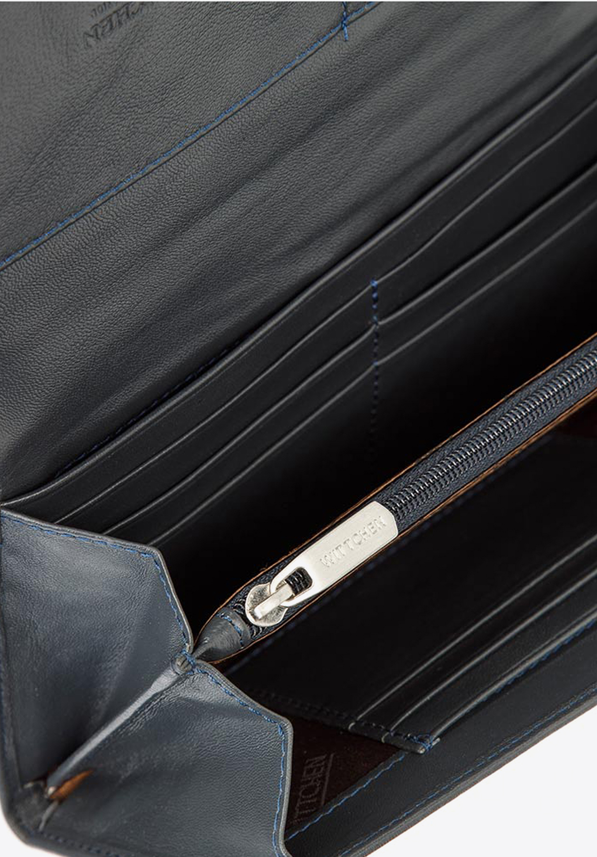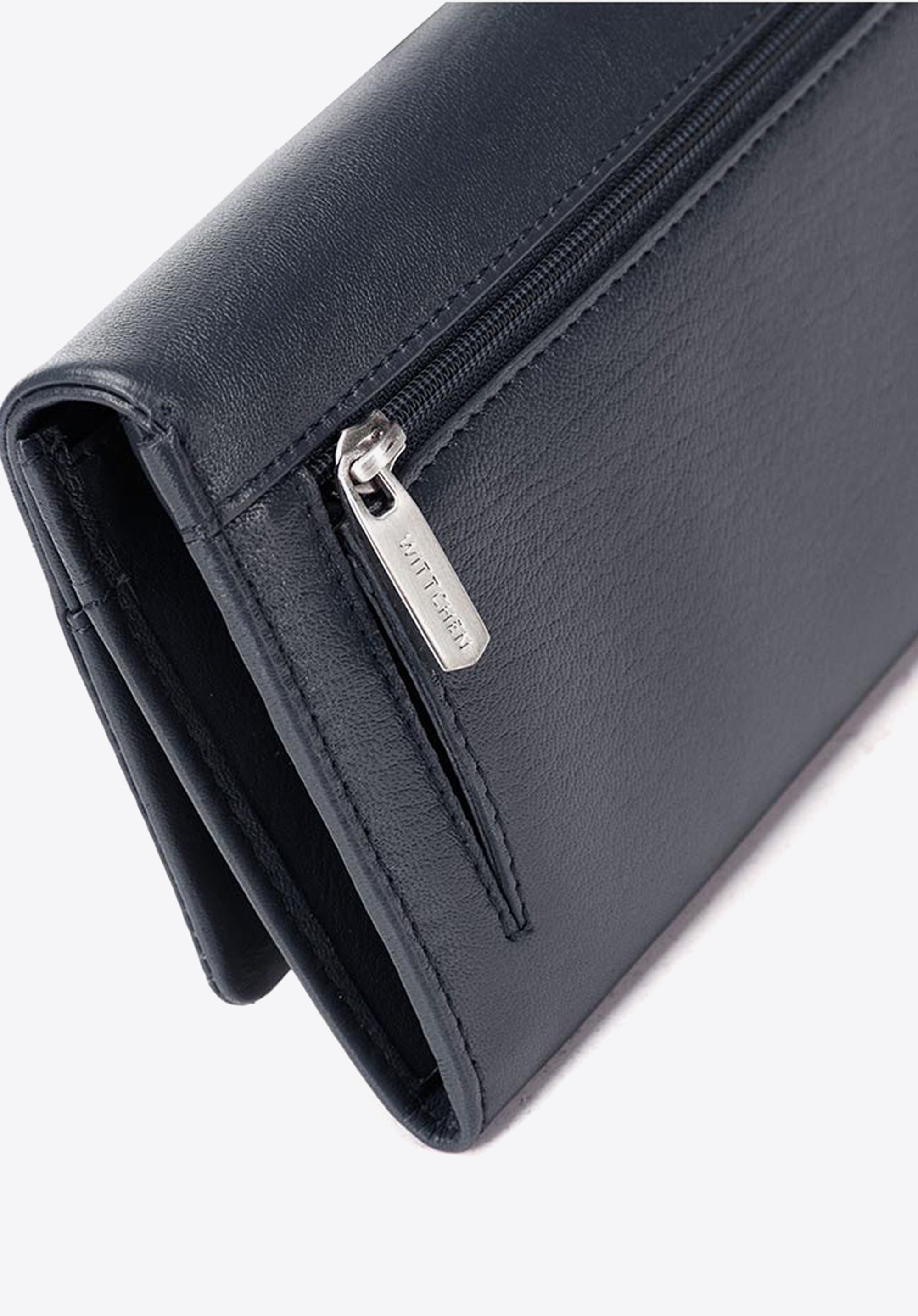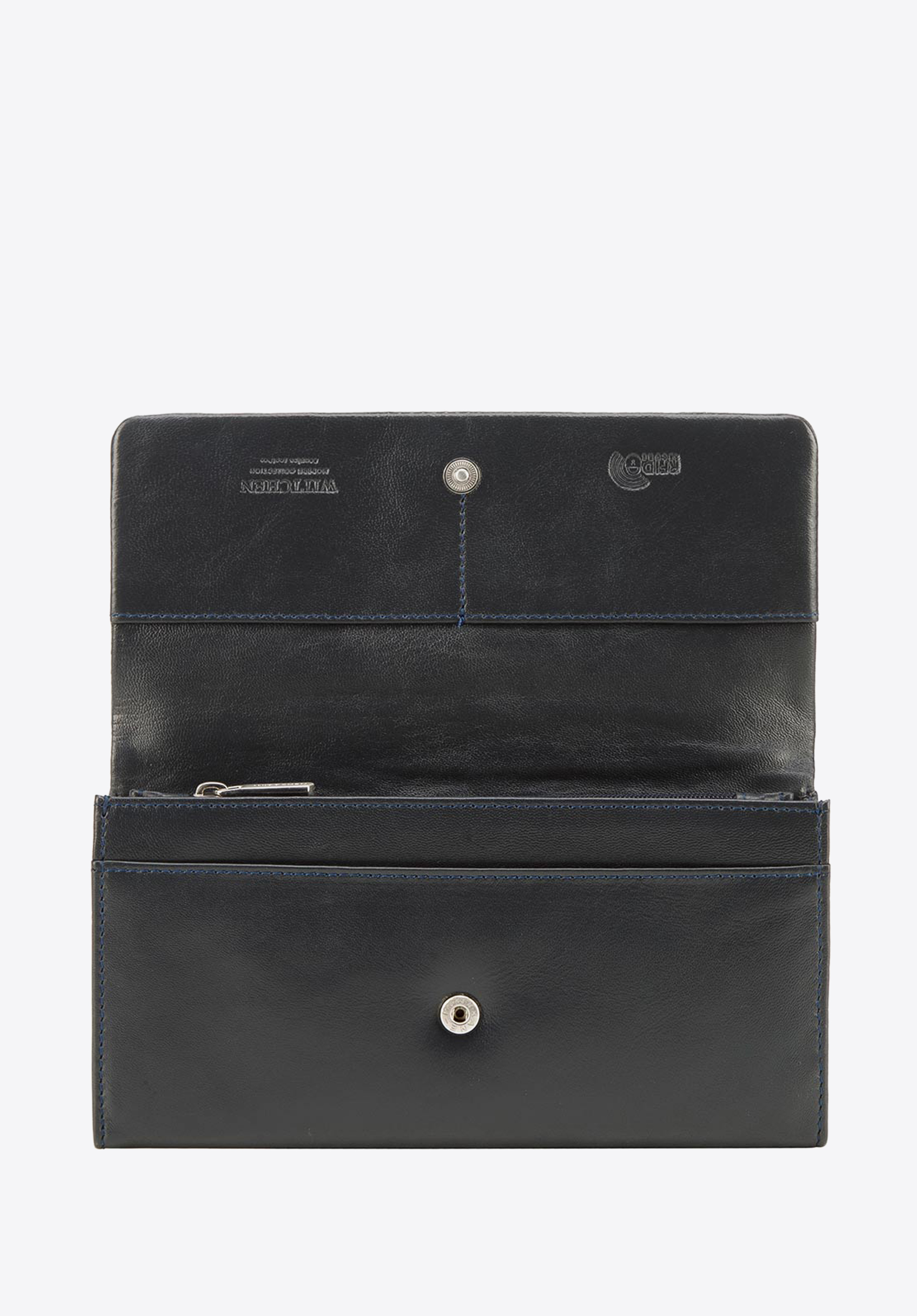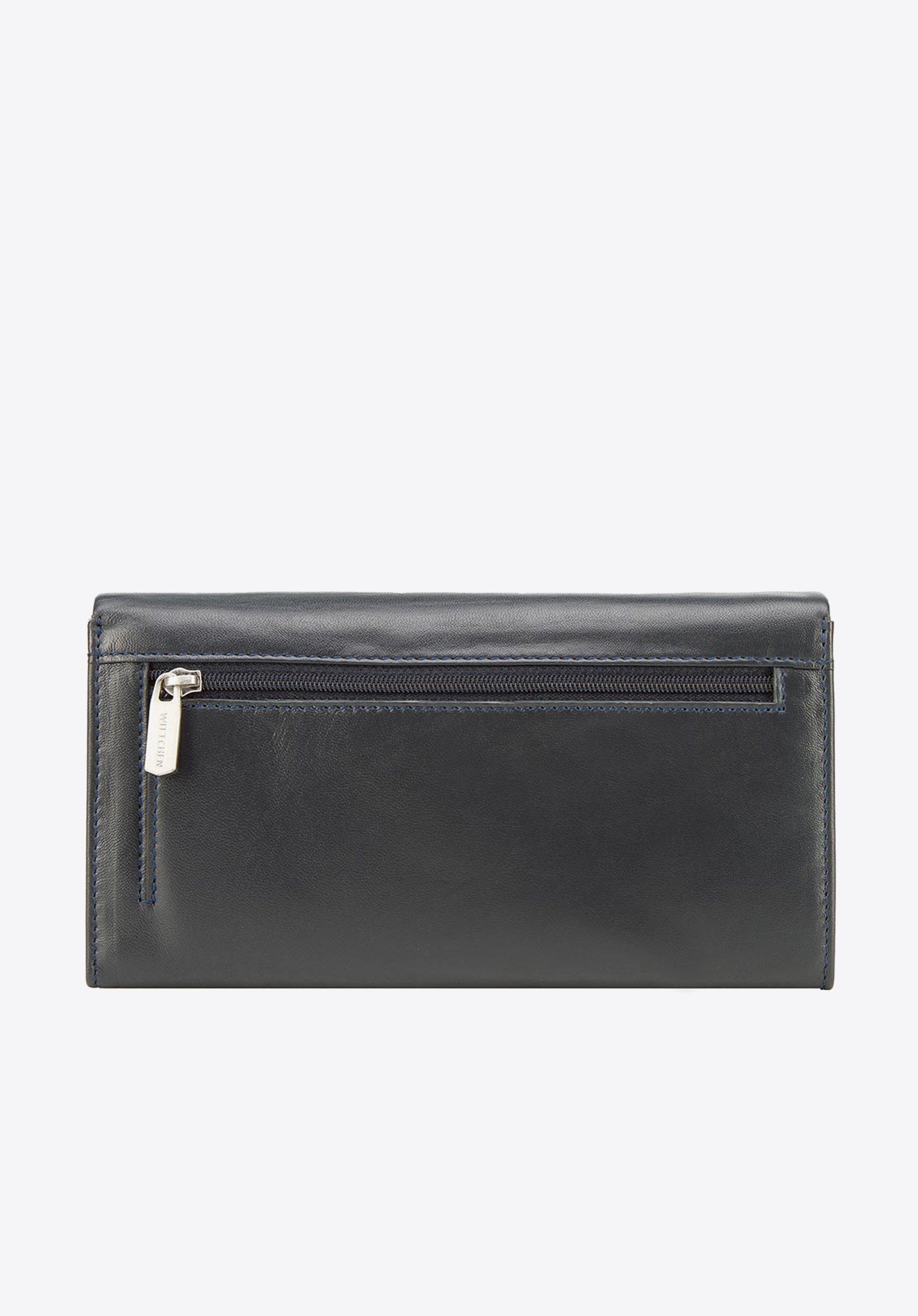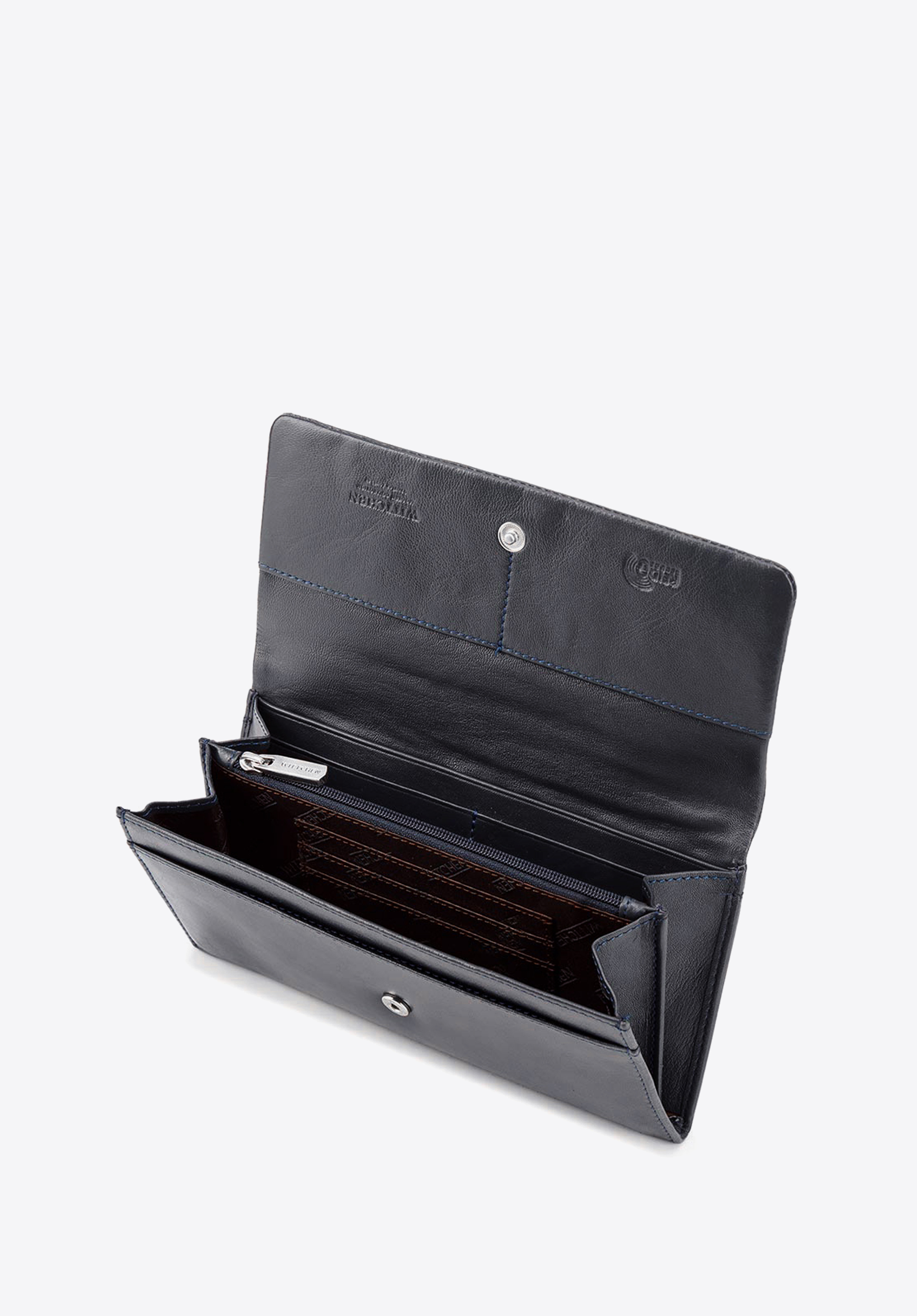 Klasyczny portfel o eleganckim, podłużnym fasonie. Wygodnie trzyma się go w dłoni, a dzięki temu, że jest duży, bez problemu pomieści wszystko, co potrzebne. Otwiera się harmonijkowo, ukazując dwie duże przegrody rozdzielone zapinaną na suwak kieszonką. Wewnątrz ma liczne kieszonki na karty i inne drobiazgi, a także podłużną kieszeń na banknoty. Jest wyposażony w podszewkę z technologią RFID, która chroni karty przed kradzieżą danych. Ten damski portfel ze skóry podłużny z tłoczonym logo zapina na zatrzask. Z zewnątrz ma jeszcze jdną kieszonkę na suwak, na bilon lub inne rzeczy, które chcesz mieć pod ręką. Jest uszyty z najwyższej jakości miękkiej skóry naturalnej. Zdobi go dyskretne tłoczenie z logo WITTCHEN.