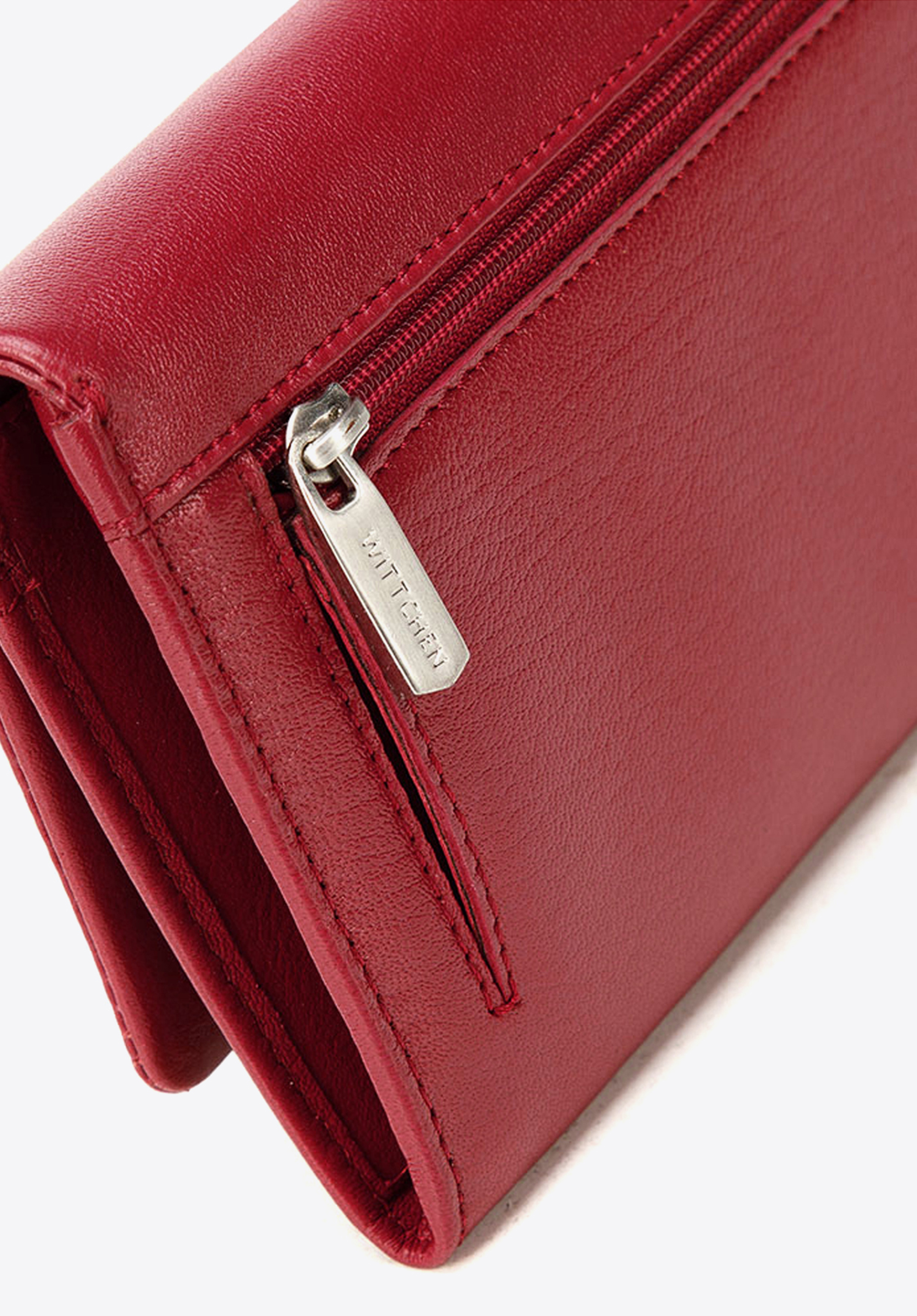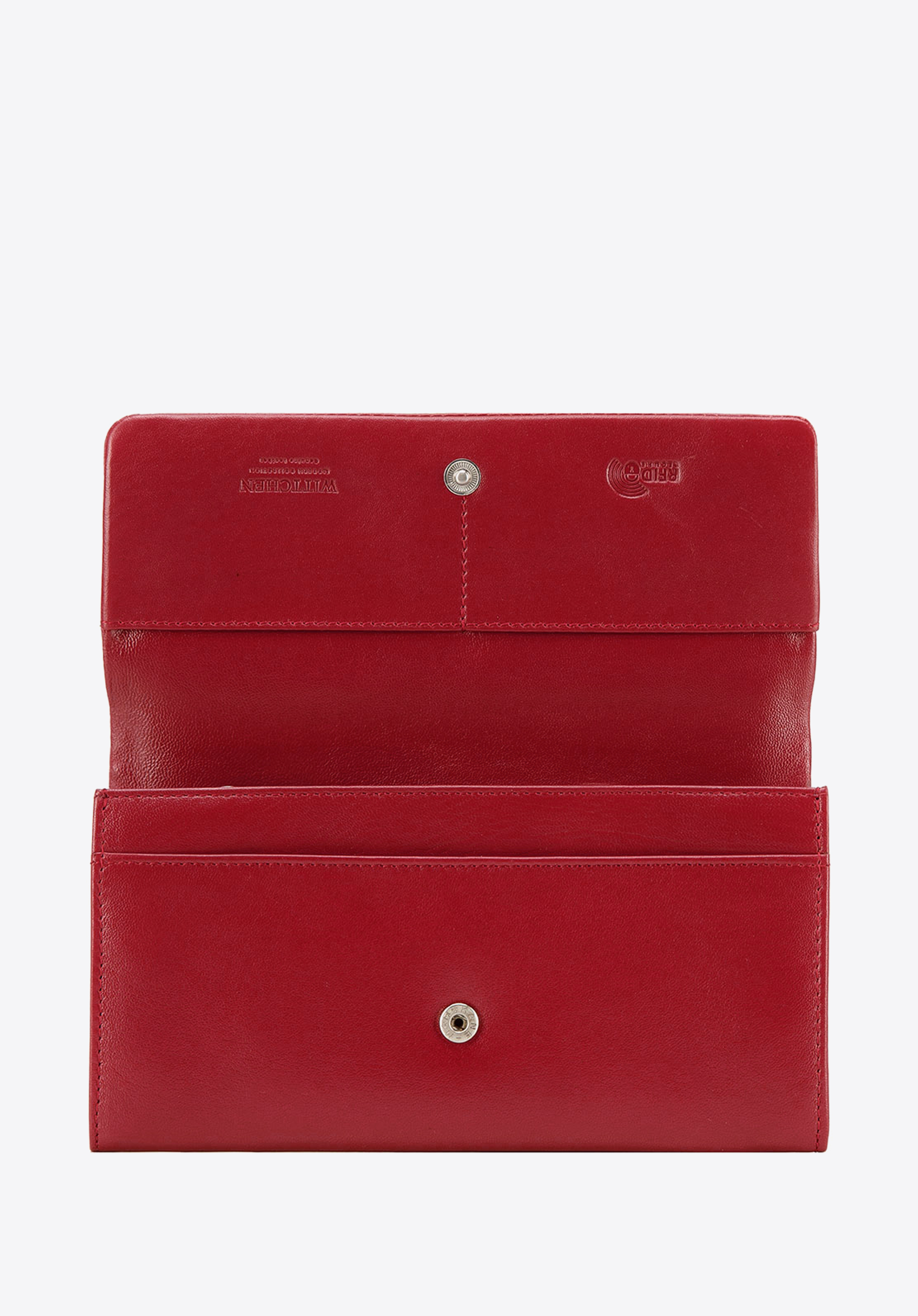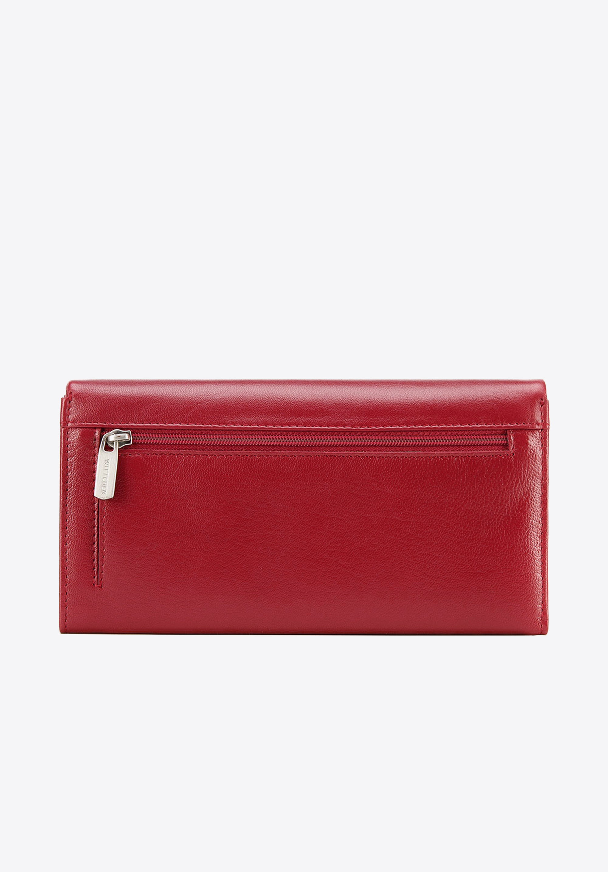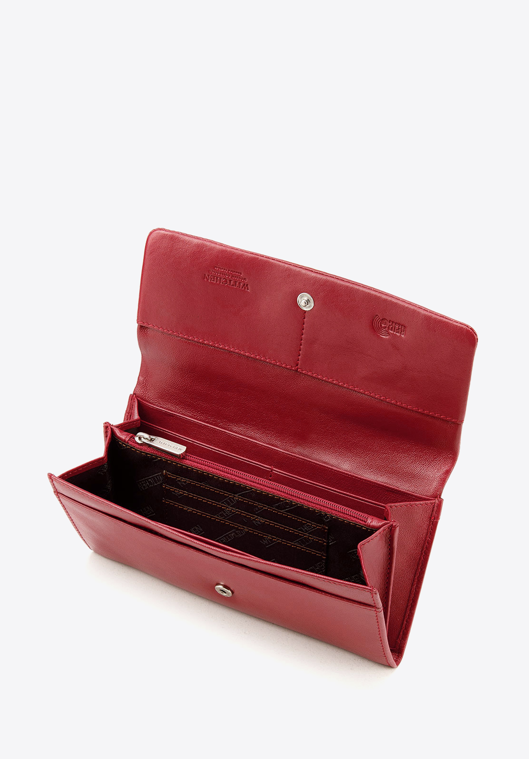 Klasyczny portfel o eleganckim, podłużnym fasonie. Wygodnie trzyma się go w dłoni, a dzięki temu, że jest duży, bez problemu pomieści wszystko, co potrzebne. Otwiera się harmonijkowo, ukazując dwie duże przegrody rozdzielone zapinaną na suwak kieszonką. Wewnątrz ma liczne kieszonki na karty i inne drobiazgi, a także podłużną kieszeń na banknoty. Jest wyposażony w podszewkę z technologią RFID, która chroni karty przed kradzieżą danych. Ten damski portfel ze skóry podłużny z tłoczonym logo zapina na zatrzask. Z zewnątrz ma jeszcze jdną kieszonkę na suwak, na bilon lub inne rzeczy, które chcesz mieć pod ręką. Jest uszyty z najwyższej jakości miękkiej skóry naturalnej. Zdobi go dyskretne tłoczenie z logo WITTCHEN.