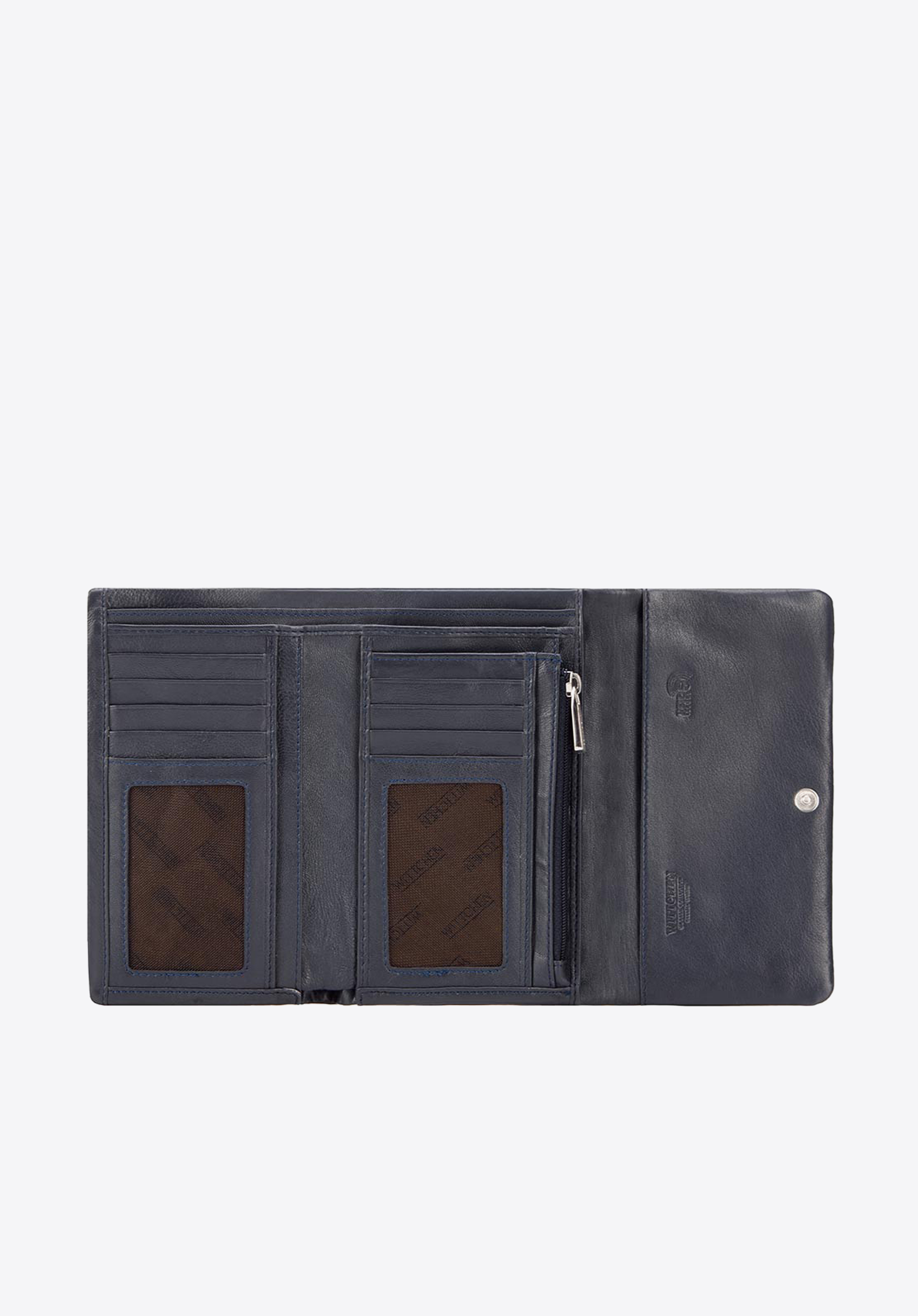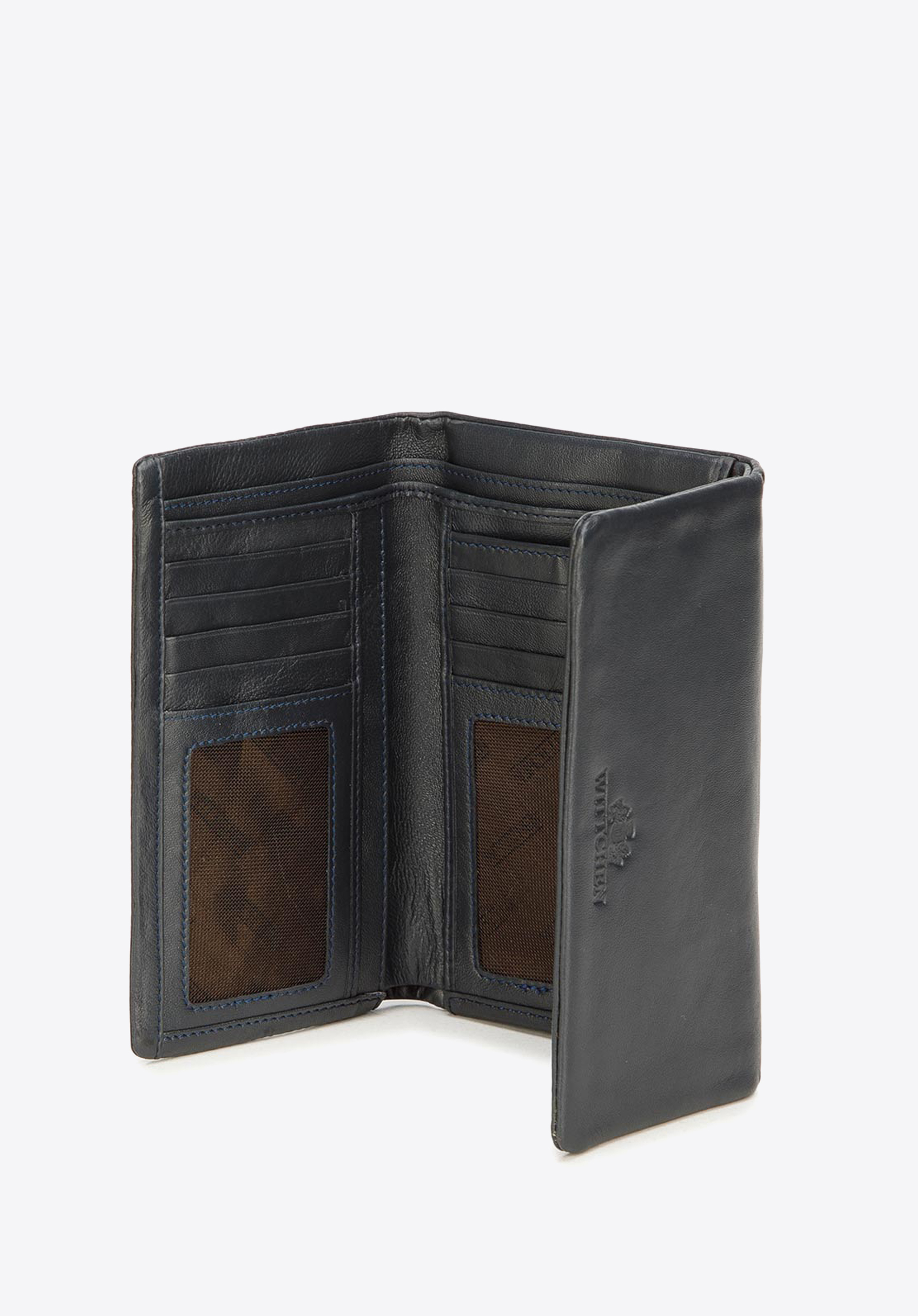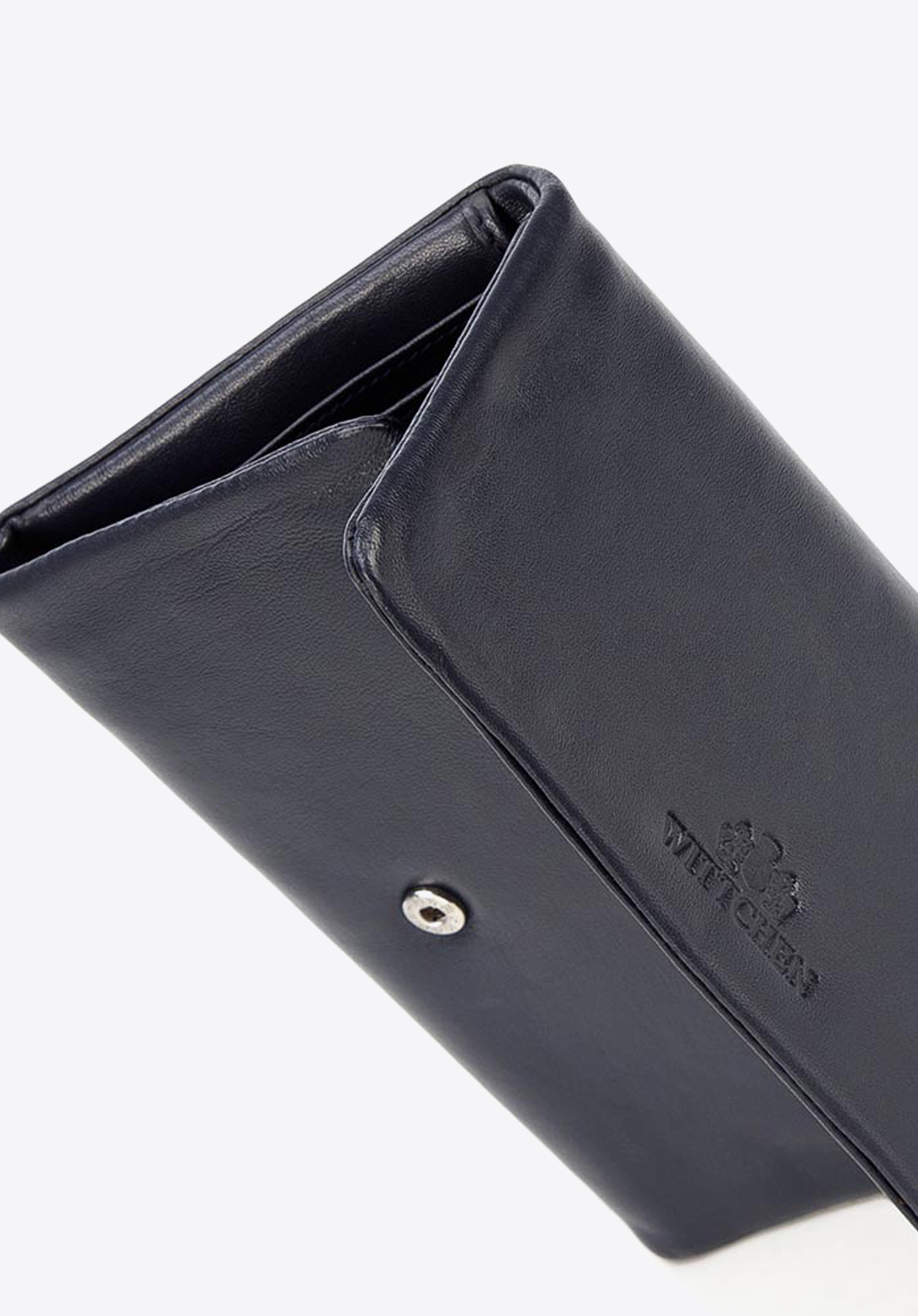 Elegancki portfel o pięknych, prostych liniach. Jest zgrabny i dobrze trzyma się go w dłoni, a mimo to pomieści naprawdę dużo. Ma dwie głębokie przegrody wewnątrz, liczne kieszonki na karty i inne drobiazgi, a także wewnętrzną kieszeń na bilon. Do siateczkowych kieszeni wsuniesz to, co chcesz mieć na widoku, na przykład zdjęcia bliskich. Podszewka ma funkcję RFID, czyli chroni karty przed sczytaniem danych. Portfel składa się na trzy i zapina na zatrzask. Z zewnątrz jest jeszcze jedna zapinana na suwak kieszonka, w której również możesz trzymać bilon. Portfel jest uszyty z wyjątkowo miękkiej i przyjemnej w dotyku skóry naturalnej i ma wytłoczone dyskretne logo WITTCHEN.