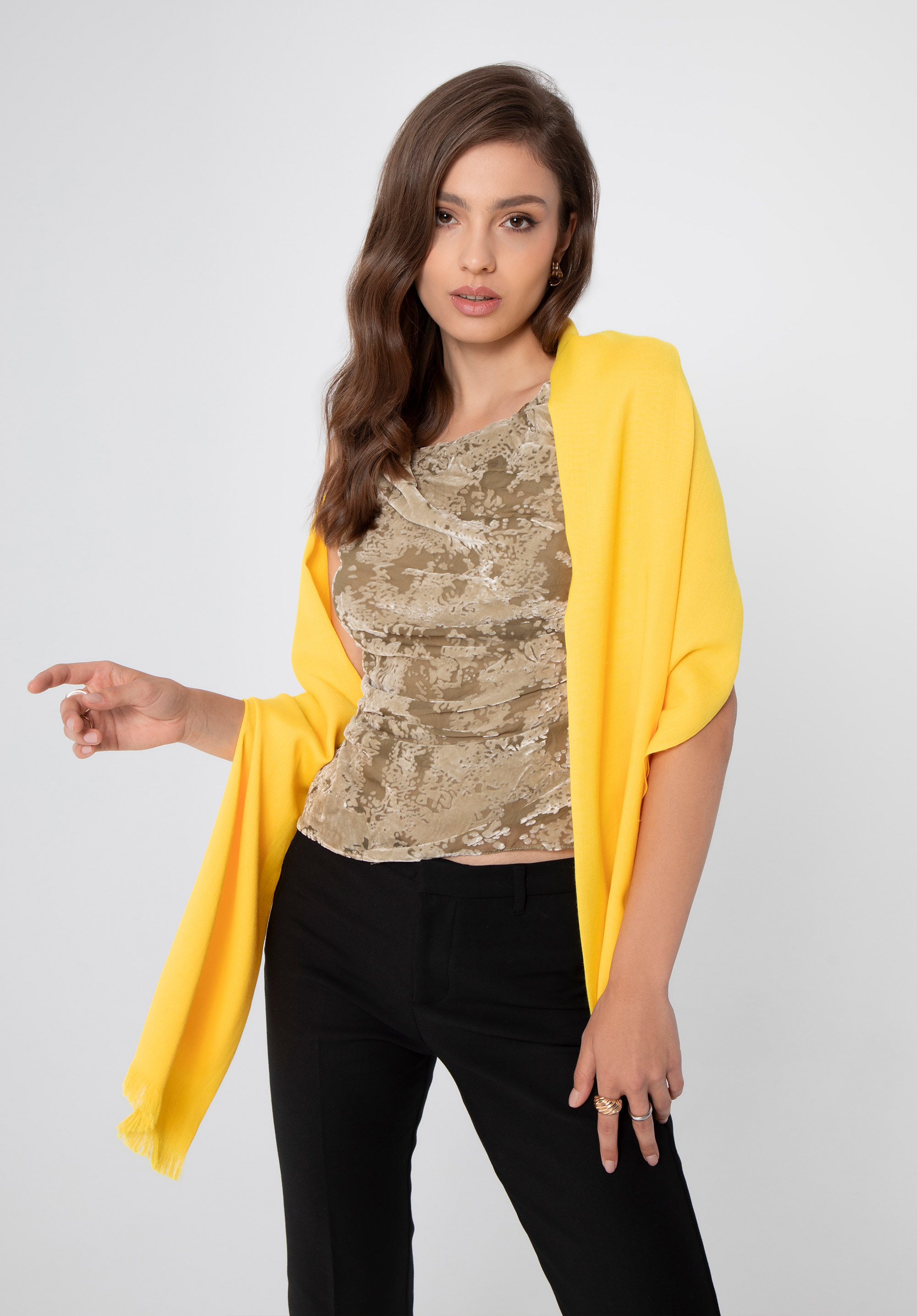 - Końce szala ozdobione małymi frędzelkami nadają subtelny charakter temu dodatkowi.