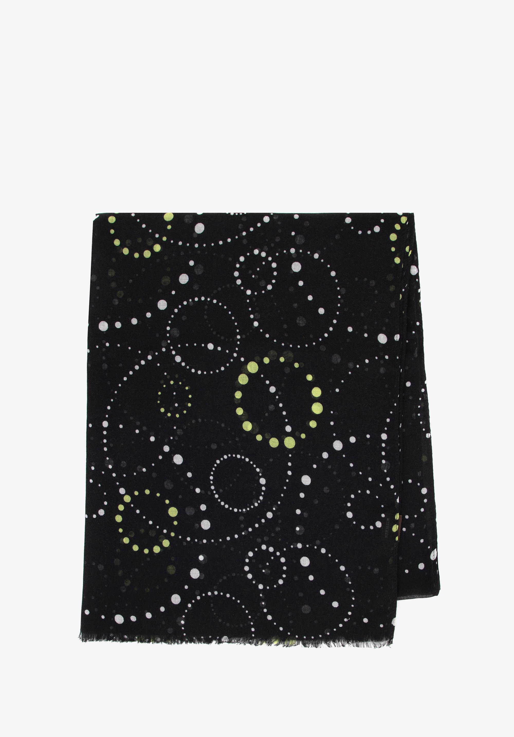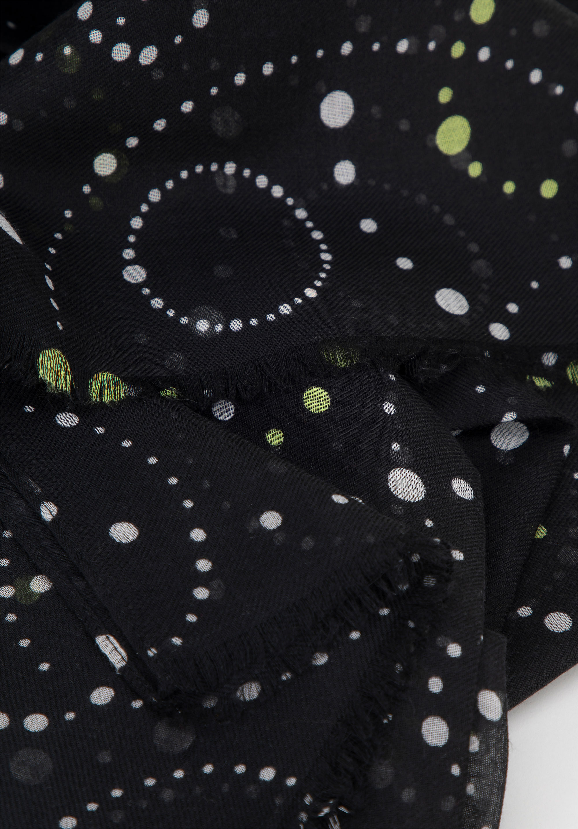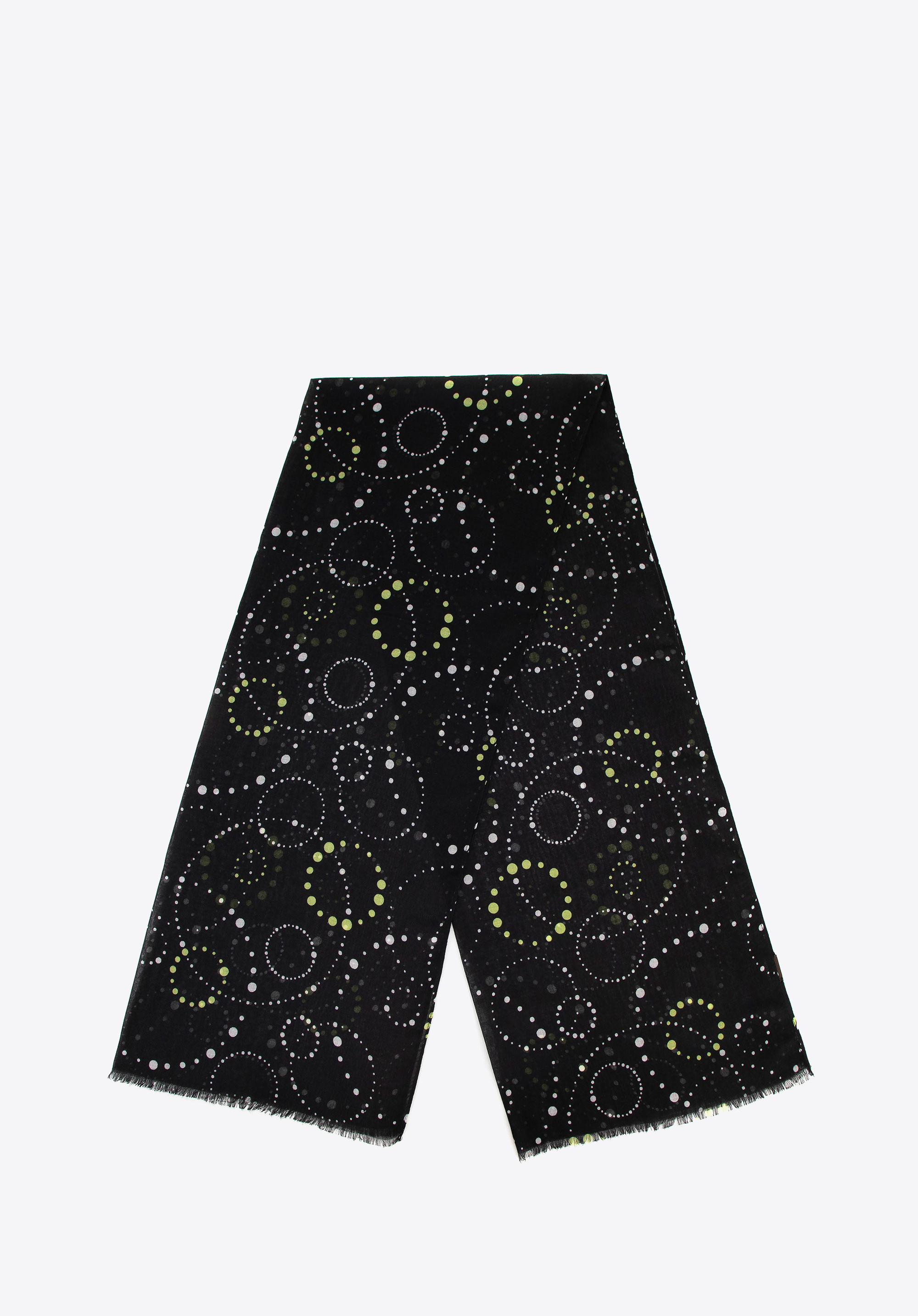 Ten wyjątkowy szal, wykonany z miękkiego i lekkiego poliestru, zachwyca delikatnością w dotyku oraz wyjątkowym wzornictwem. Geometryczne okręgi z drobnych kropek tworzą harmonijny motyw, który z łatwością dopełni zarówno codzienne stylizacje, jak i bardziej szykowne kreacje.
