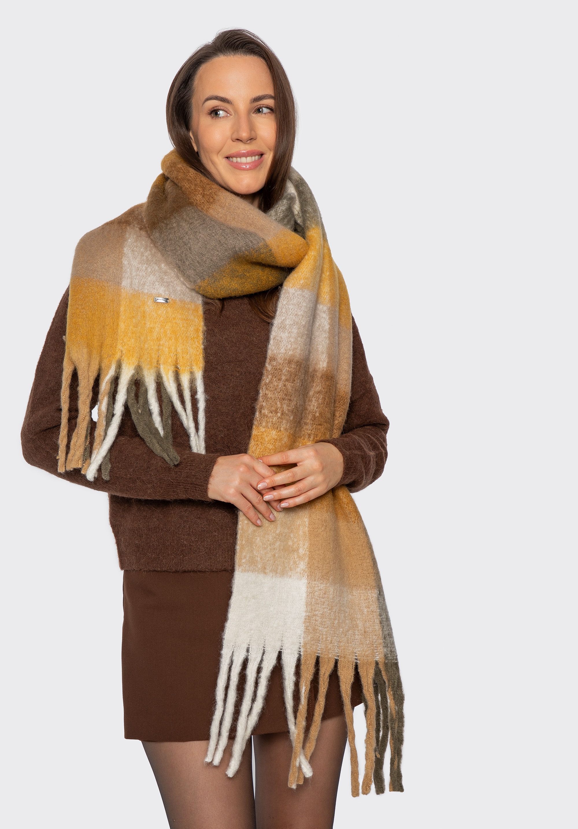 Damski szalik w wielokolorową kratkę sprawdzi się w sezonie jesienno-zimowym, gdy chcesz ożywić minimalistyczny płaszcz lub kurtkę i dodać stylizacji miękkiego, przytulnego wykończenia. Puszysta faktura, duży format i frędzle pozwalają układać go na wiele sposobów, a wielobarwna krata tworzy efekt dopracowanego akcentu bez wysiłku.