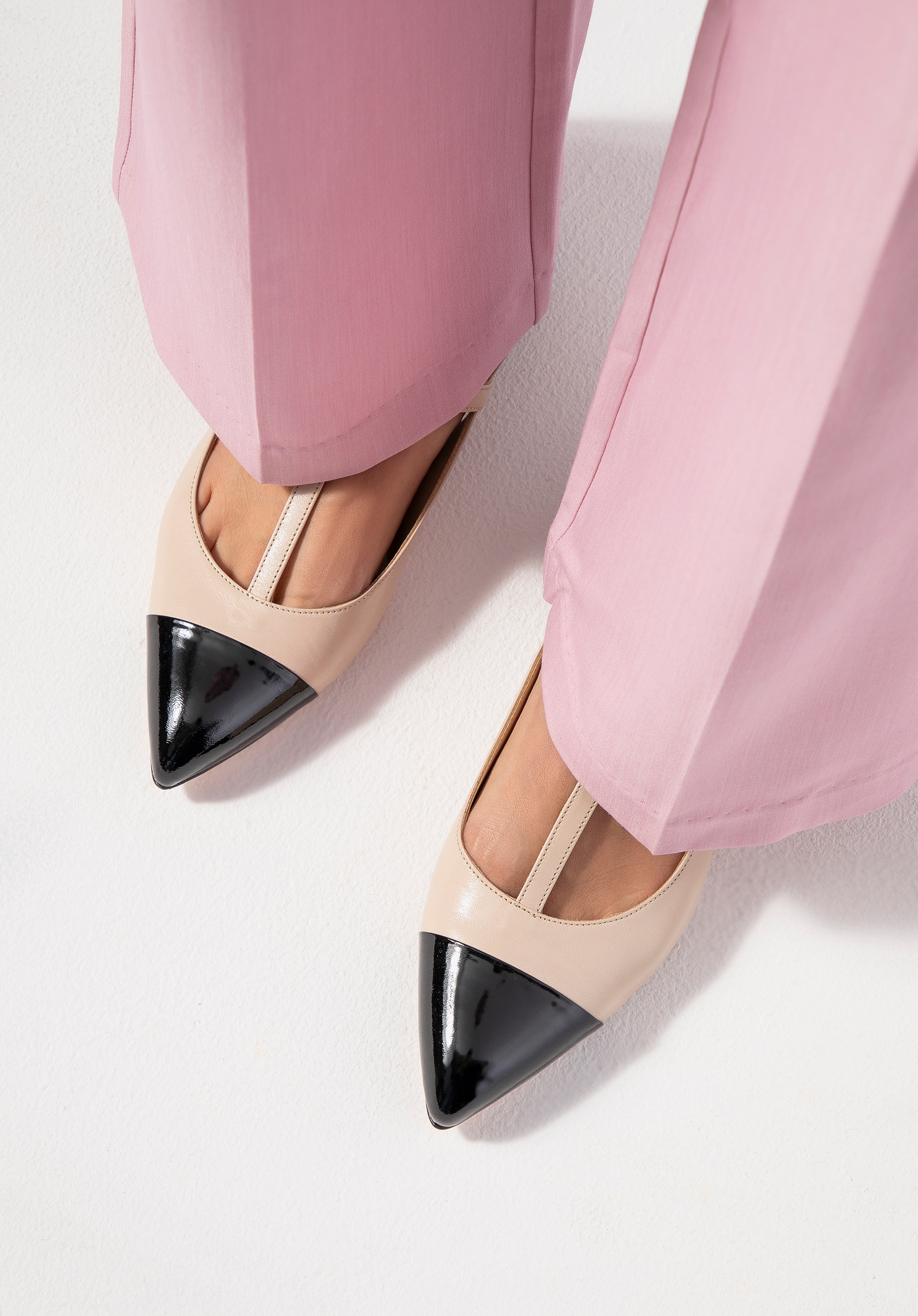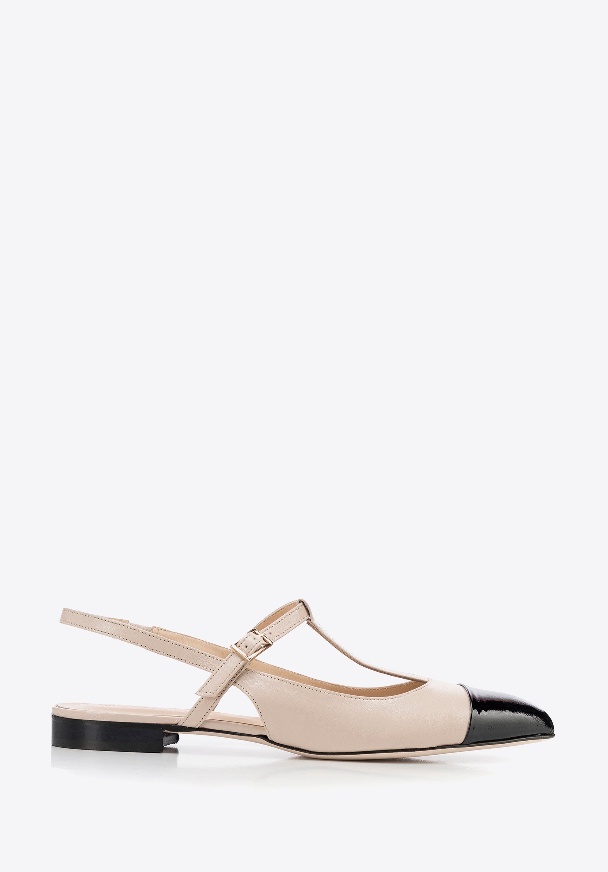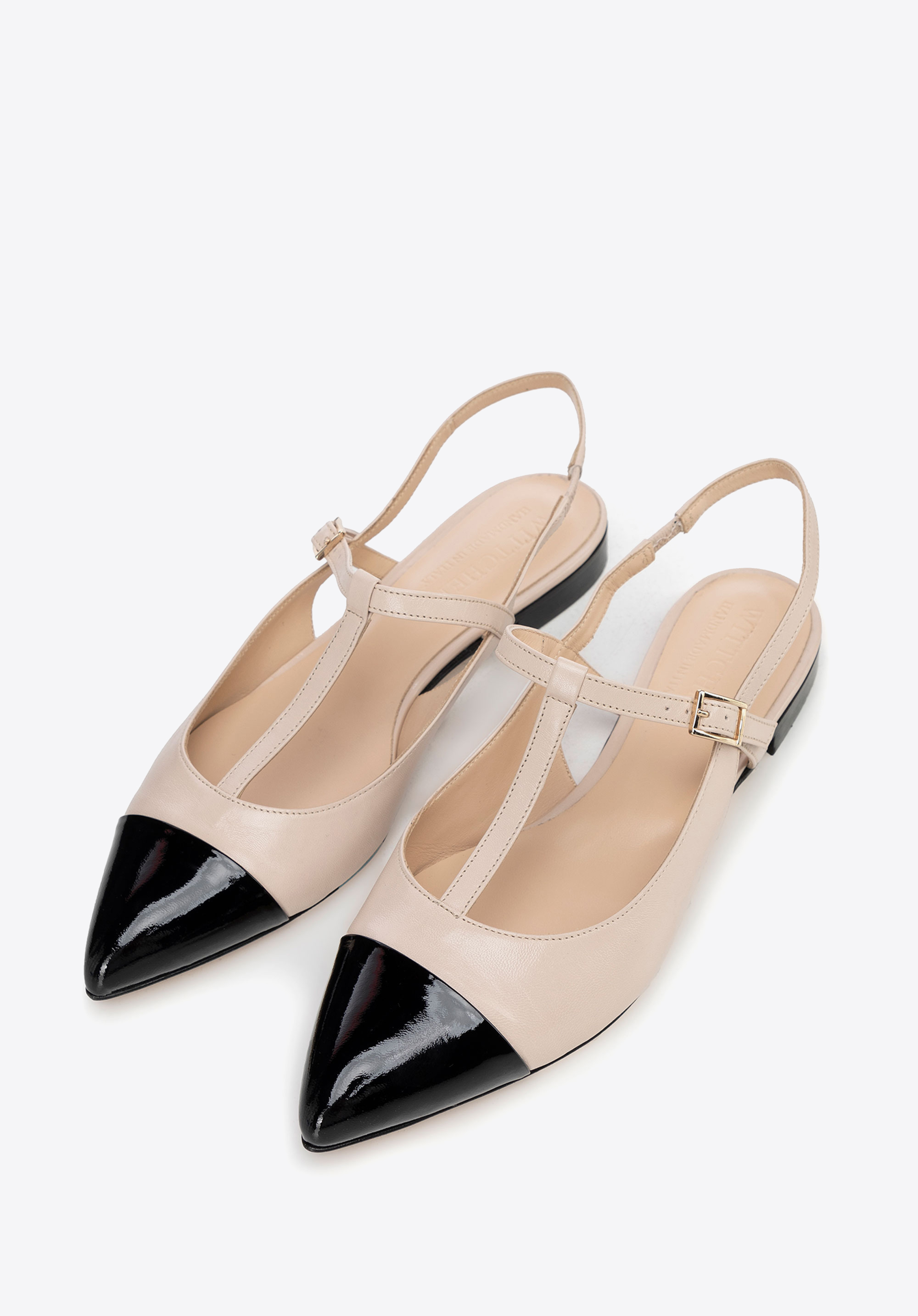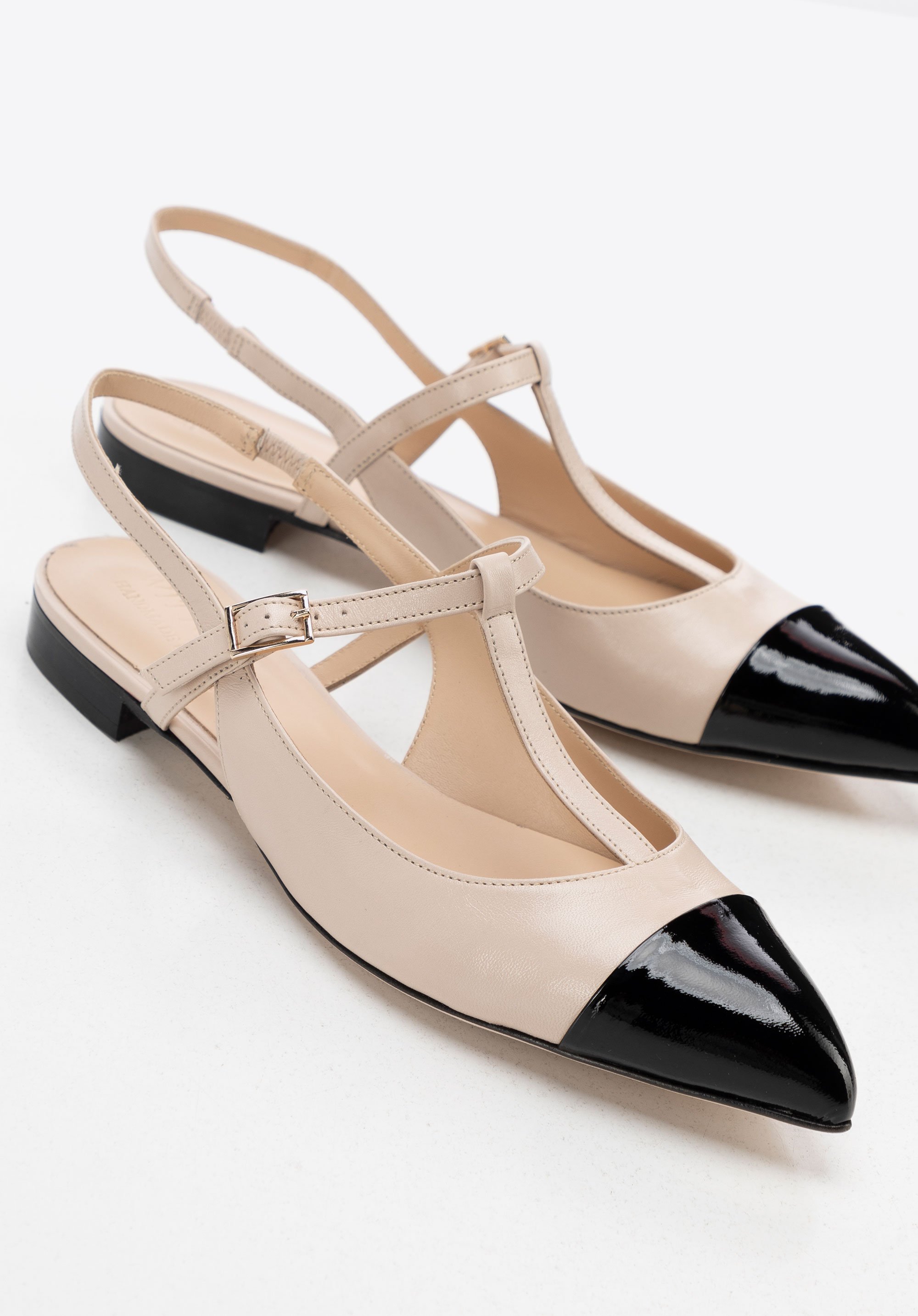 Te wyjątkowe baleriny to połączenie klasyki i nowoczesności. Wykonane w całości ze skóry naturalnej, zapewniają doskonały komfort noszenia. Matowa i lakierowana skóra subtelnie kontrastują, nadając im wyrafinowanego charakteru. Szpiczasty nosek optycznie wysmukla stopę, a delikatne paski zapinane na sprzączkę dbają o idealne dopasowanie. Model z odkrytą piętą i płaskim obcasem łączy wygodę z elegancją, sprawdzając się zarówno na co dzień, jak i na wyjątkowe okazje.