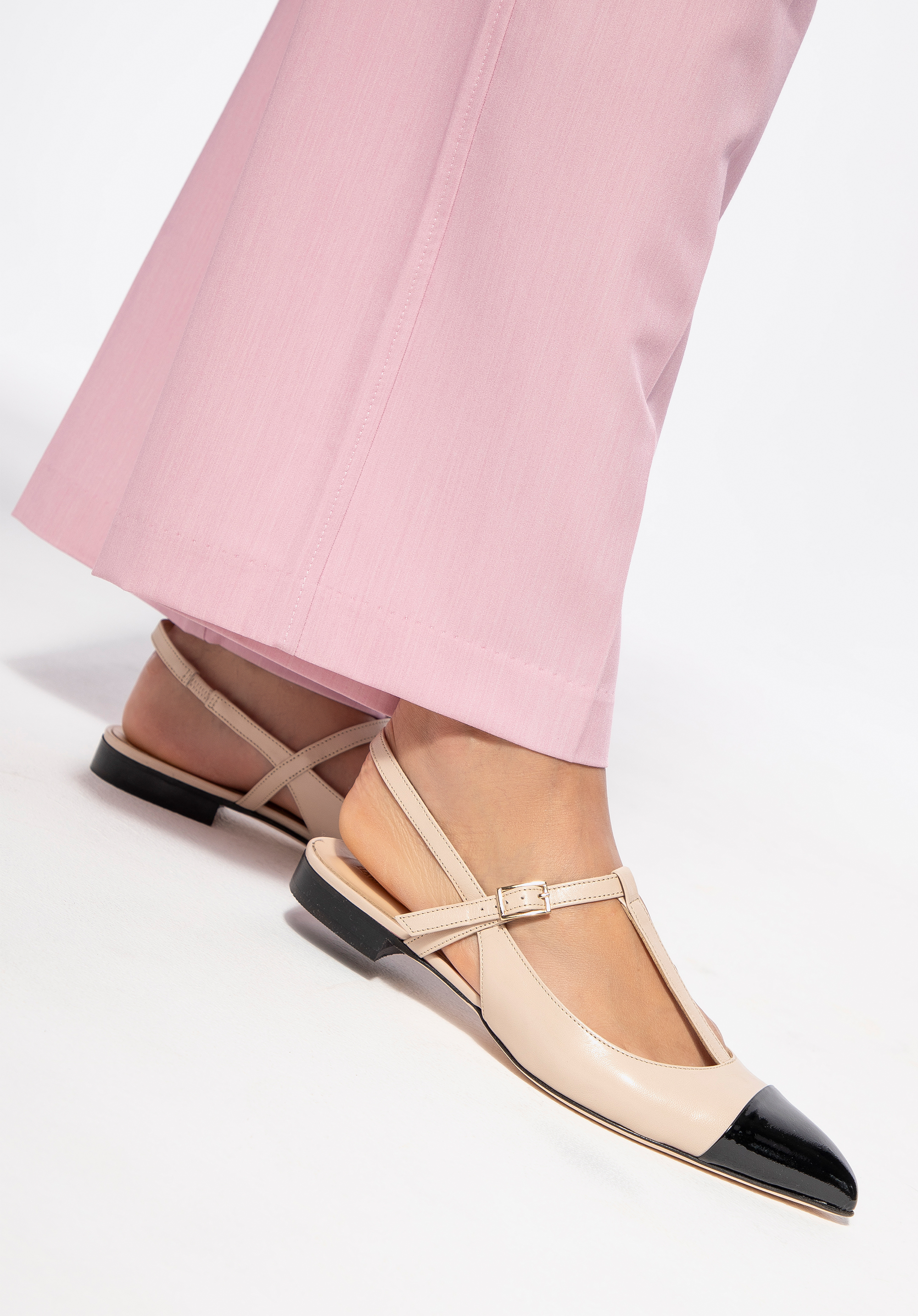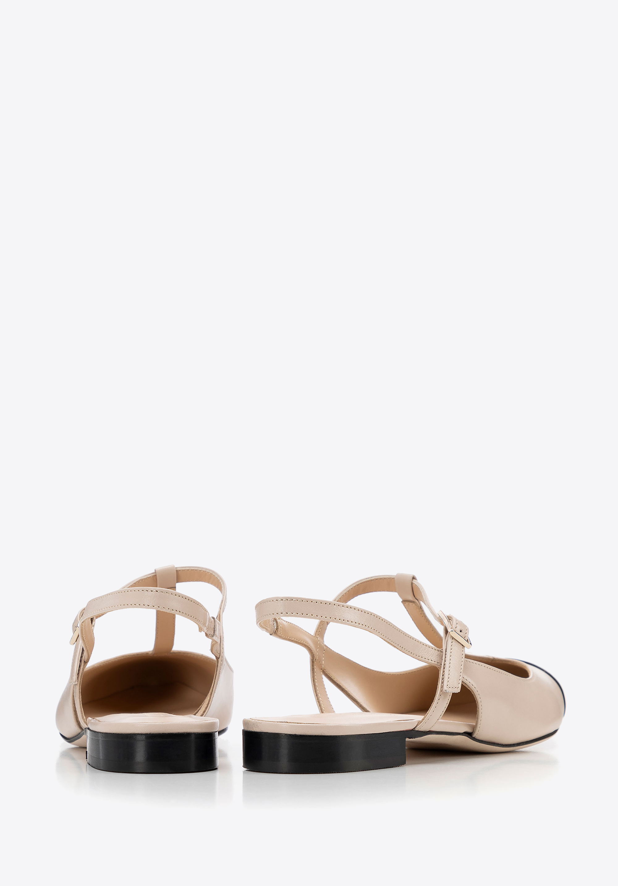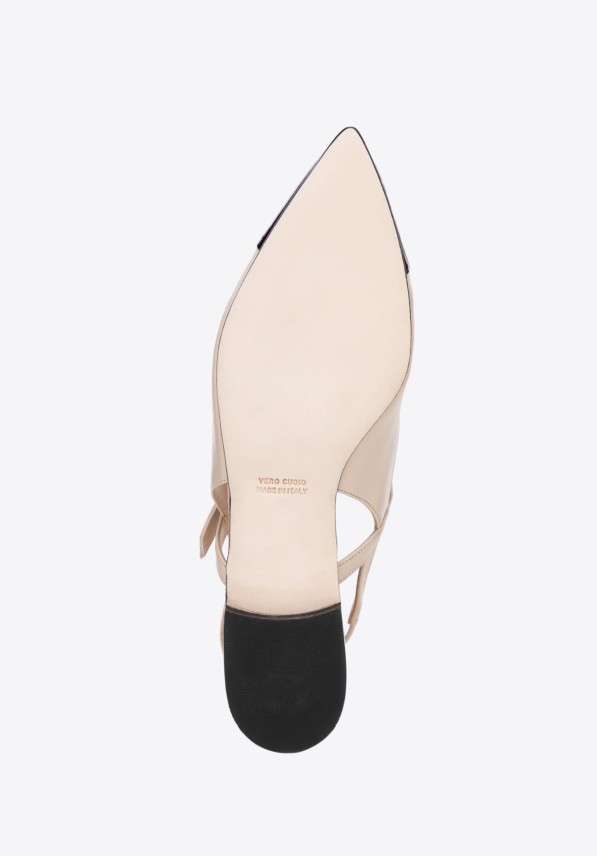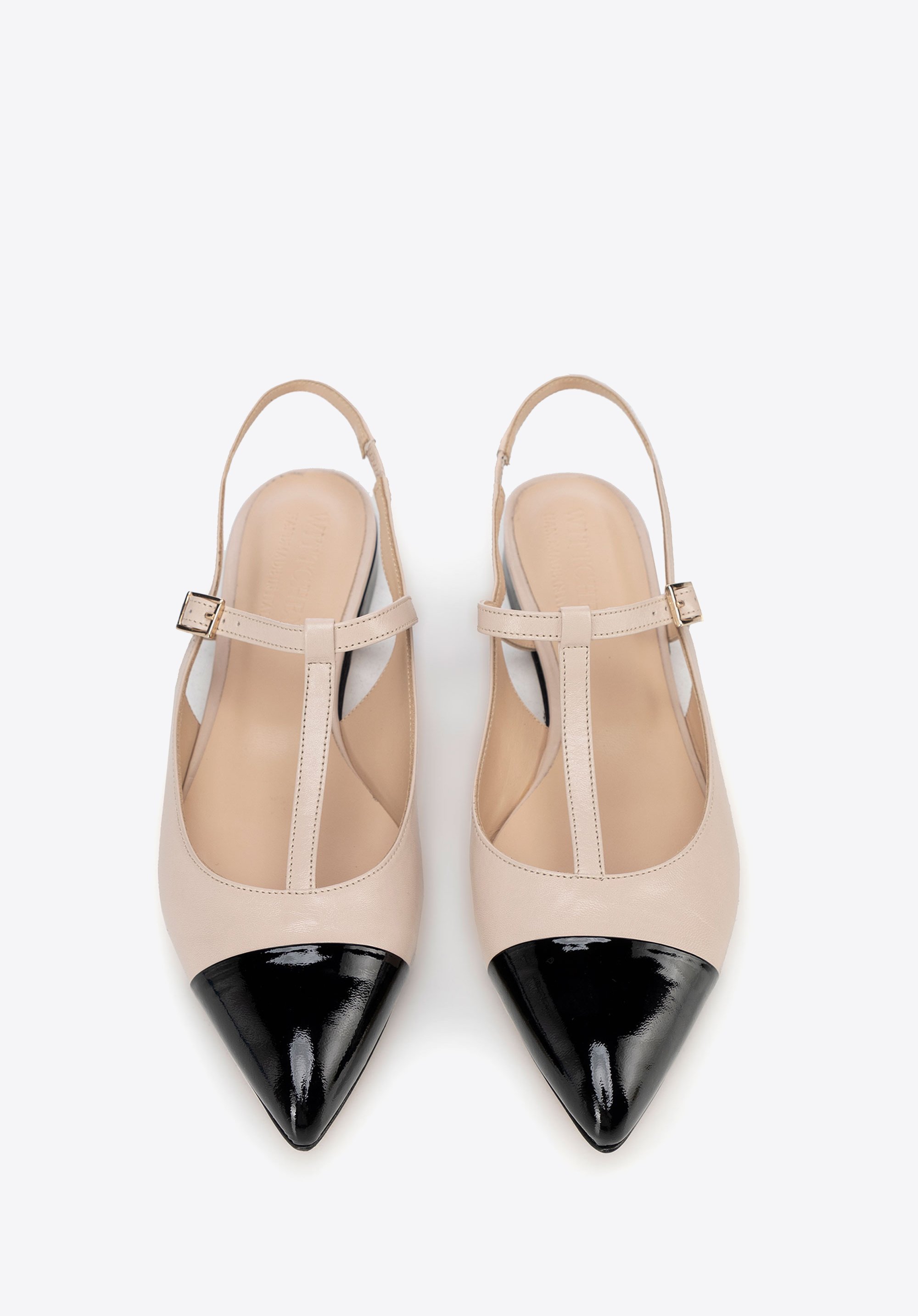 Te wyjątkowe baleriny to połączenie klasyki i nowoczesności. Wykonane w całości ze skóry naturalnej, zapewniają doskonały komfort noszenia. Matowa i lakierowana skóra subtelnie kontrastują, nadając im wyrafinowanego charakteru. Szpiczasty nosek optycznie wysmukla stopę, a delikatne paski zapinane na sprzączkę dbają o idealne dopasowanie. Model z odkrytą piętą i płaskim obcasem łączy wygodę z elegancją, sprawdzając się zarówno na co dzień, jak i na wyjątkowe okazje.