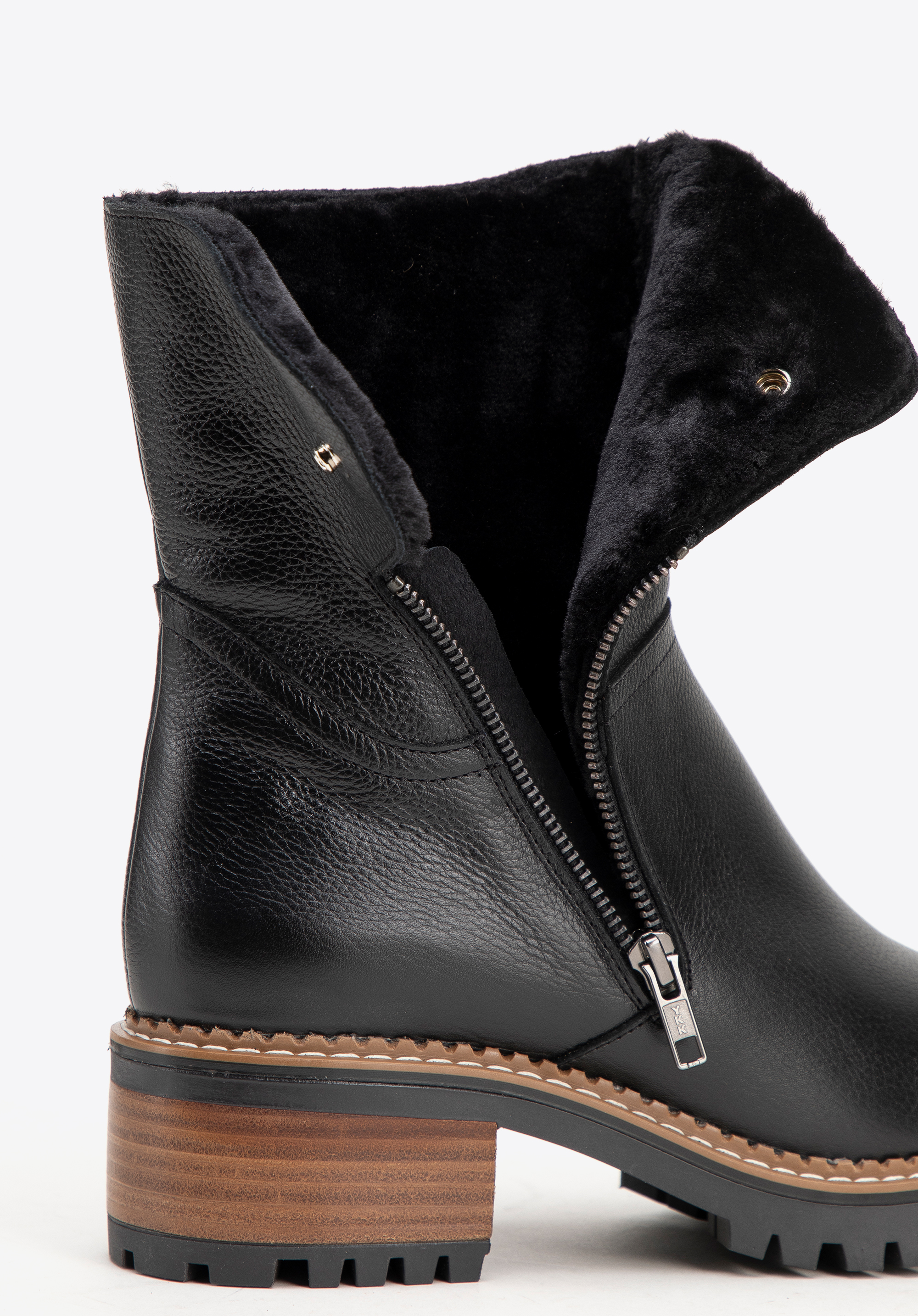 - Funkcjonalność: Boczne zapięcie na suwak oraz zatrzask ułatwiają zakładanie i zdejmowanie butów.