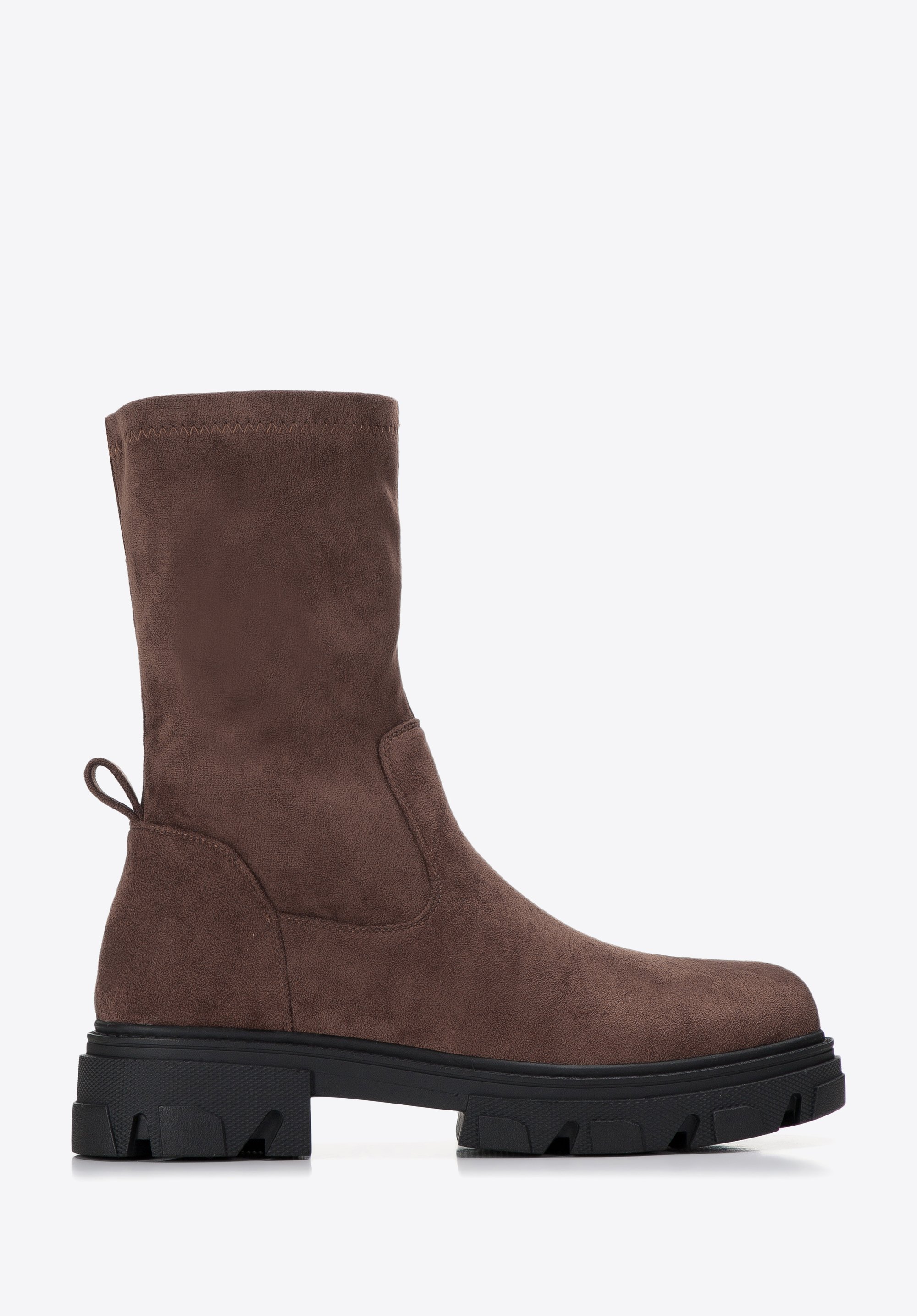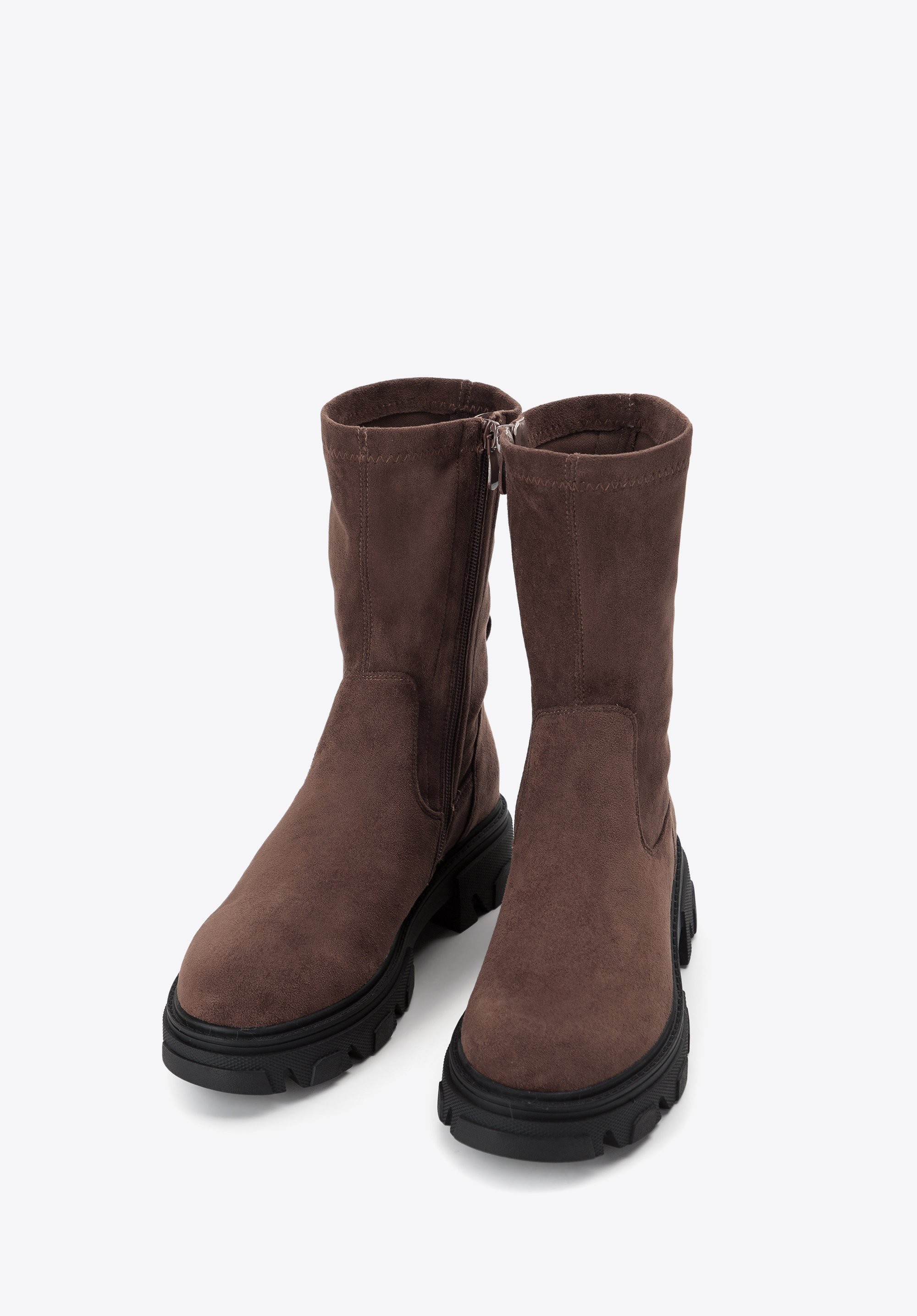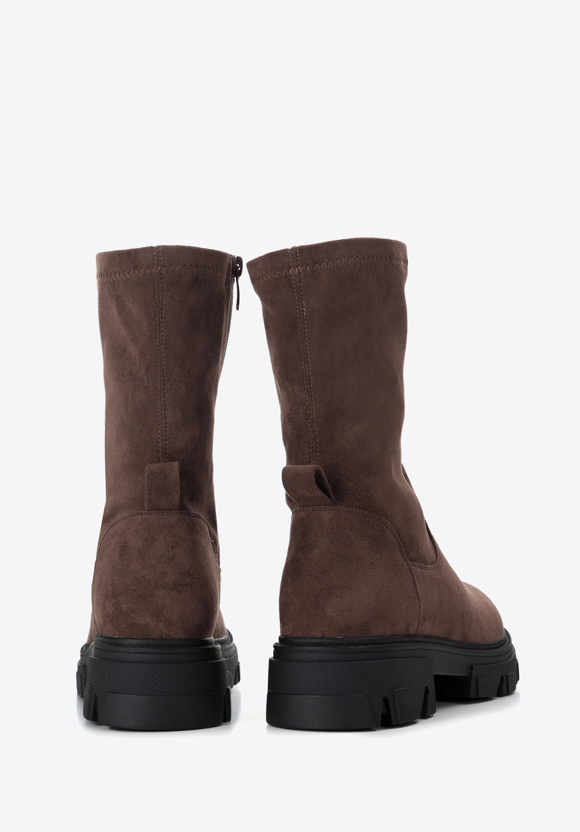 ze skóry ekologicznej przypominającej zamsz. Cholewka jest elastyczna i bardzo przyjemna w dotyku, więc ładnie dopasuje się do Twojej łydki i komfortowo będzie je nosić każdego dnia. Dodatkowo dzięki