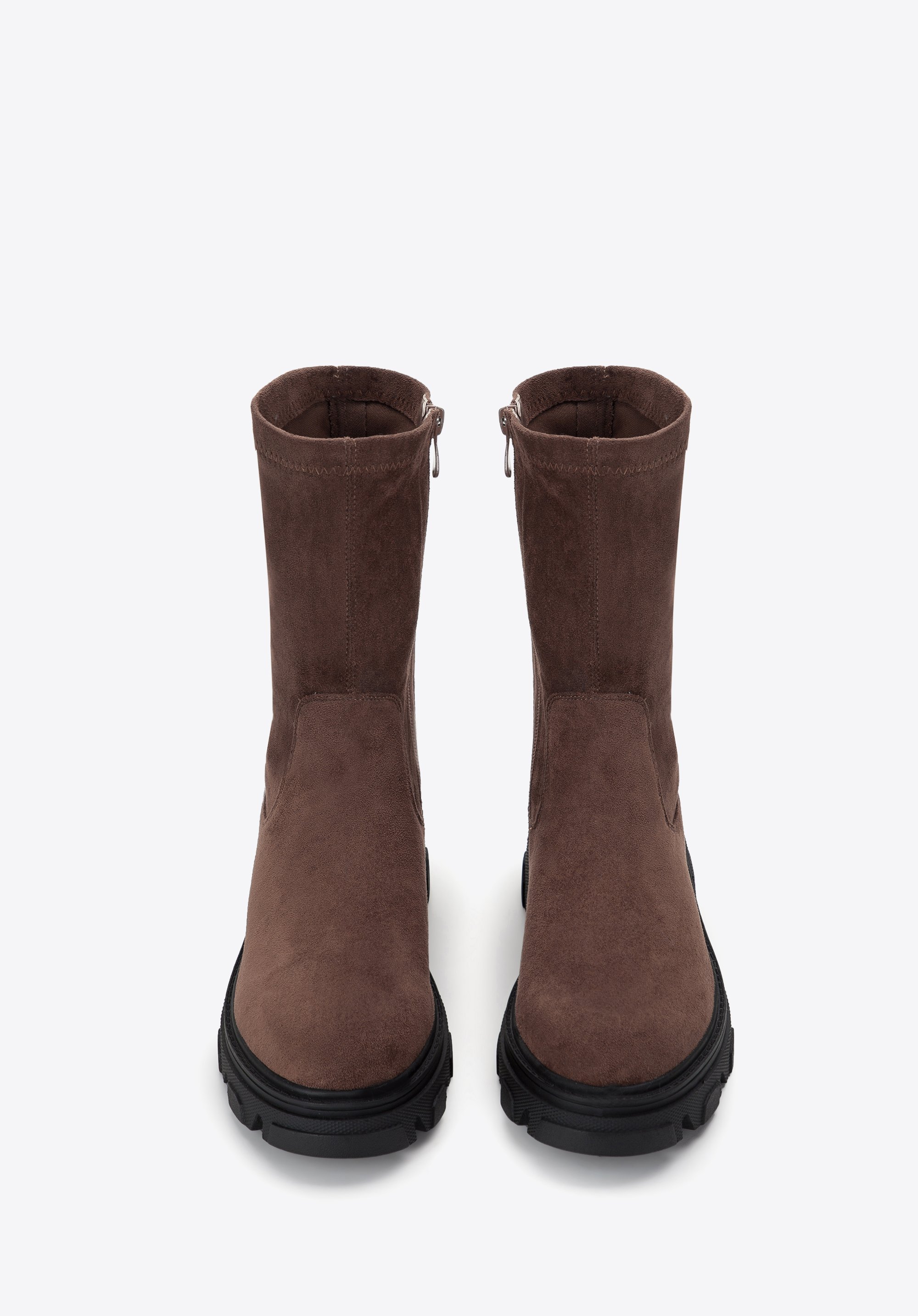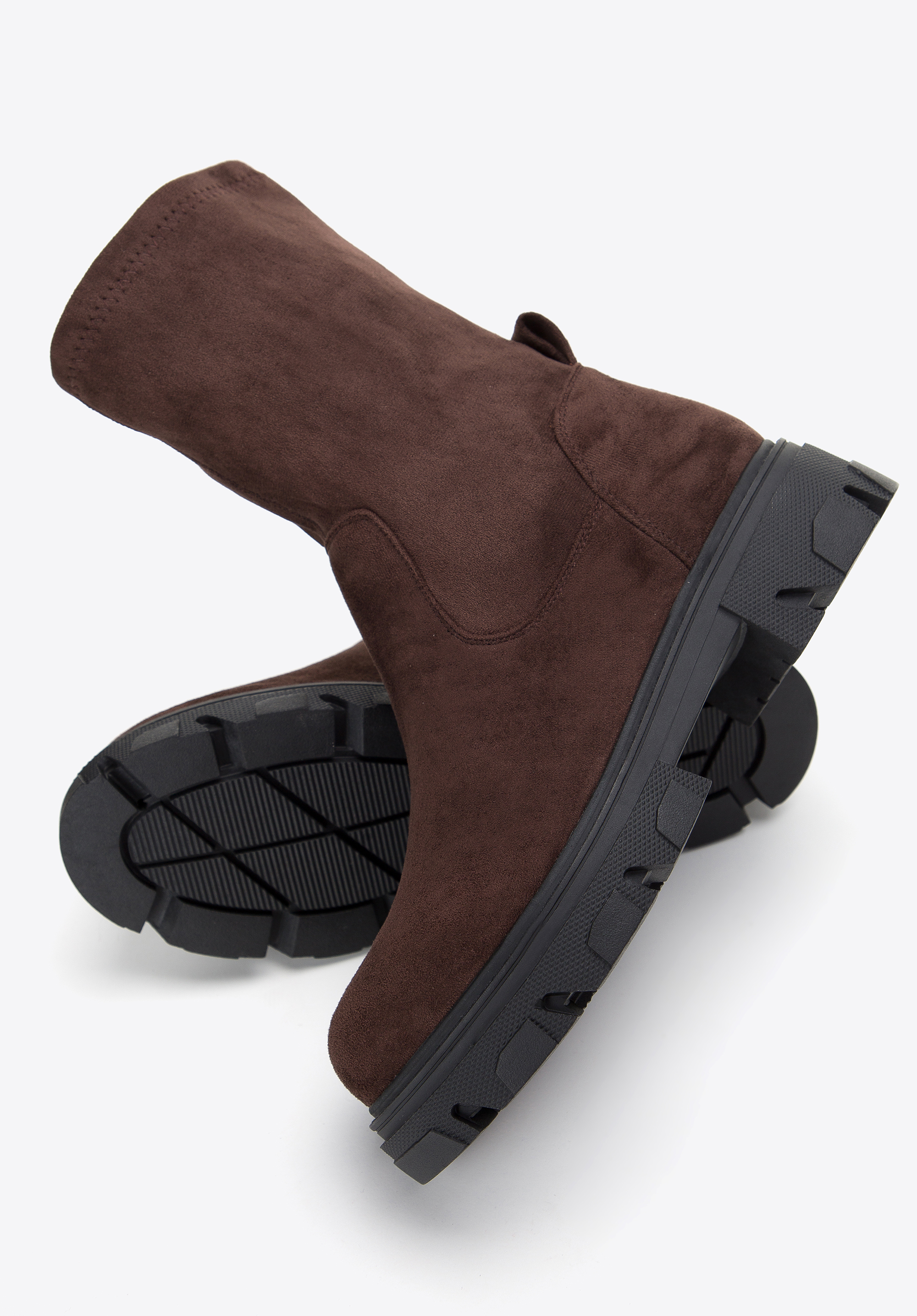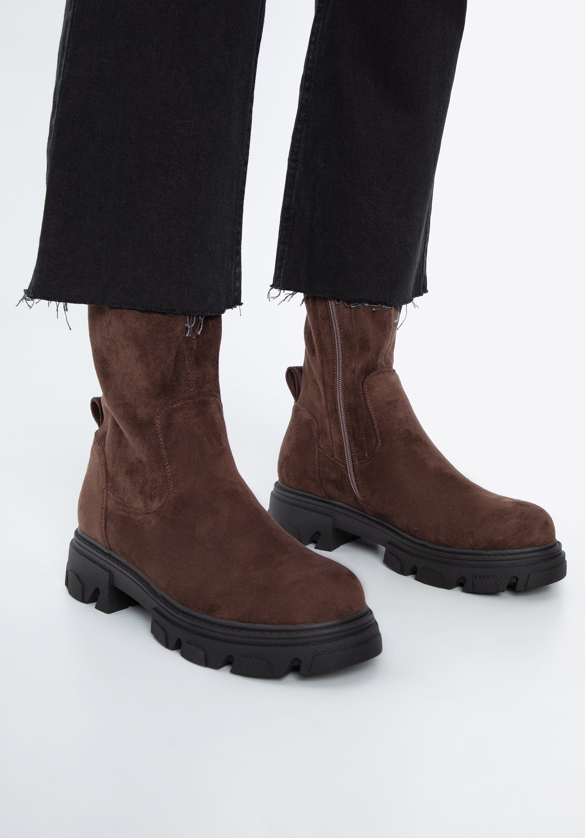 ze skóry ekologicznej przypominającej zamsz. Cholewka jest elastyczna i bardzo przyjemna w dotyku, więc ładnie dopasuje się do Twojej łydki i komfortowo będzie je nosić każdego dnia. Dodatkowo dzięki