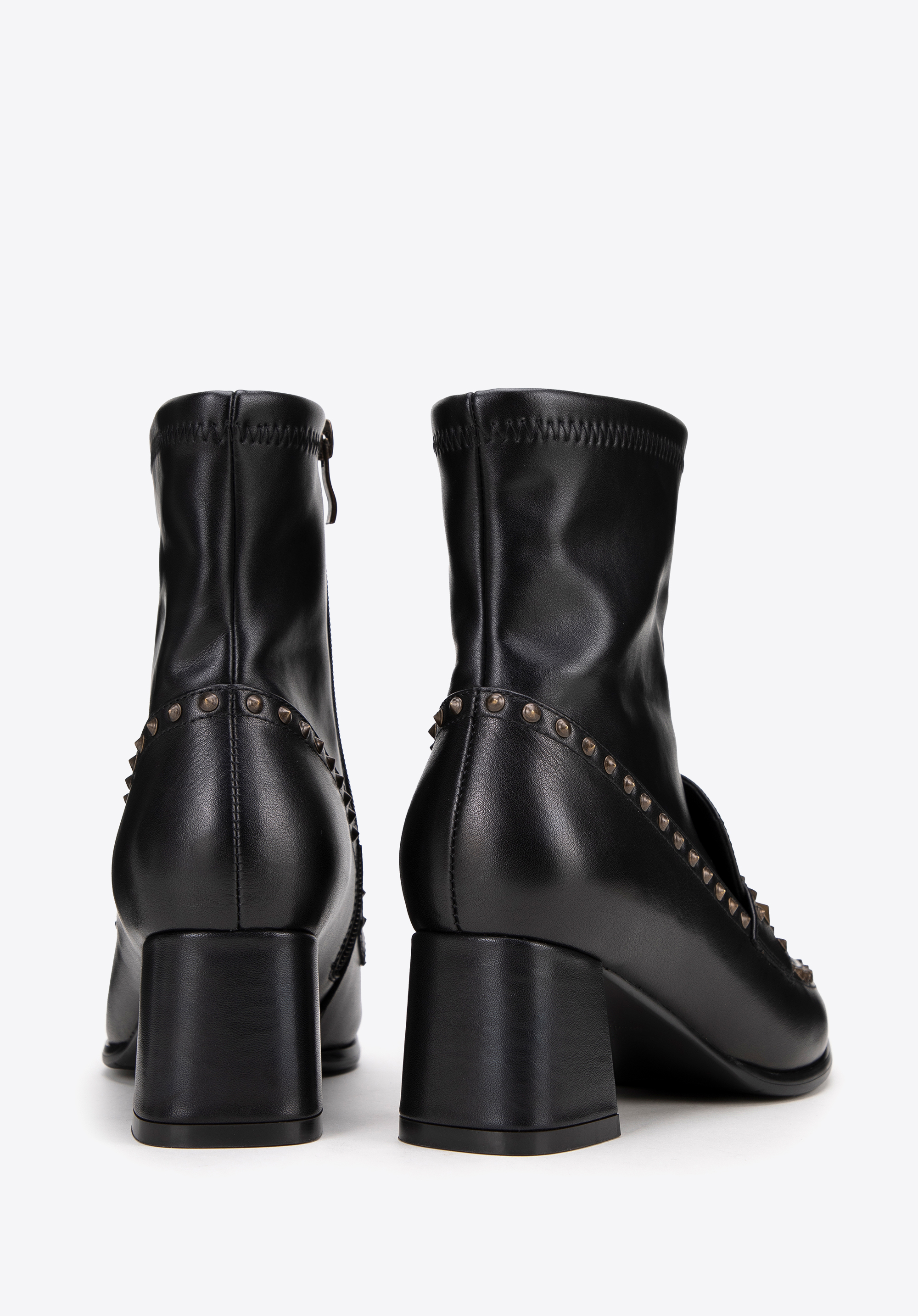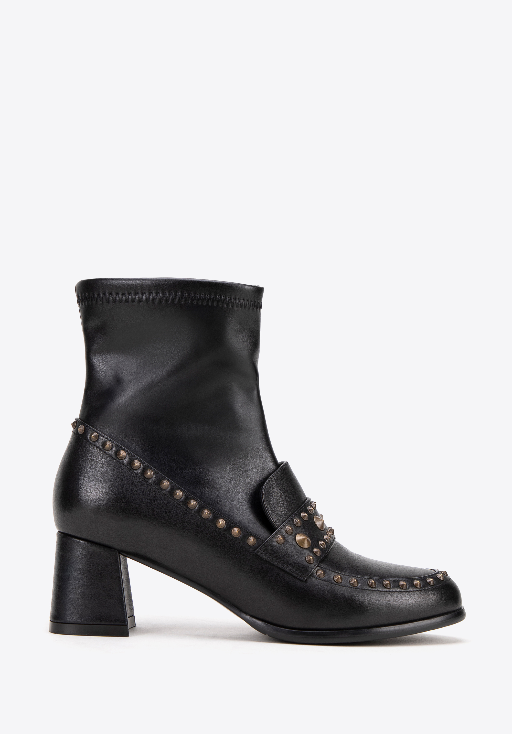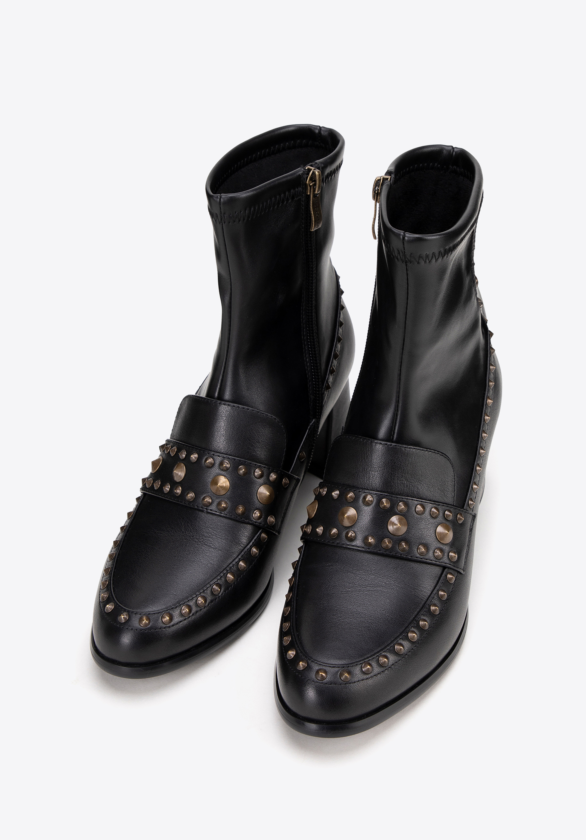 Dodaj elegancji do swojej garderoby dzięki tym stylowym damskim botkom, które łączą klasyczny design z nowoczesnymi detalami. Wykonane z połączenia skóry naturalnej i ekoskóry, te botki to idealny wybór dla kobiet ceniących wysoką jakość oraz modny wygląd. Buty zostały ozdobione subtelnymi, dekoracyjnymi nitami, które podkreślają ich unikalny charakter. Nosek w kształcie migdała dodaje im delikatności i kobiecego uroku.