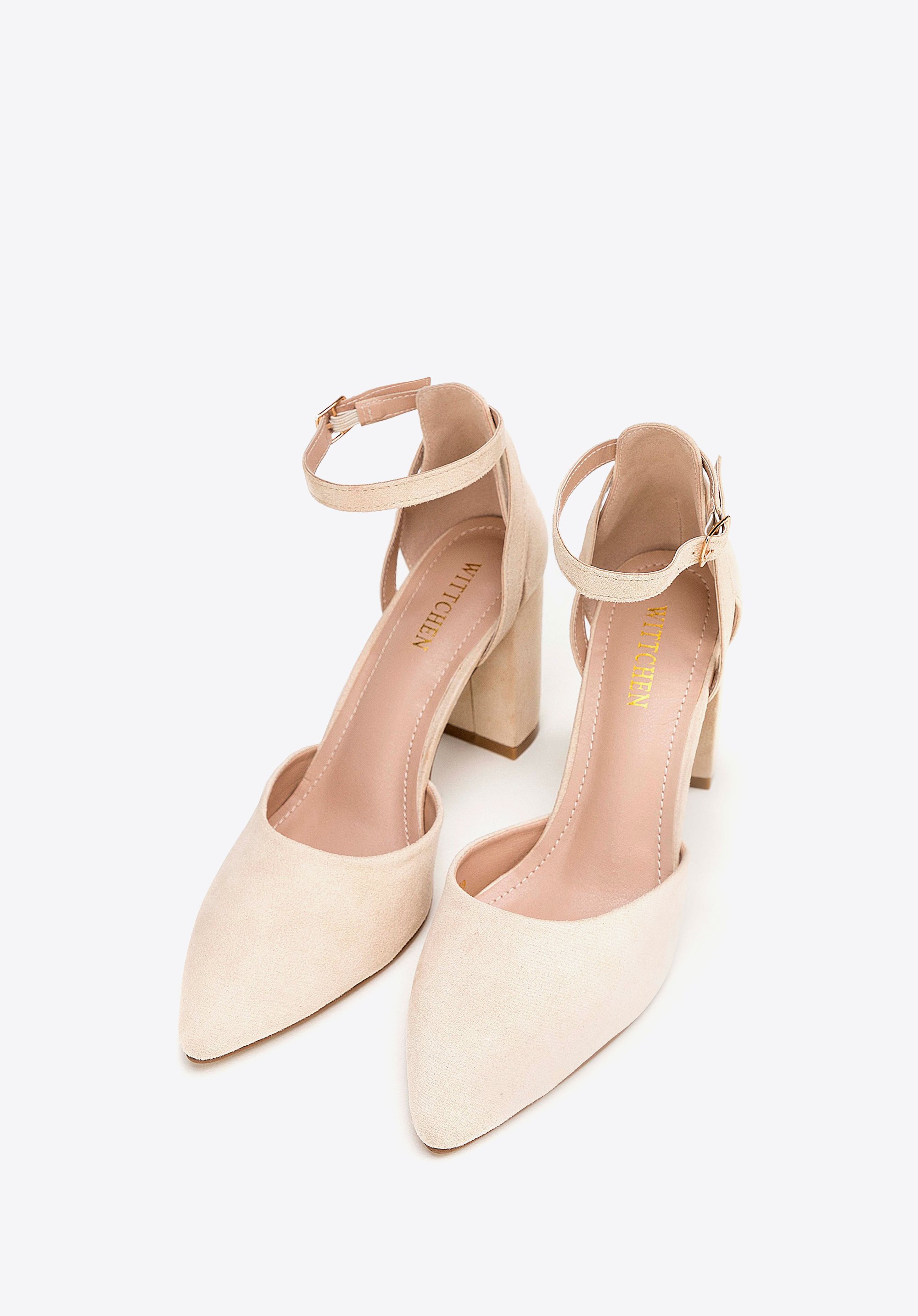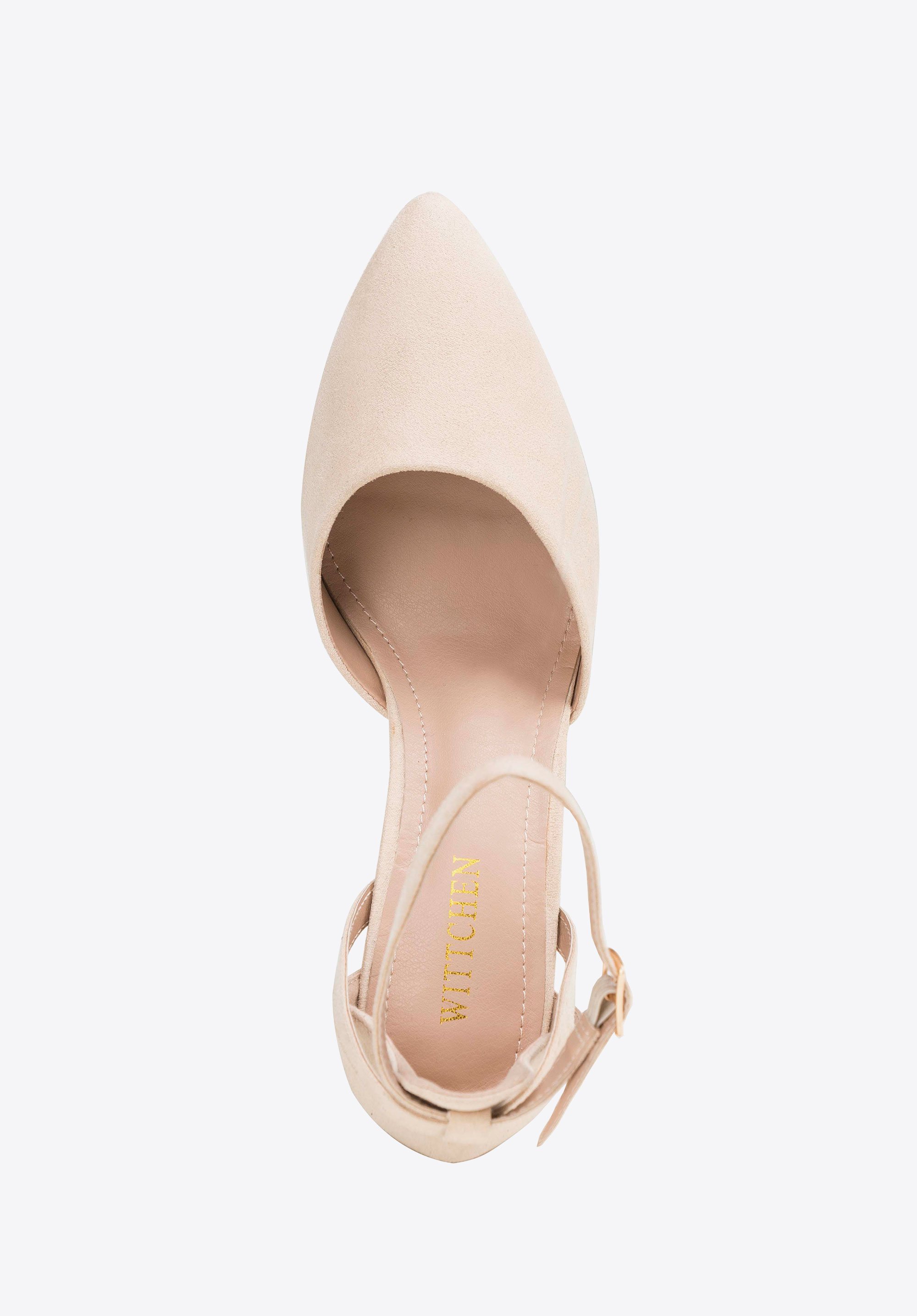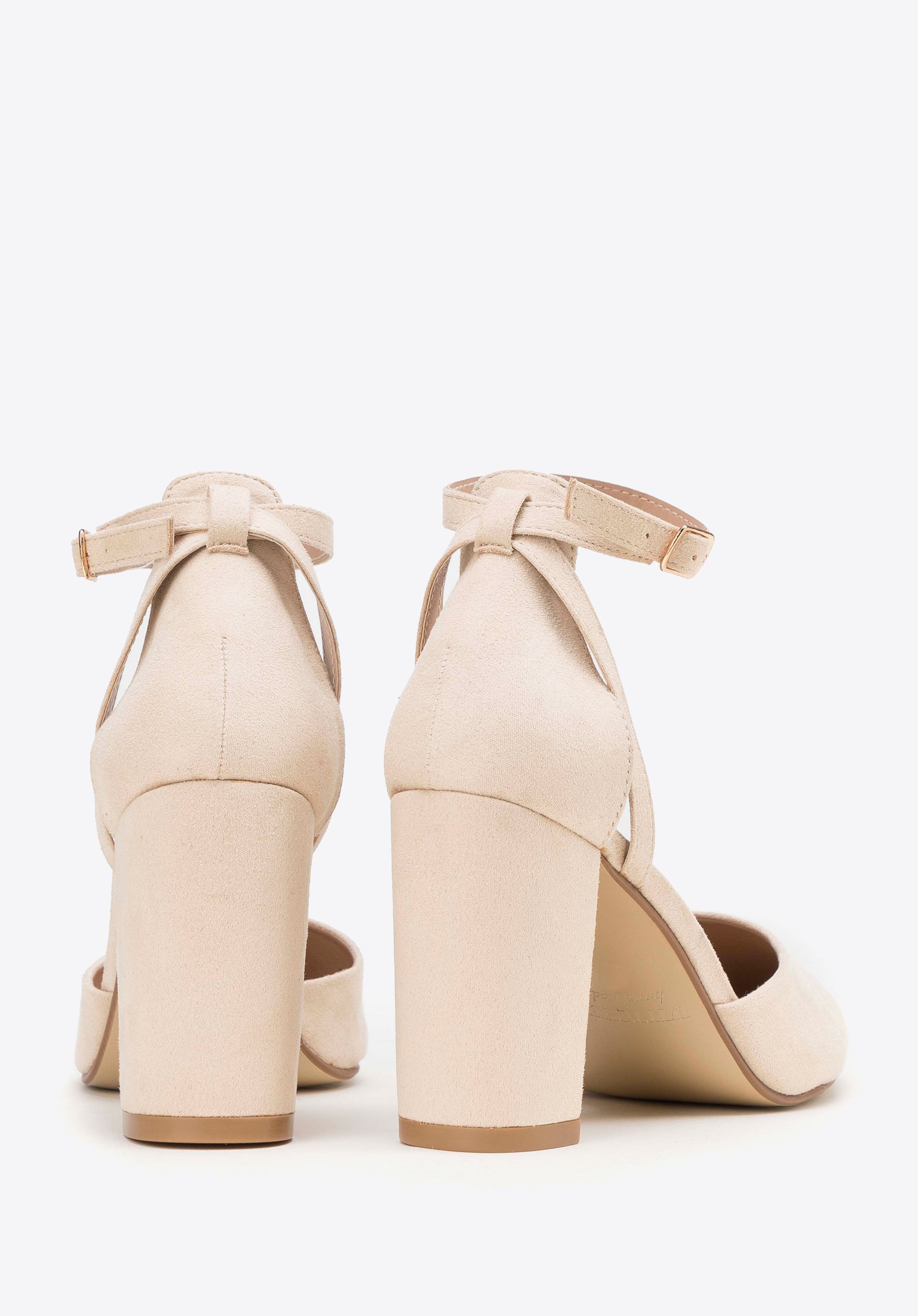 Damskie czółenka z ekozamszu na słupku beżowe