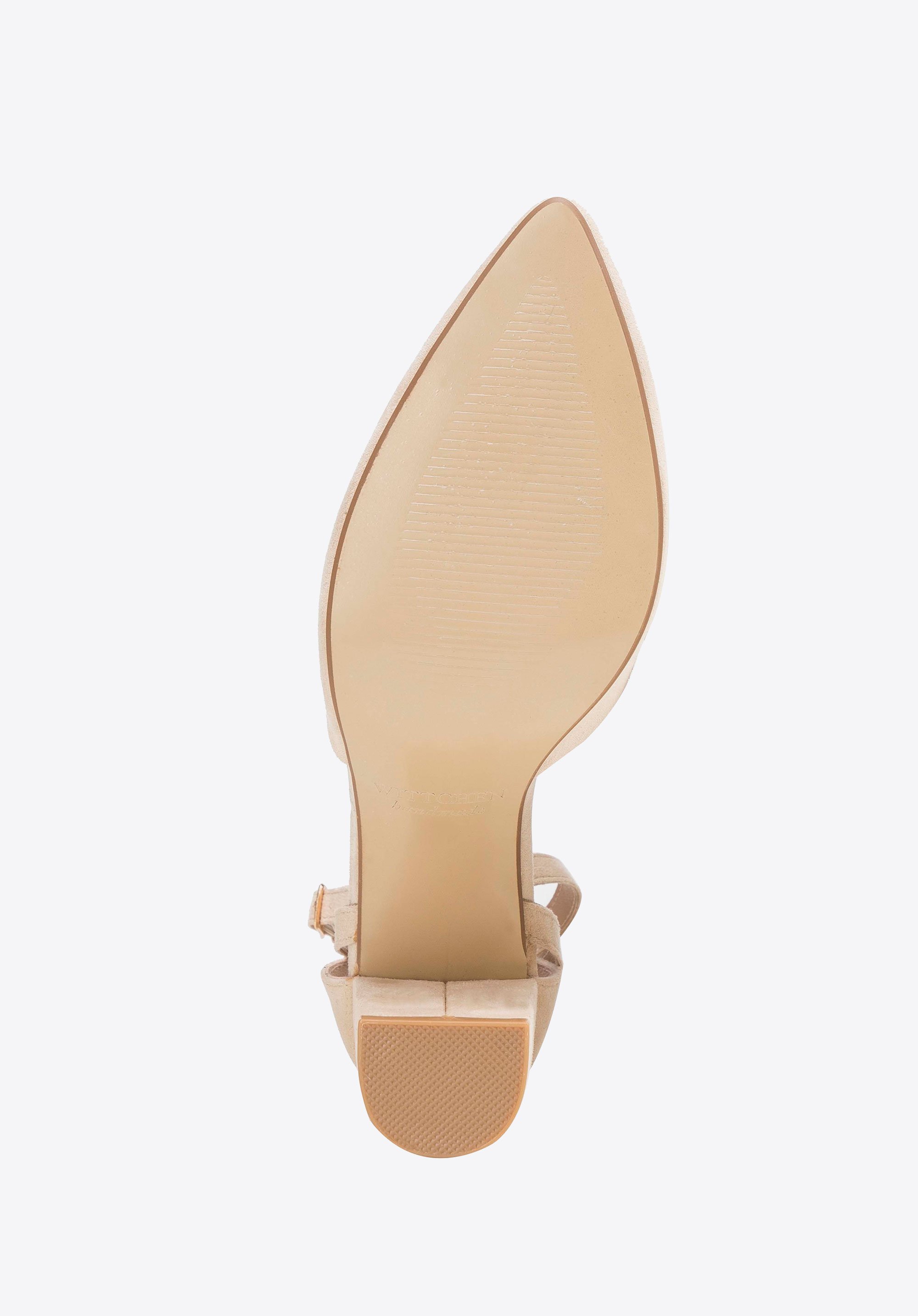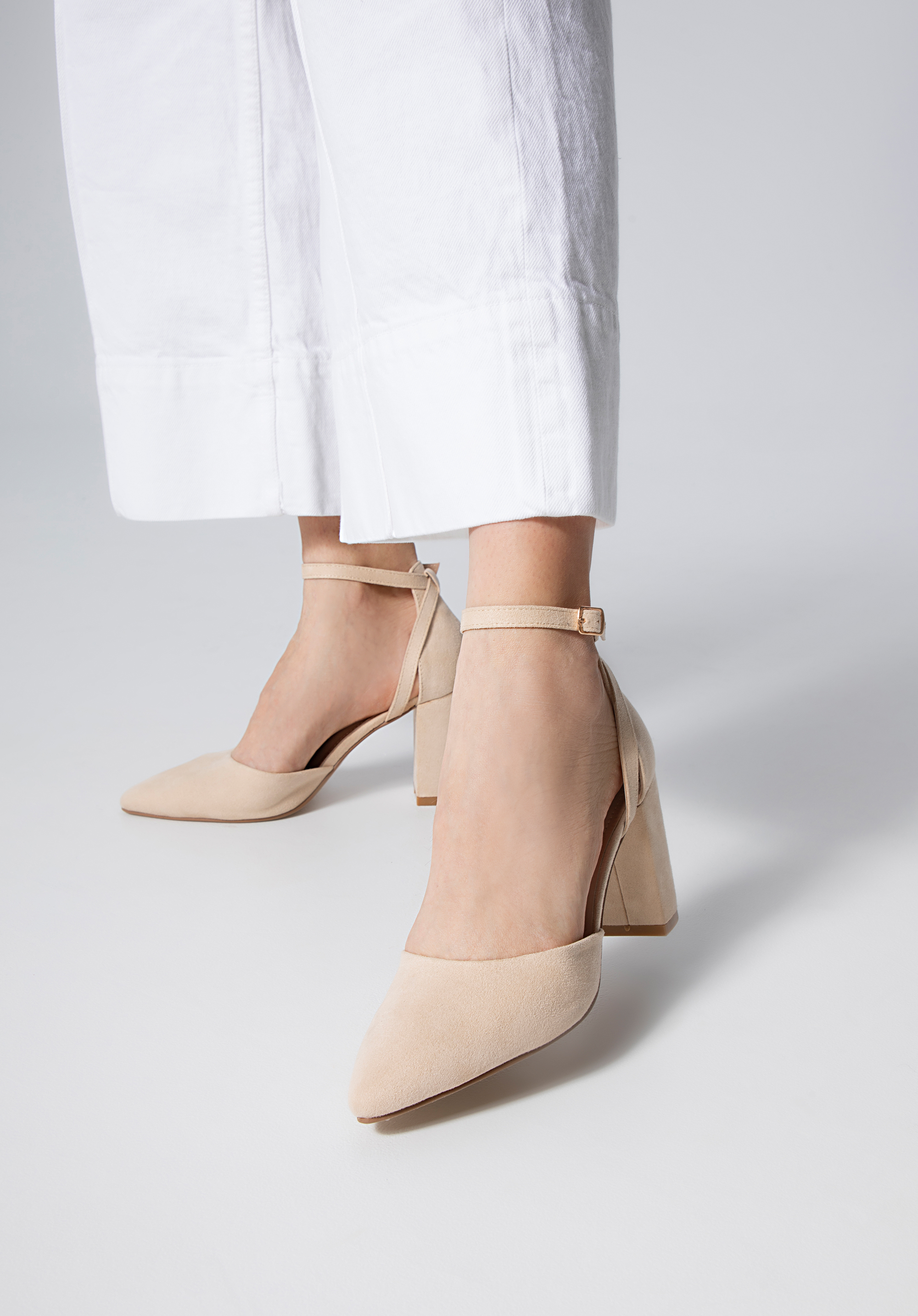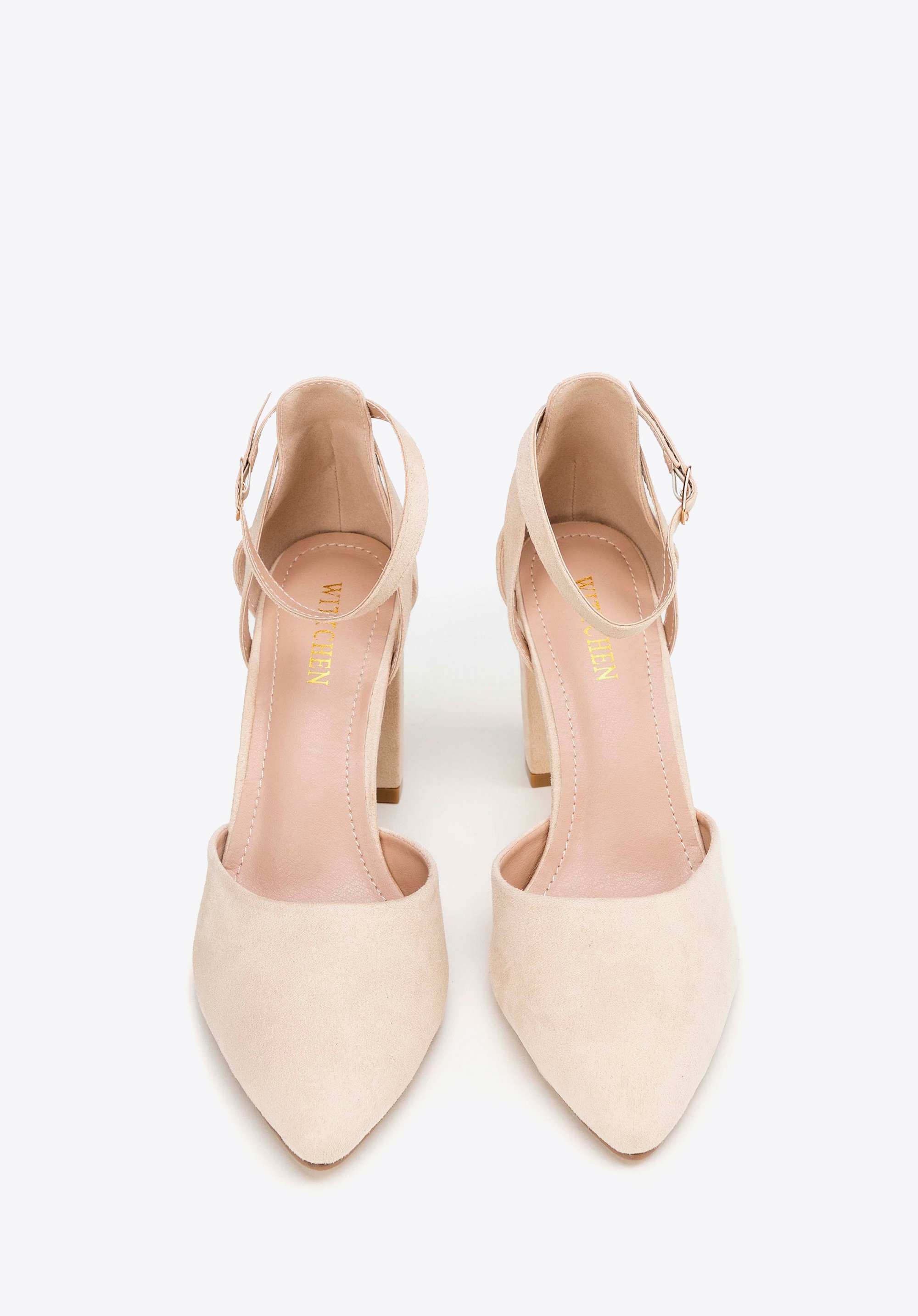 Damskie czółenka z ekozamszu na słupku beżowe