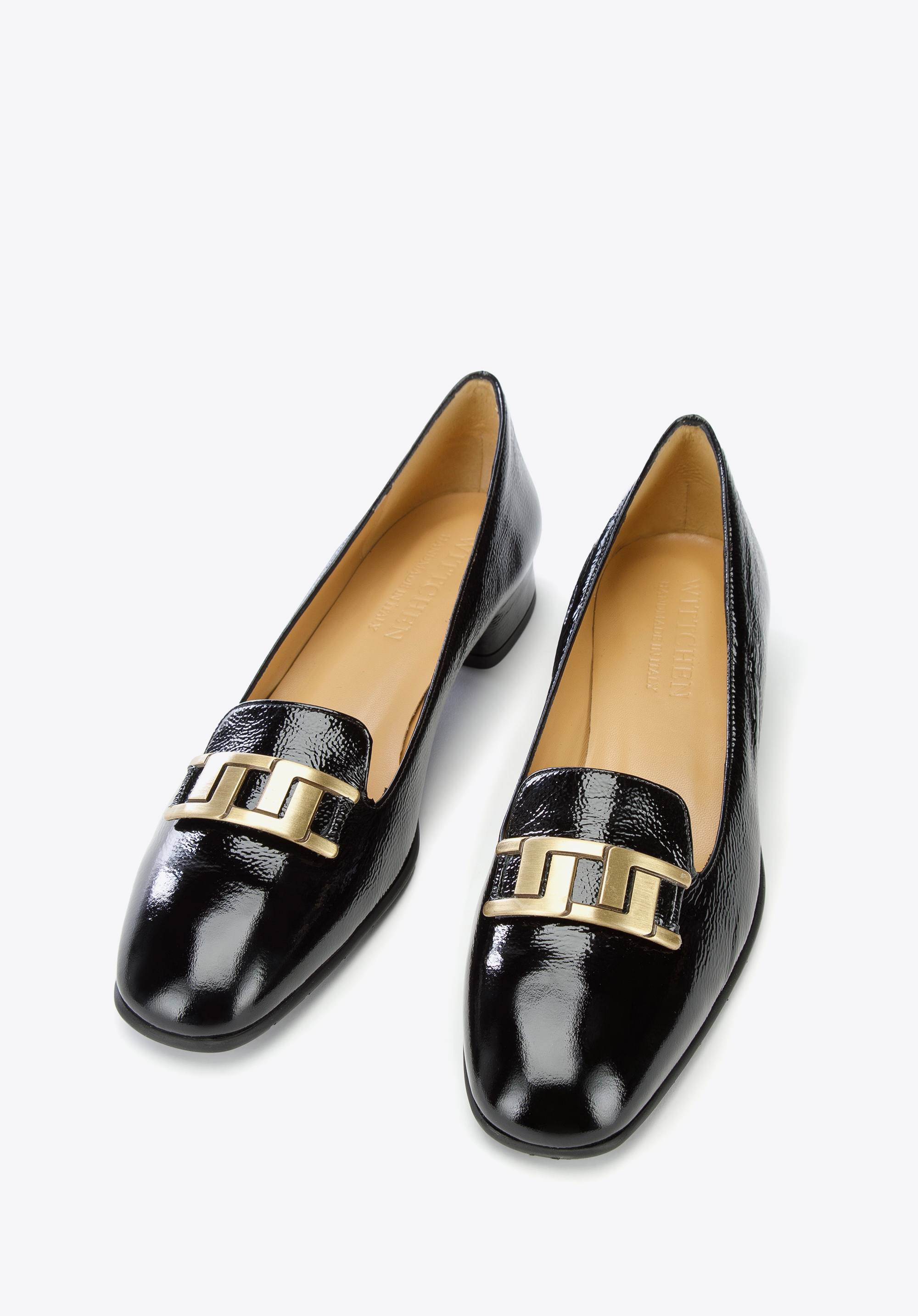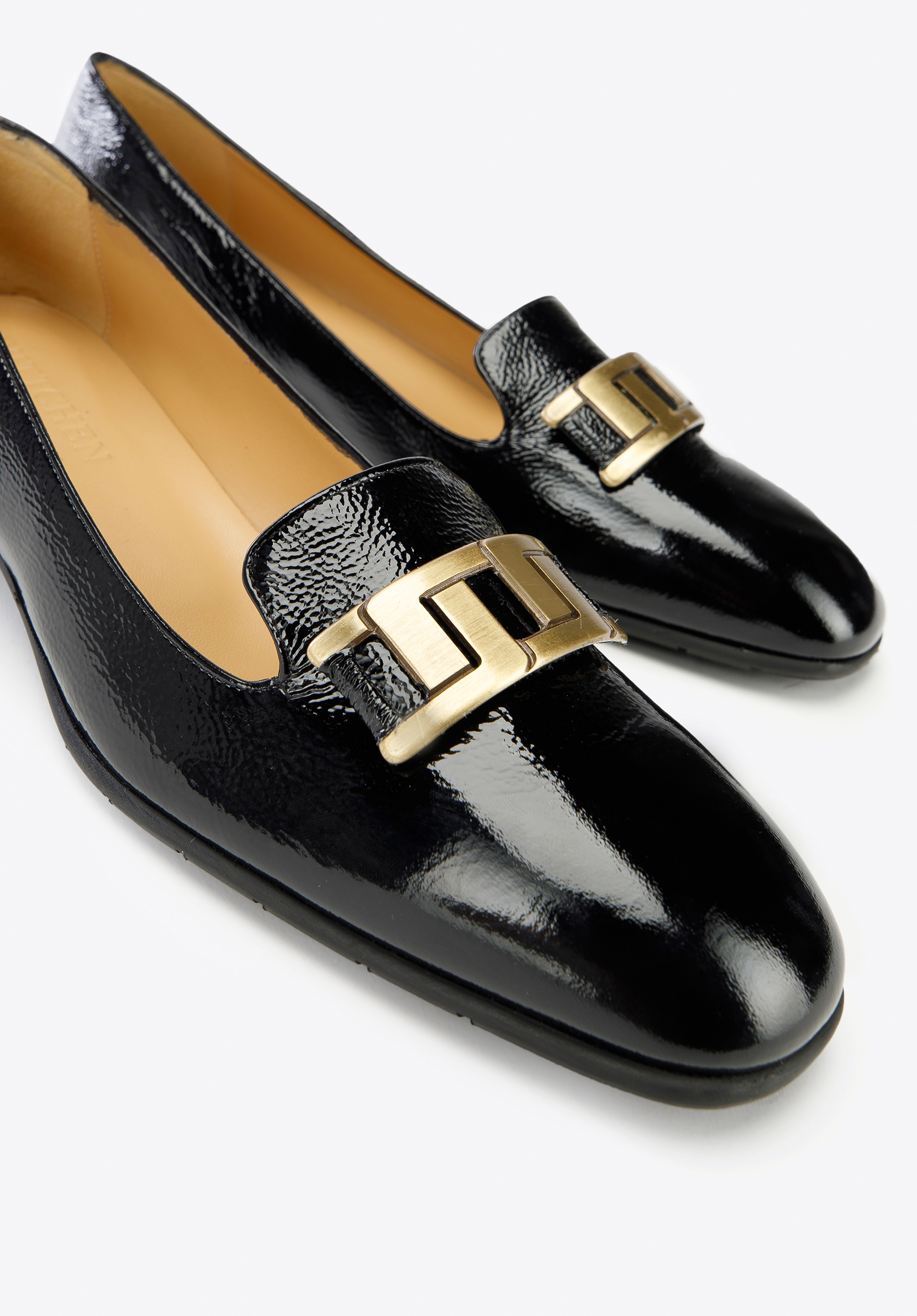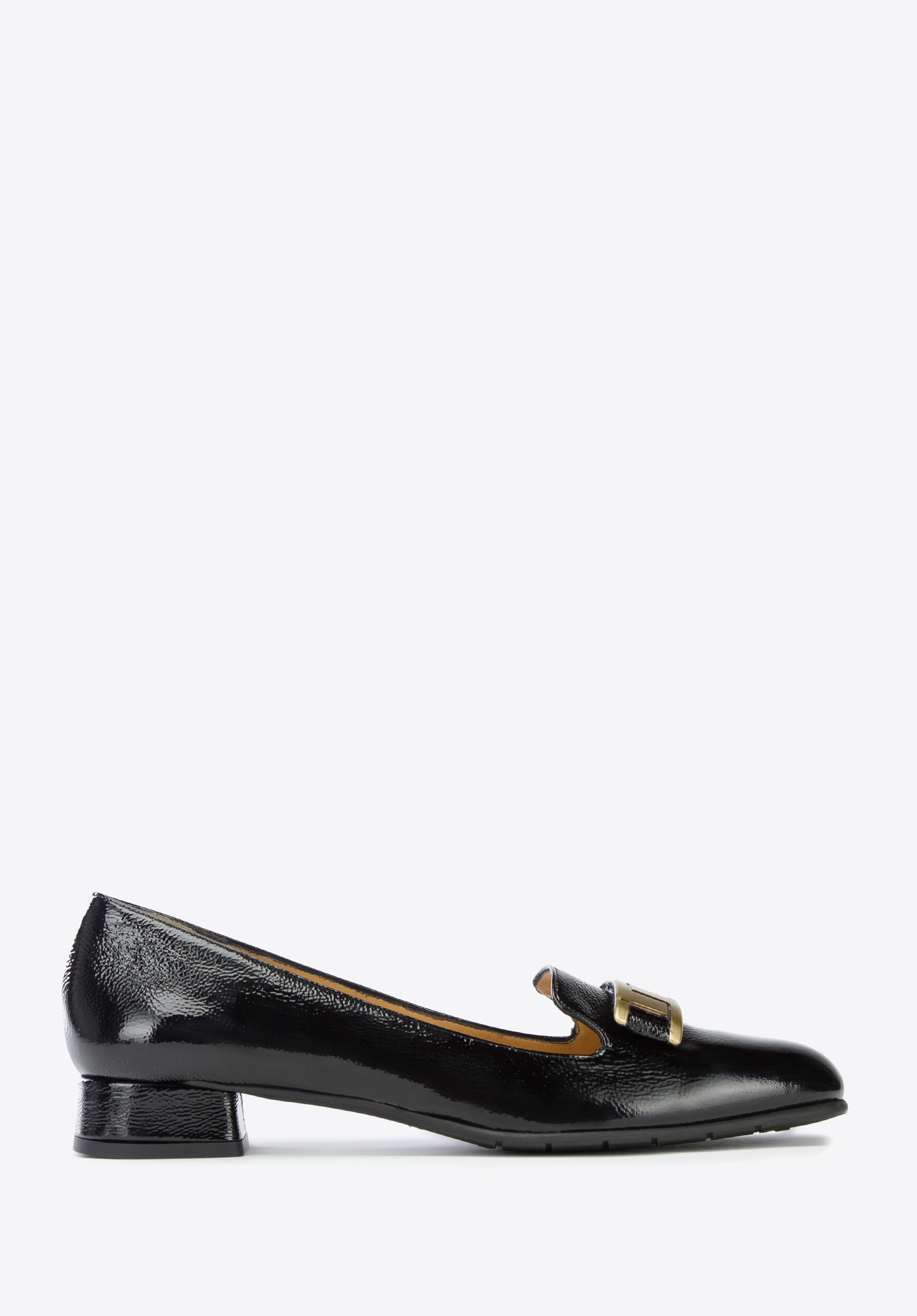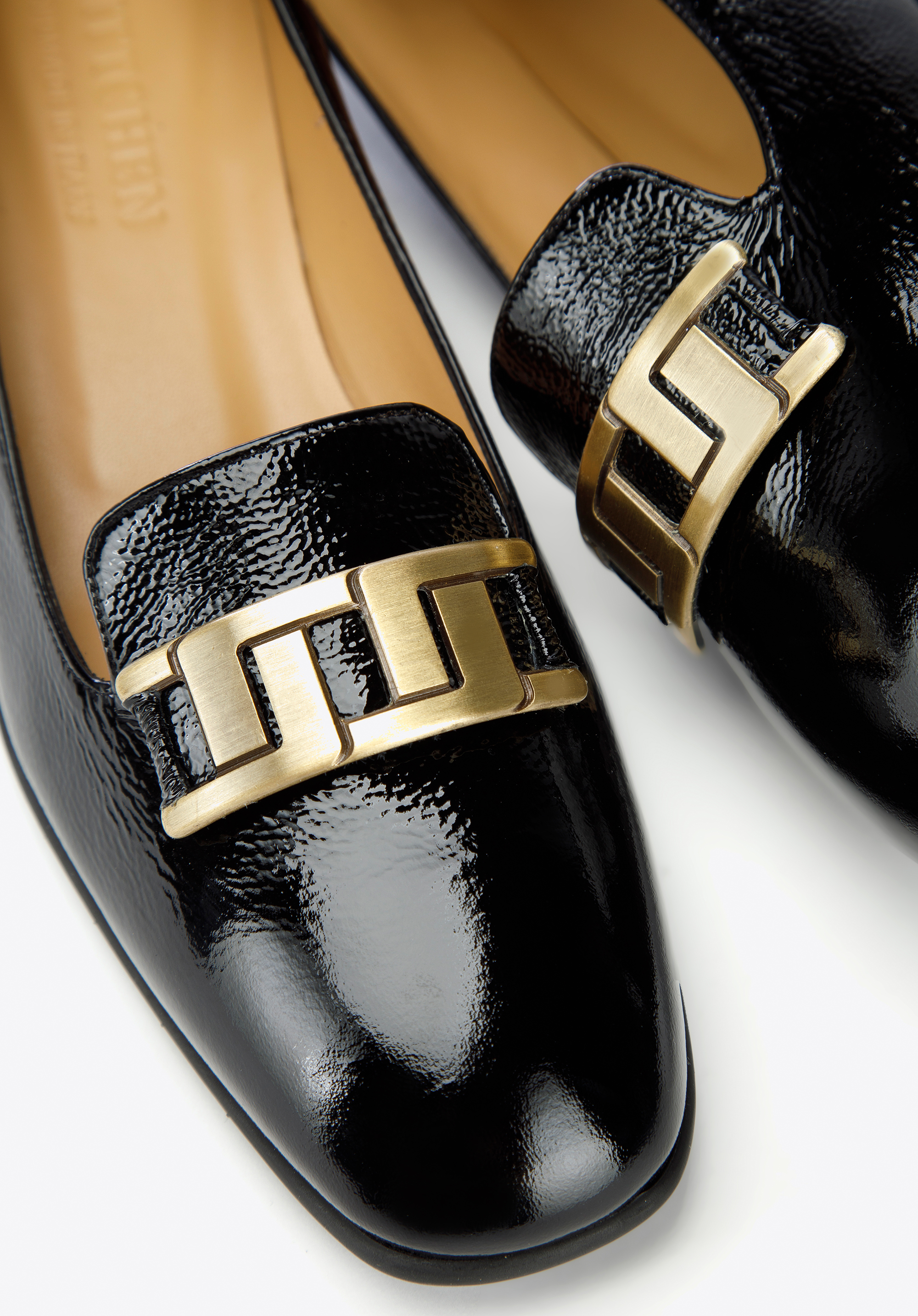 Damskie czółenka z lakierowanej skóry z geometryczną ozdobą to modne dopełnienie stylizacji każdej szykownej kobiety.