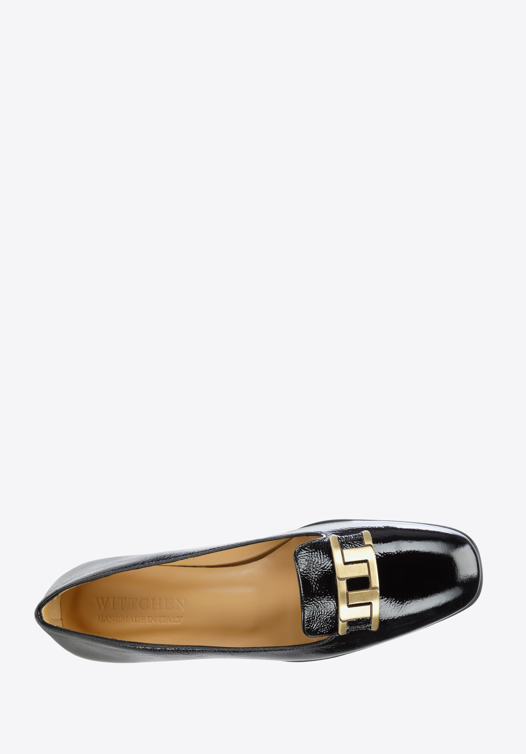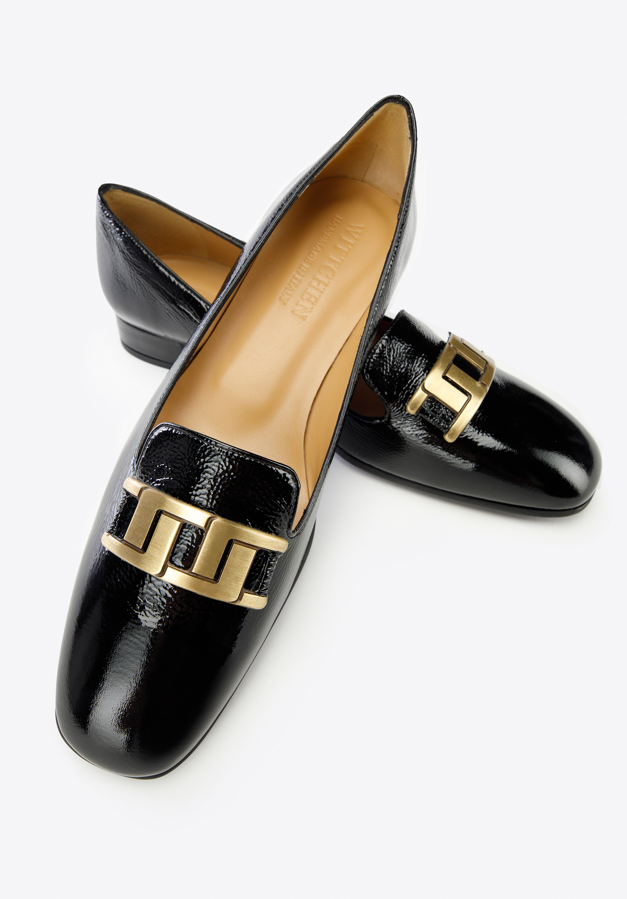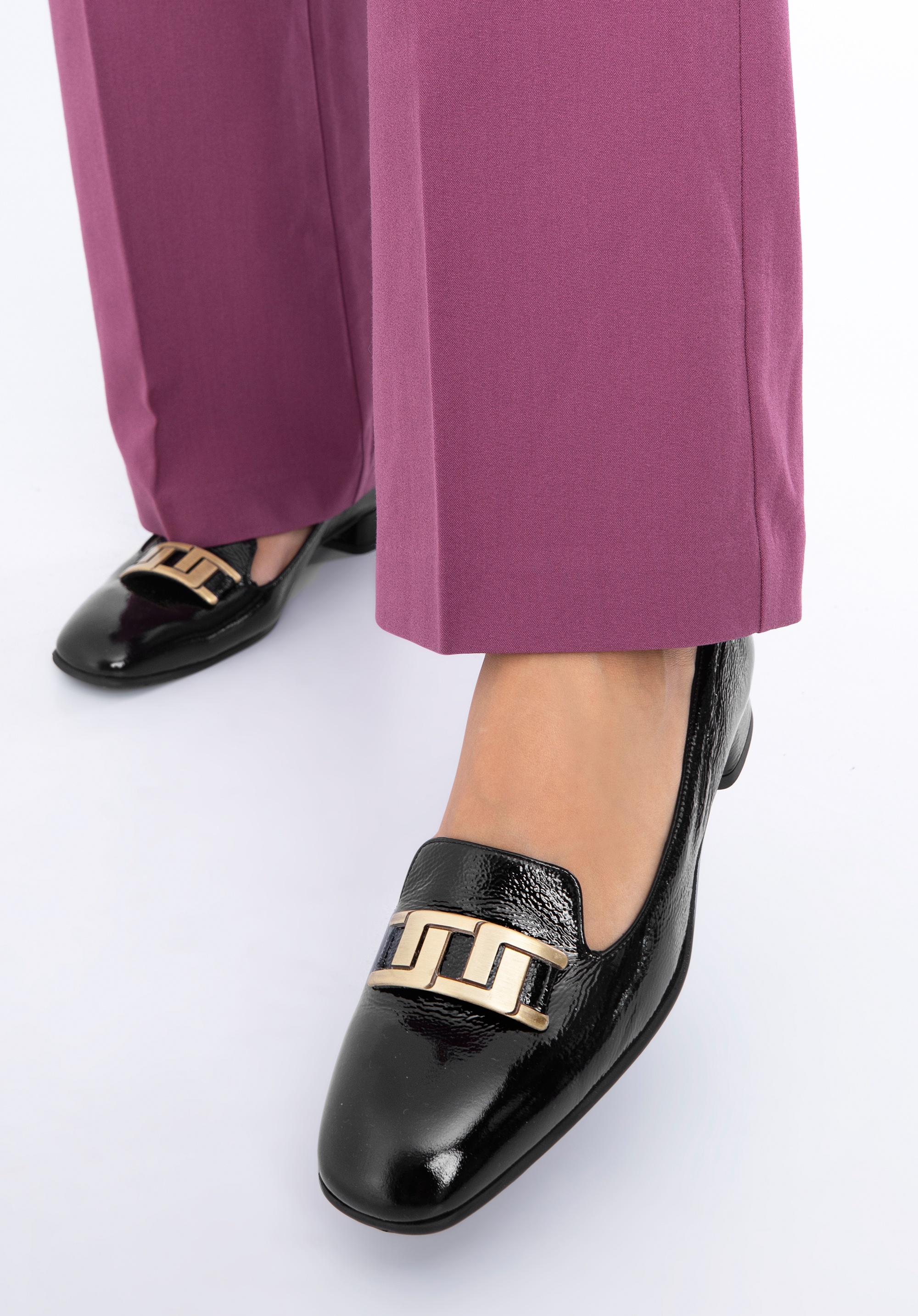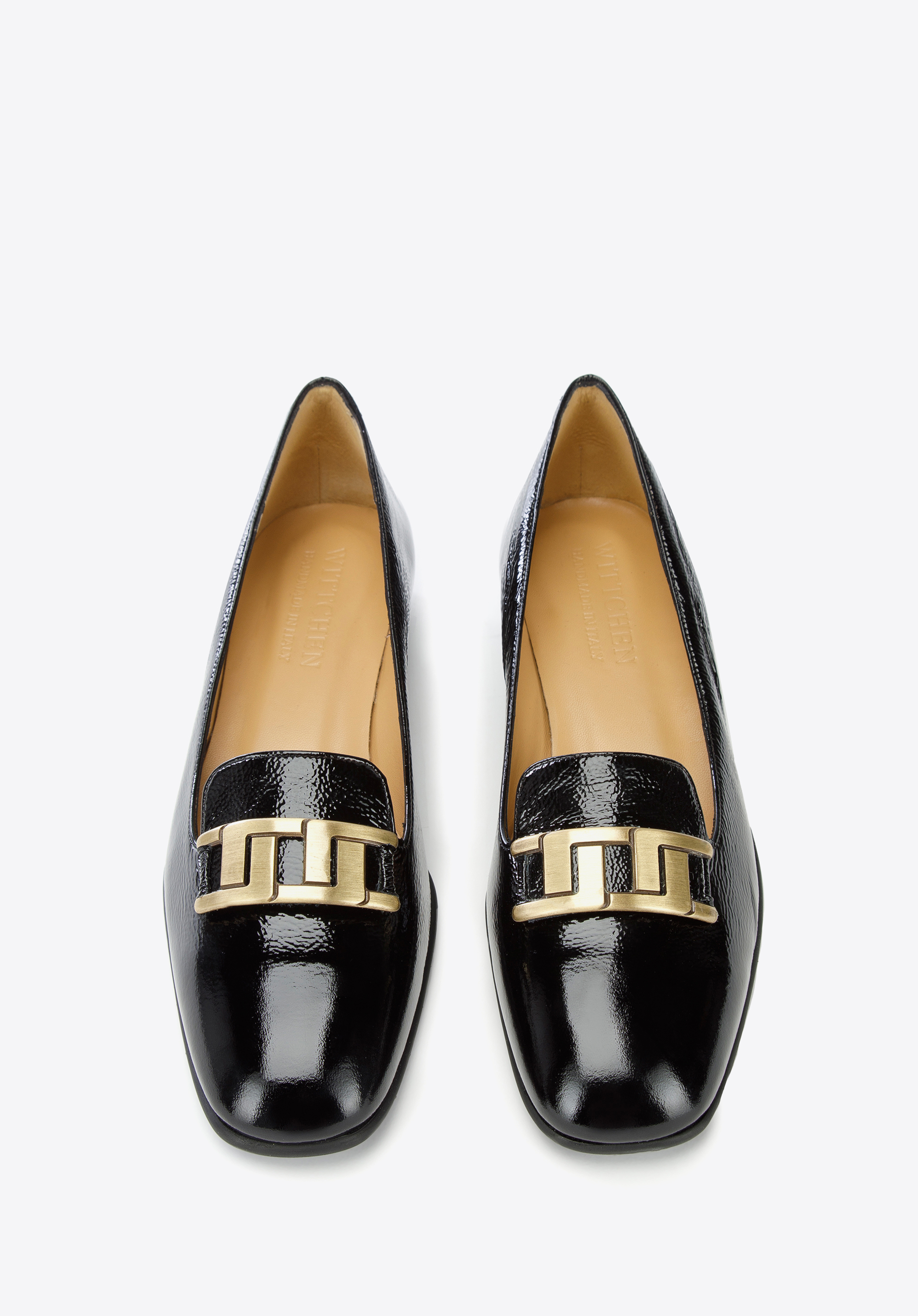 Damskie czółenka z lakierowanej skóry z geometryczną ozdobą to modne dopełnienie stylizacji każdej szykownej kobiety.