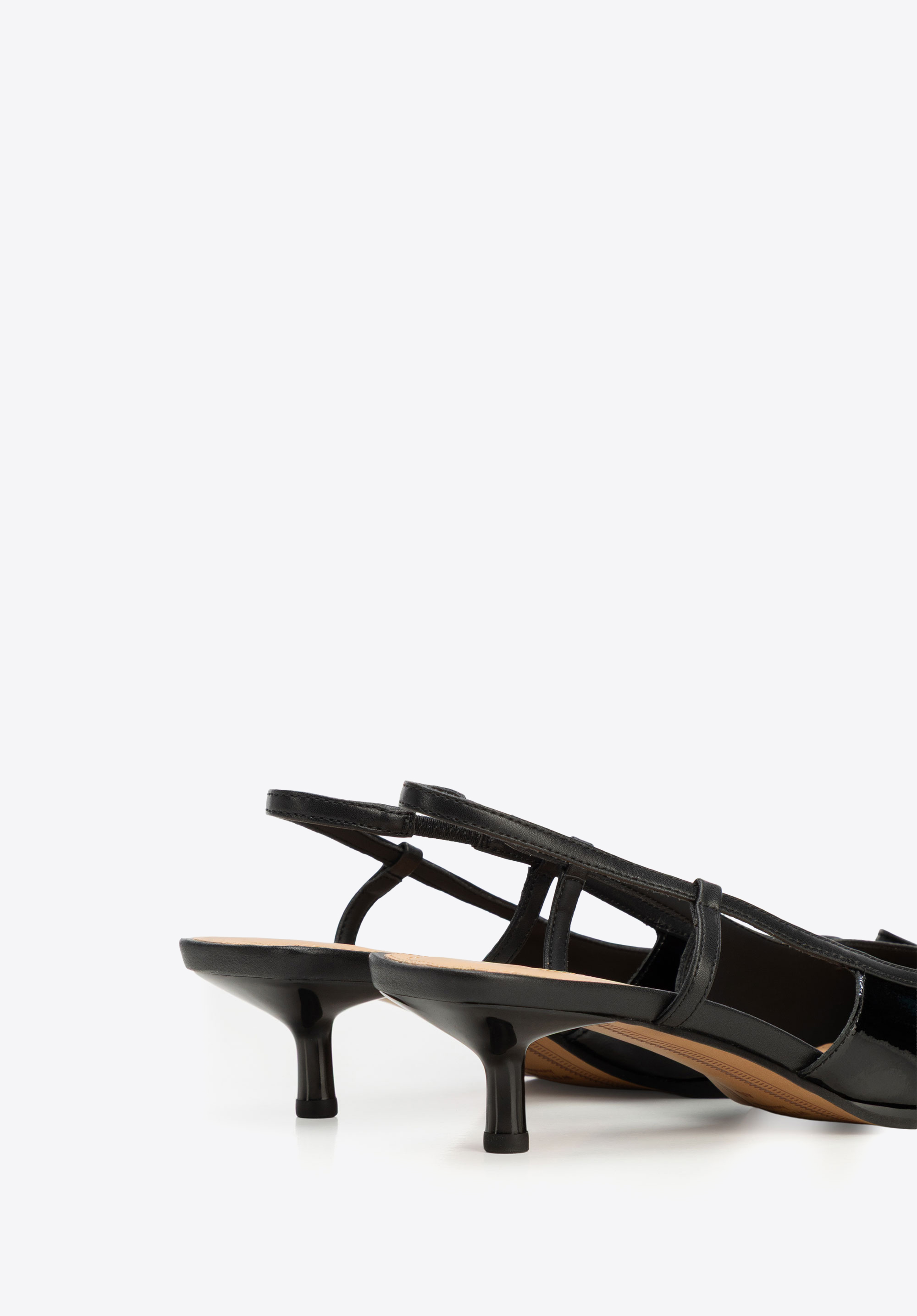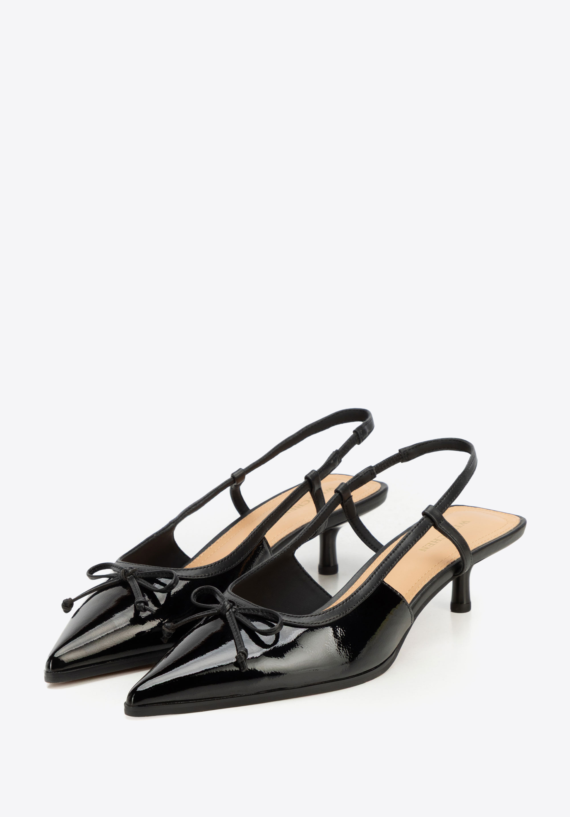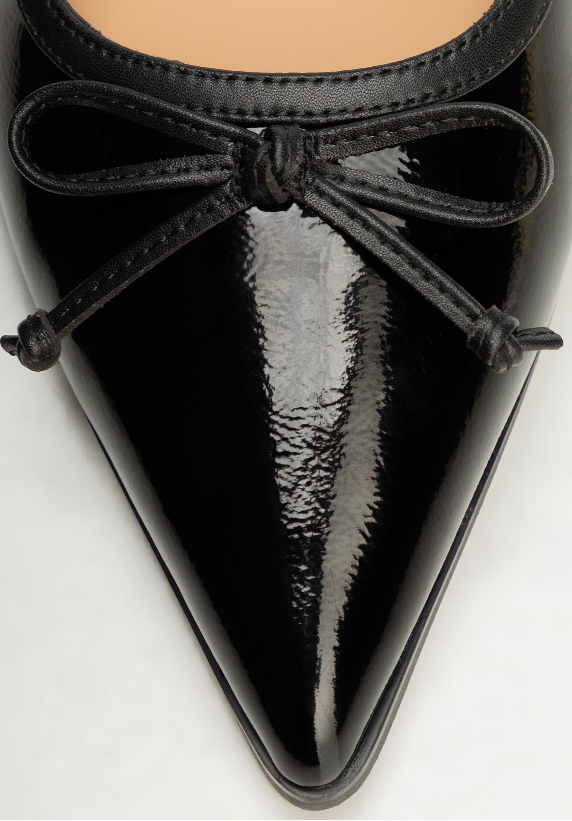 Poznaj czółenka ze skóry naturalnej, które dodadzą Twoim stylizacjom klasy i szykownego blasku. Lśniące, lakierowane wykończenie pięknie odbija światło, przyciągając uwagę i podkreślając wyjątkowy charakter modelu. Subtelna kokarda na froncie dodaje im delikatności, a odkryta pięta w połączeniu z elastycznym paskiem przy kostce zapewnia idealne dopasowanie i stabilność podczas chodzenia. Zgrabny nosek w szpic podkreśla elegancję sylwetki, a niski obcas typu kaczuszka lekko unosi stopę, gwarantując wygodę przez cały dzień. To model stworzony dla kobiet ceniących klasykę podaną w nowoczesnym, pełnym wdzięku stylu.