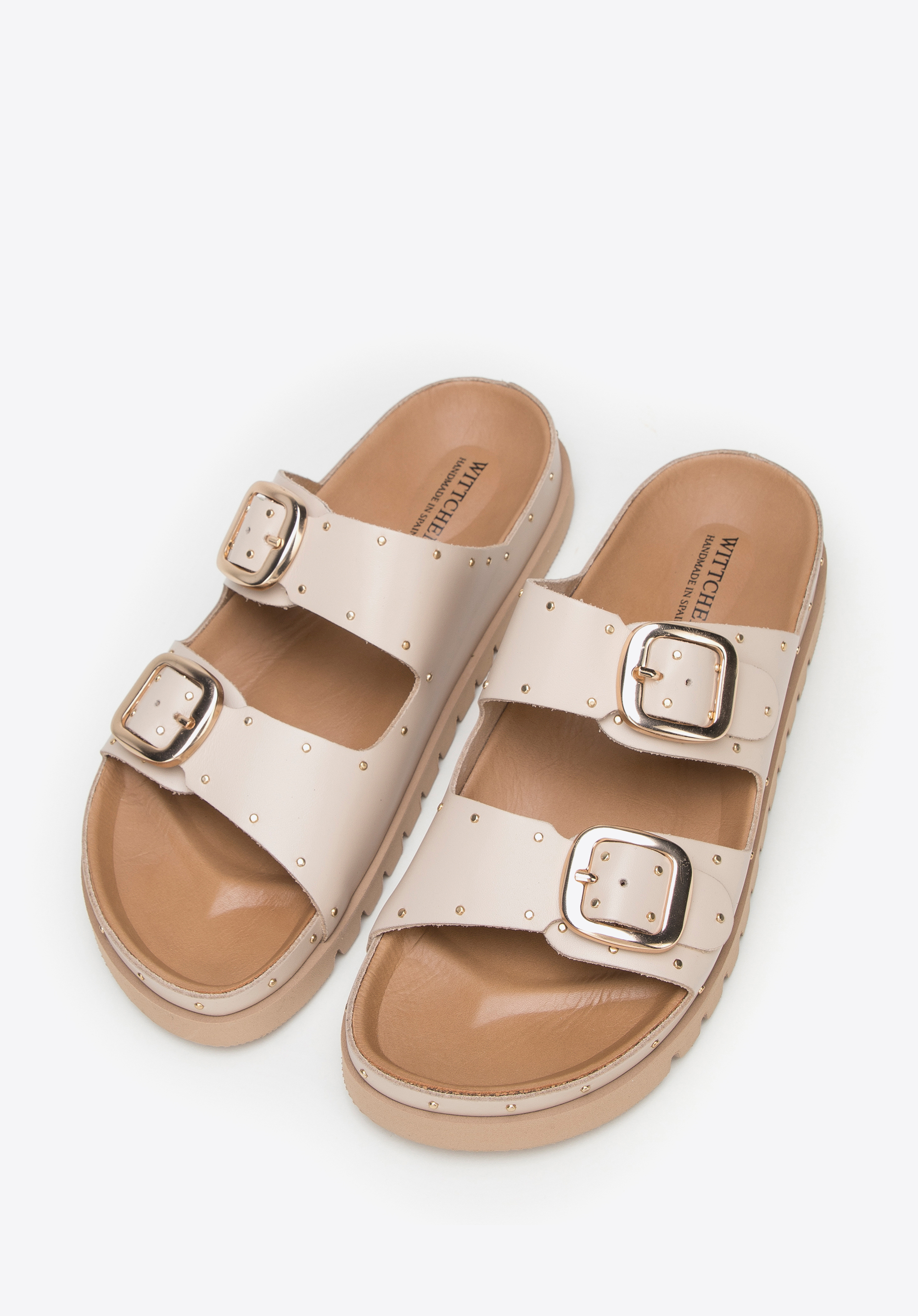 Wykonane zostały w Hiszpanii z wysokiej jakości skóry naturalnej. Zdobią je