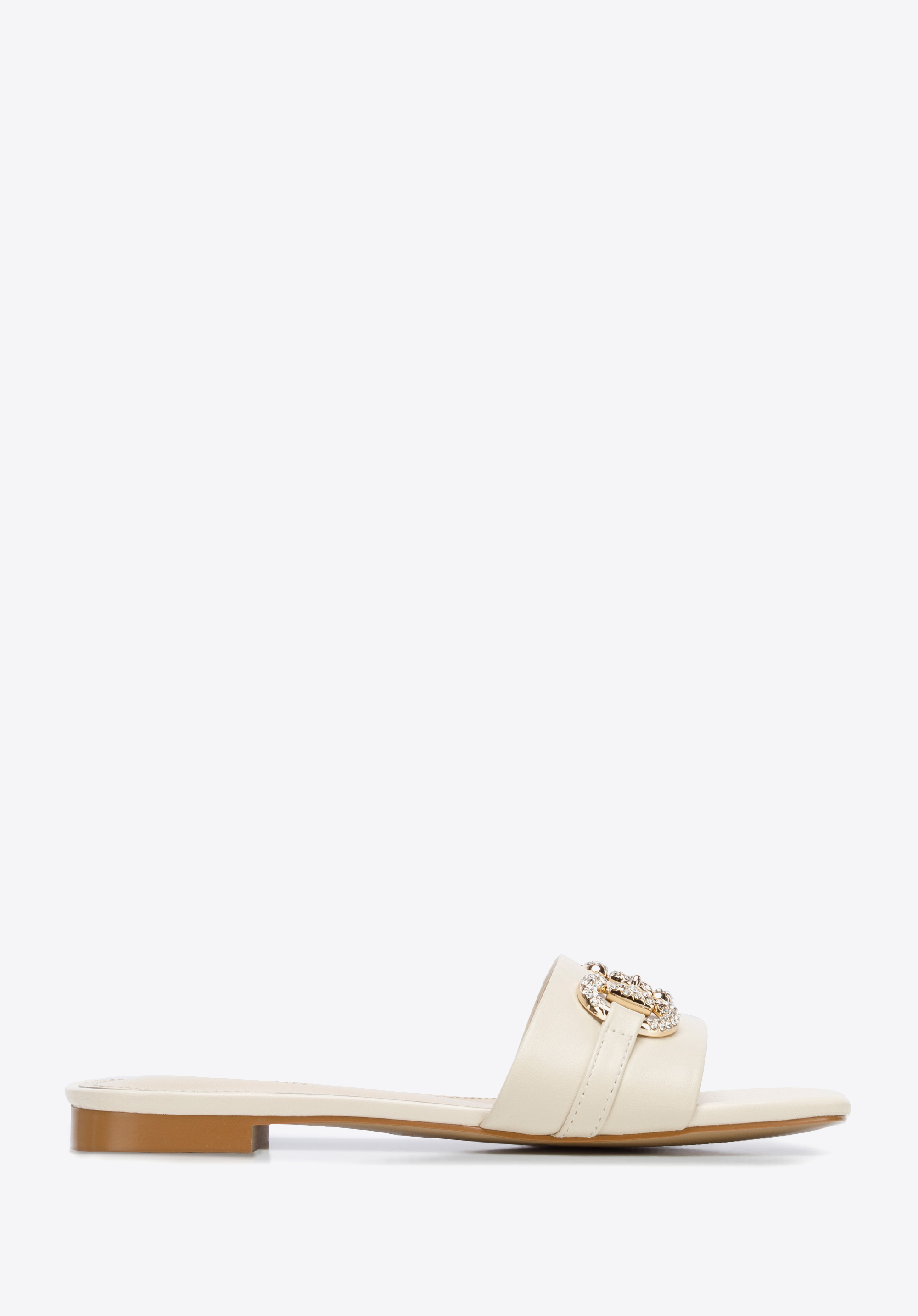 Damskie klapki skórzane z połyskującą klamrą kremowe
