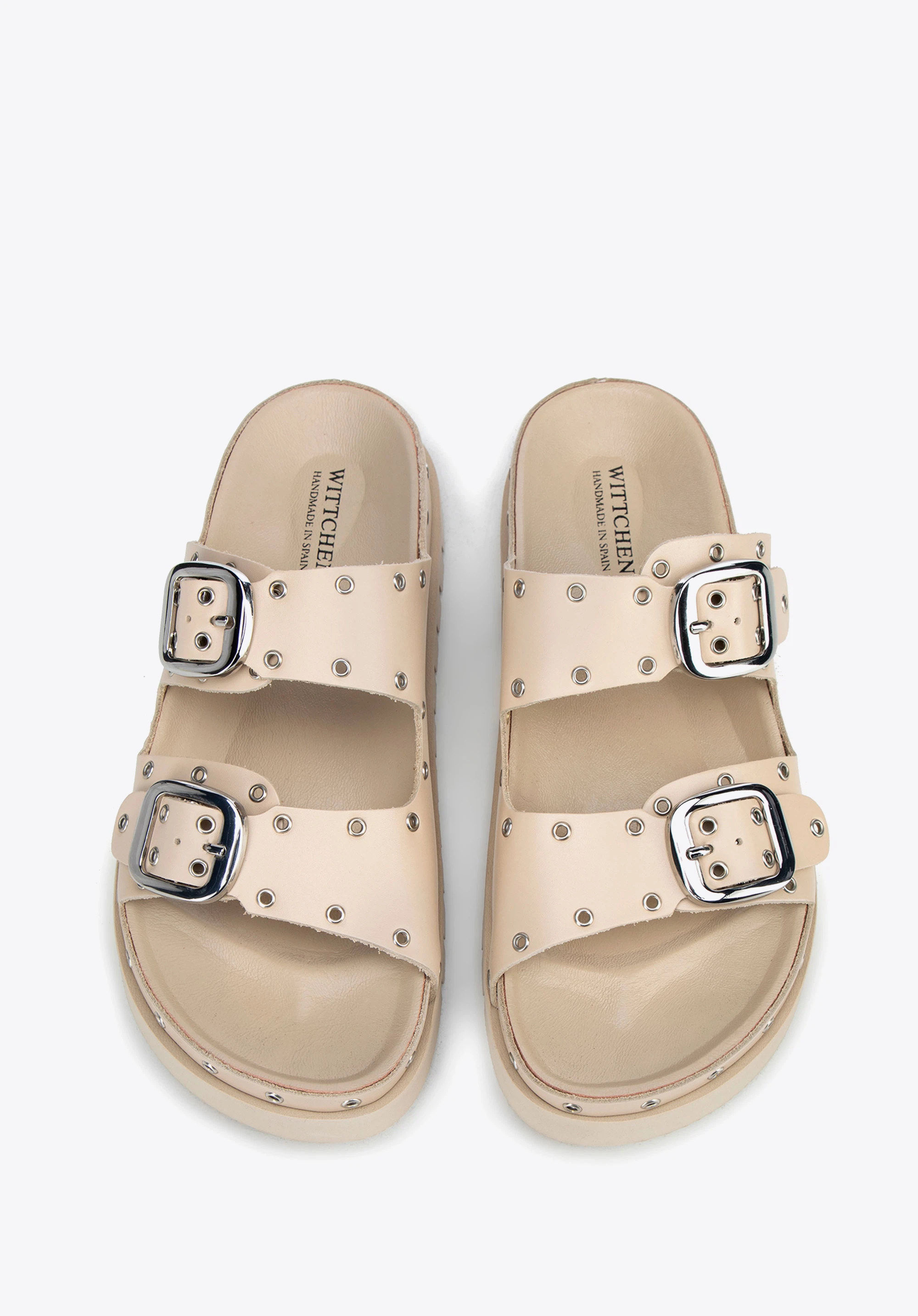 Damskie klapki ze skóry z metalowymi detalami beżowo - srebrne