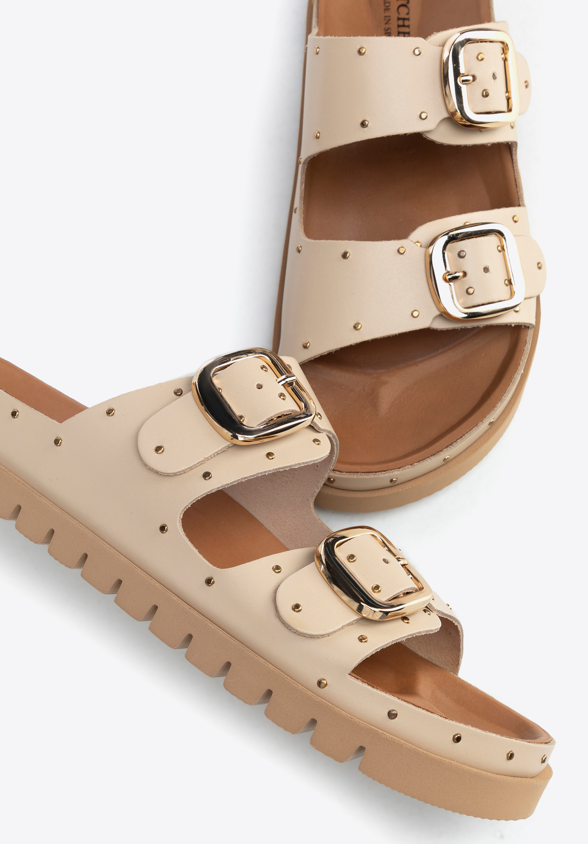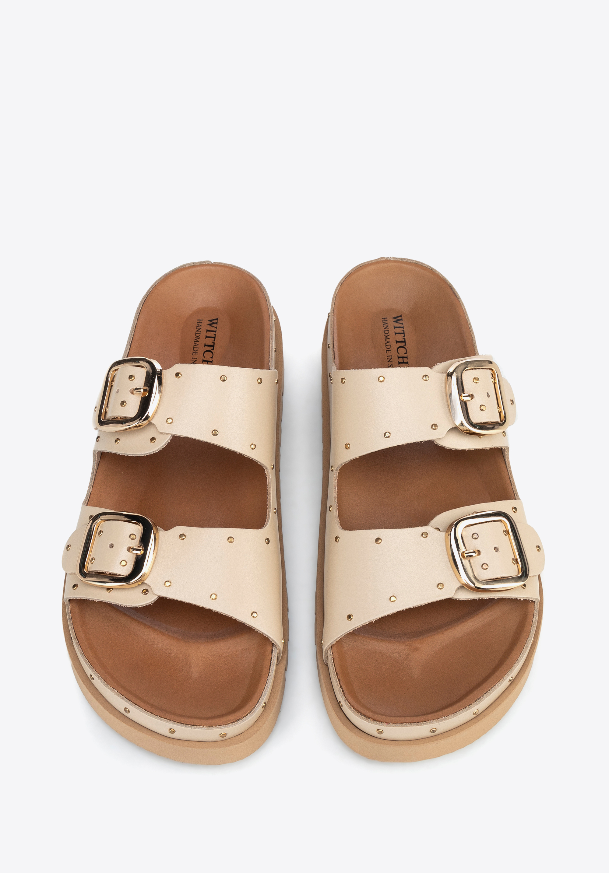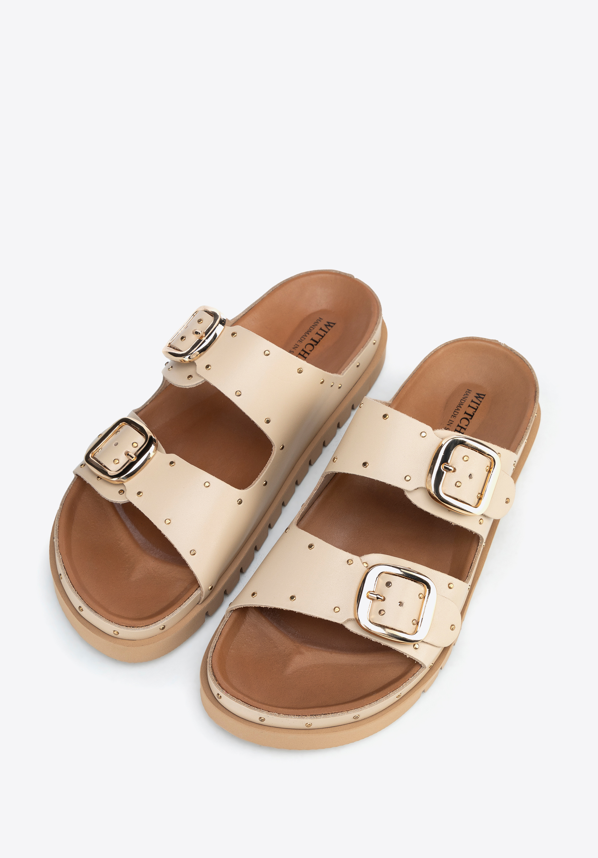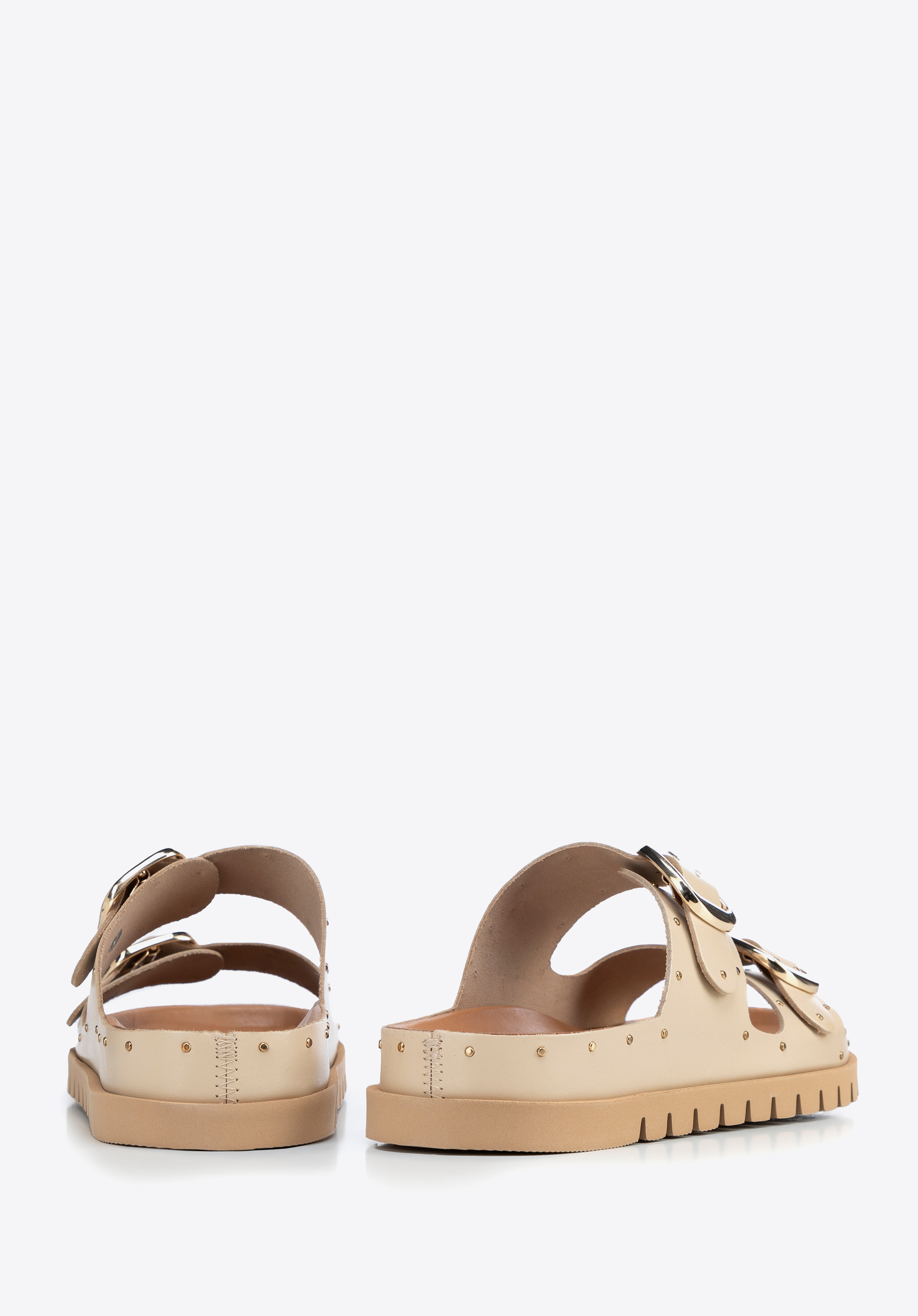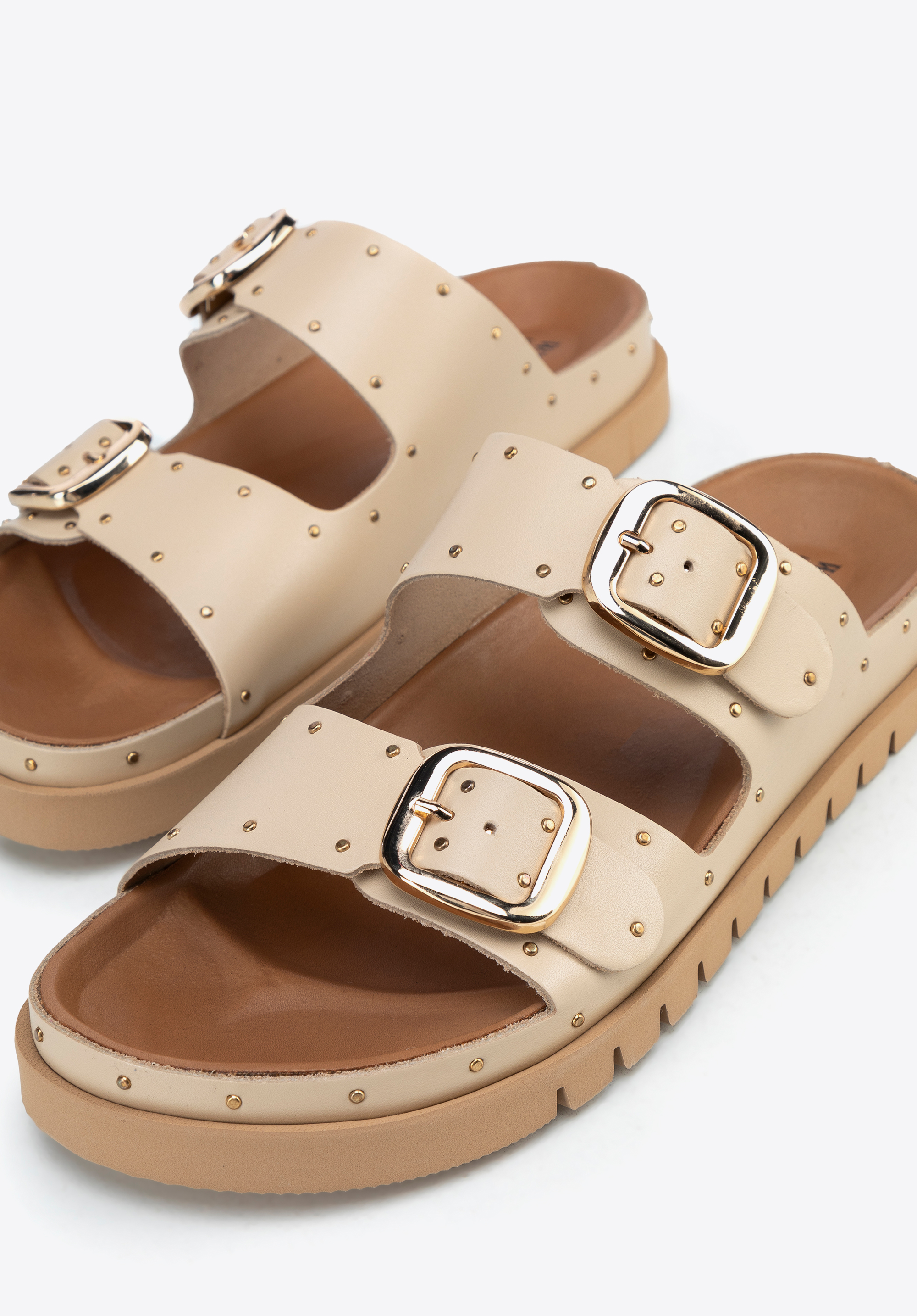 Damskie klapki ze skóry z nitami będą idealne na lato w mieście i na wyjazdach, gdy chcesz połączyć wygodę z wyrazistym akcentem w stylizacji. Skóra licowa, regulowane sprzączki i stabilna platforma zapewniają dopasowanie i komfort, a metalowe nity dodają charakteru bez przesady.